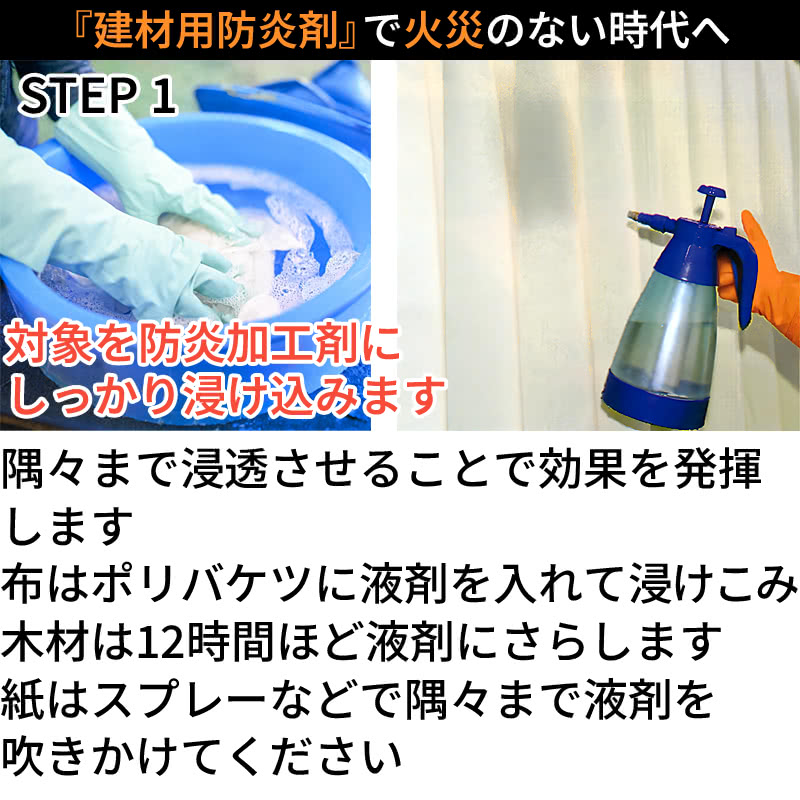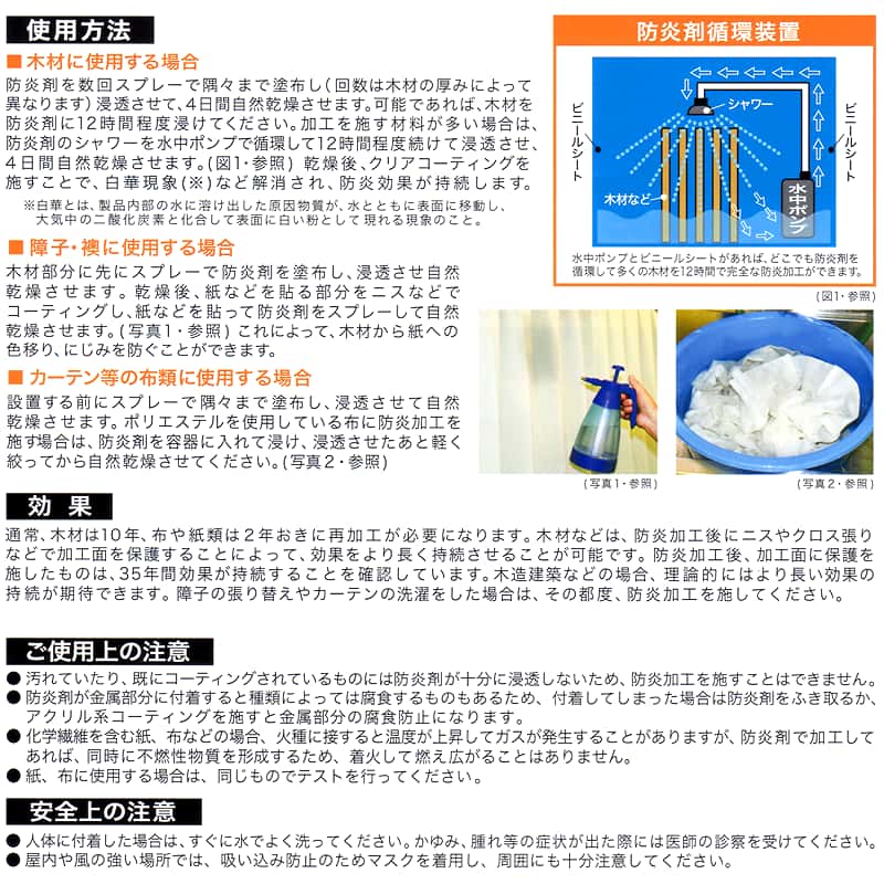 ![]() ![]() ![]() ![]() 火災から命と財産を守る建材用防炎剤 燃えなくなる素材に変換。「建材用防炎剤」の特許の最大の特長は、木材を燃えなくすることはもちろん、永続的に効果を持続することです。 建材用防炎剤の効果と使い方 建材用防炎剤は、木材、紙、布といった素材に浸透させることで、火災リスクを大幅に低減する製品です。この防炎剤を使用することで、万が一の火災発生時に火が広がるのを抑え、家庭や建築物の安全性を高めることができます。防炎効果の持続力が長く、消防庁や総務省からも推奨されているため、安心して使用できる防災対策の一環となります。 ■防炎剤の特長 1. 無色・無臭で素材の見た目を変えない 防炎剤は無色無臭で、水のような透明な液体です。素材の見た目や手触りを変えないため、木材や布、紙などのインテリアに使用しても違和感がありません。例えば、住宅の木造部分にスプレーすることで、火元に触れても炎が出にくくなり、家全体の防災性が向上します。 2. 浸透力が高く、火災時の炎の拡散を防止 防炎剤は浸透力が高く、素材の内部にしっかりと染み込みます。そのため、火種に接しても燃え広がりを抑えることができ、火災による被害を最小限に抑えます。例えば、カーテンや布製品に使用すると、火が付いても燃え広がりにくくなり、安心して使用できる環境が整います。 3. 長期間効果が持続し、再加工も簡単 防炎剤の効果は木材で約8年、布や紙で約2年と長持ちします。さらに、ニスやコーティングで保護すれば、木材の場合30年以上にわたって防炎効果が持続します。効果が薄れたときには、再度スプレーで簡単に加工し直すことができ、継続して防災性を確保できます。 障子の張り替えやカーテンの洗濯をした場合は、その都度、防炎加工を施してください。 【使用方法】 1. 防炎剤をスプレー容器に移し替え、対象物にスプレーします。対象物が濡れるまで隅々に浸透させてから乾かします。 2. 防炎剤を塗布用の容器に移し替え、対象物に塗布します。隅々まで浸透させてから乾かします。 3. 防炎剤を容器に移し替えて浸漬し、十分に浸透させた後、乾かします。 木材への使用例 木造建築の木材部分に建材用防炎剤をどんな形状でもスプレーし、濡れるまで十分に浸透させてから3日~4日ほど乾燥させます。乾燥後、火種に接しても炎が出て燃え広がる可能性は95%以上抑えられます。防炎剤が希釈されない限り、効果は8年を目安とし、再加工を行います。効果をさらに長持ちさせるためには、コーティングやグロスで保護することを推奨します。希釈を防げば、30年~70年程度、長期的な防炎効果が期待できます。100mmや1000mmなど、大小どんな大きさや形状であっても加工方法は変わりません。 可能であれば、木材を防炎剤に12時間程度浸けてください。加工を施す材料が多い場合は、防炎剤のシャワーを水中ポンプで循環して12時間程度続けて浸透させ、4日間自然乾燥させます。(図1・参照) 乾燥後、クリアコーティングを施すことで、白華現象(※)などを解消し、防炎効果が持続します。 ※白華とは、製品内部の水に溶け出した原因物質が、水とともに表面に移動し、大気中の二酸化炭素と化合して表面に白い粉として現れる現象のこと。 注意 木材が汚れていたり、コーティングなどがあり、防炎剤が充分浸透しない物は防炎加工はできません。 防炎剤が金属部分に付着すると腐食の原因となる場合がありますので、付着した部分は拭き取るか、乾いたらアクリル系コーティングなどしてください。腐食を防ぐことができます。 ![]() 水中ポンプとビニールシートがあれば、どこでも防炎剤を循環して多くの木材を12時間で完全な防炎加工ができます。 紙材への使用例 障子、襖、壁紙などの室内内装材にも使用可能です。どんな形状でもスプレーで隅々まで濡れるように浸透させ、自然乾燥させます。乾燥後、火種に接しても炎が出て燃え広がる可能性は95%以上抑えられますが、一部炭化する場合があります。 乾燥後、紙などを貼る部分をニスなどでコーティングし、紙などを貼って防炎剤をスプレーして自然乾燥させます。(写真1参照) これによって、木材から紙への色移り、にじみを防ぐことができます。 書類などには使用しないでください。また、布や紙材もスプレーで濡れるまで浸透させて乾燥させます。同様に、火種に接しても炎が出て燃え広がる可能性は95%以上抑えられ、一部炭化します。 ![]() カーテン等の布類への使用例 設置する前にスプレーで隅々まで塗布し、浸透させて自然乾燥させます。 ポリエステルを使用している布に防炎加工を施す場合は、防炎剤を容器に入れて浸け、浸透させたあと軽く絞ってから自然乾燥させてください。(写真2参照) ![]() 注意 紙材、布材などは同じ物で一部テストして加工し、十分に浸透するか確認してください。紙材、布材には化学繊維など含まれることがあり、化学繊維は、火種に接すると温度が上昇し溶解ガス