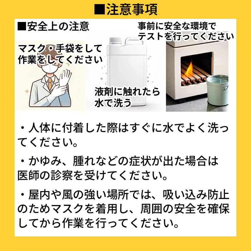 | ●アイヒーリング本店 公式 商品名:建材用防炎剤 1000ml けんざいよう ぼうえんざい 1リットル 特許取得済 防災グッズ 防災用品 難燃剤 iHealing bouenzai Flame retardant ●内容量:1L×1本 単品 ●特許:第6557375号 ●対応素材:木材・紙類・布類(あらゆる布繊維に対応) 天然繊維:綿・絹・麻 化学繊維:ポリエステル・アクリル・ウール ●販売店:アイヒーリング 正規販売店 ●用途・おすすめ:防火、火災防止、火の広がり防止、燃えない家づくり、新築およびリフォームのプロジェクトに使用、防火対策に関心のある住宅所有者、防災設備を担当する企業や施工者、建材店・建築業界・インテリア業界、公共機関:公共施設やインフラの防災対策として使用、環境保護意識の高い企業や個人の方、DIYや小規模リフォーム、商業施設、レストラン、旅館、劇場、博物館、図書館、産業施設、工場、倉庫、高齢者世帯、空き家の火事対策、賃貸住宅オーナー: 賃貸住宅の防火対策として入居者へのアピール、防火対策を徹底したい方 ●発売元:株式会社建材用防炎剤 インタープレス ●液体タイプ ◎内容:火災から家を守る。防炎加工剤で安全な家づくり。特許技術で火災防止。無色・無臭で浸透力が強く、防炎加工を施した後は、火種に接しても自ら燃え広がることがなく、高い防炎効果を発揮します。 こちらの商品「建材用防炎剤 1L」は、初めての方でも気軽にお試しいただける1Lサイズで、火災対策を手軽に始めることができます。家の防火対策をまずは部分的に試してみたい方に最適です。初回お試しや小規模の防火対策にぴったり。布製品や木製家具、カーテンなどの防炎加工を少しずつ始めたい方におすすめです。 火災は予防が何よりも大切です。防炎加工剤は、あらゆるものを燃えにくい素材にします。 加工対象に隅々まで浸透させ、完全に乾燥させると延焼を食い止めることのできる液体防炎剤です。 木材・紙・布などあらゆるものに使用可能です。 自宅のカーテンやエプロンなど火元に近いものに使用することで火事を未然に防ぐことができます。 ※ポリエステルなどの化学繊維は、熱を持つと溶解しガスが発生することがあります。 防炎加工剤ではガスの発生を完全に防ぐことはできませんが、ガスが増える前に鎮火することで発生量を減らすことができます。 燃えない安全をこれ一つで。令和からこの特許で火災なし。 木材、紙、布が燃えなくなる。 1回のスプレーで燃えない木造住宅に。 無色、無臭の水だから素材が変わらない。 ■防炎剤加工できる面積の目安 レースや薄いカーテンなど:1Lで10㎡位 クロスや障子など:1Lで10㎡位 木材など:1Lで9㎡位 カーペットなど:1Lで6㎡位 「お試し感覚」で防炎効果を体験し、火災リスクを軽減。ぜひこの機会に、信頼の防炎加工剤でご家庭や職場の安全対策を始めてみてください。 |