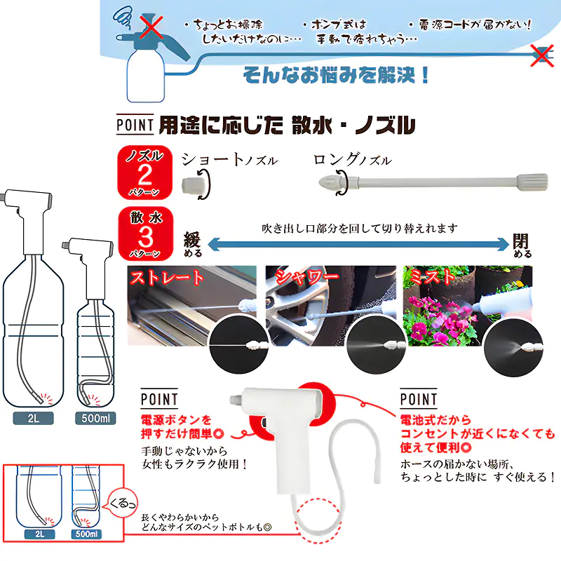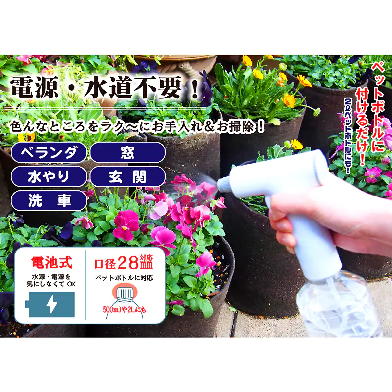 ![]() ![]() ![]() 日々の「ひと手間」を、革新的な「ひと押し」に。 毎日のガーデニングでの水やり、窓サッシの地道な掃除、手が疲れるほどのスプレー作業に、うんざりしていませんか? 高圧洗浄機は大げさすぎるけれど、手動のスプレーでは物足りない。そんなジレンマを、この一台がスマートに解決します。 本製品は、単なる電動スプレーではありません。あなたの「時間」と「労力」という貴重な資源を最適化するための、プロフェッショナルなツールです。 ■緻密なミストで、植物に生命の息吹を ガーデニングにおいて、水の与え方は植物の成長を大きく左右します。この電動スプレーが生み出す均一で柔らかなミストは、葉の表面を優しく包み込み、葉裏の虫対策や細やかな水分補給を可能にします。もう、重いジョウロを何度も往復させる必要はありません。指一本で、植物が最も喜ぶ環境を創り出せます。 ■狙った汚れを逃さない、掃除の新しいパートナー 付属のロングノズルに付け替えれば、その性能は一変。手の届きにくかったサッシのレールや、複雑な形状の網戸の汚れに対して、的確にアプローチできる洗浄ツールへと変わります。パワフルな水流が、これまで諦めていた汚れを効率的に除去。掃除の時間を大幅に短縮し、あなたの暮らしにゆとりをもたらします。 ■エコで、スマートな設計思想 使い慣れたペットボトルを再利用できるため、専用タンクの洗浄や保管場所に悩むことはありません。必要な時に、必要な量の液体をボトルに入れて装着するだけ。準備から後片付けまで、一連の流れが驚くほどスムーズです。わずか約94gという軽量設計は、長時間の使用でも負担を感じさせず、コードレスの自由な操作性と相まって、あらゆる場所をあなたの作業フィールドに変えます。 日々のルーティンワークを、より快適で、より創造的な時間へ。 この電動ペットボトルスプレーで、暮らしの質を一段階引き上げてみませんか。 |