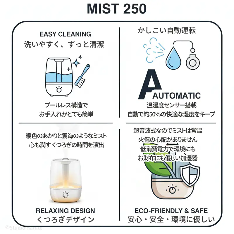 発送目安 : -![]() ![]() ■RHYTHM プールレス加湿器 MIST 250 ライトグレー 洗いやすさが、心地よさを連れてくる。毎日、清潔なうるおい習慣を。 どんなお部屋にも馴染むモダンなライトグレー。清潔さと使いやすさを追求した、新しい時代の加湿器です。 【清潔の新常識】 プールレス構造 & 簡単お手入れ 面倒な本体プールの掃除はもう不要です。独自技術「フローティングブースター」により、水が触れるのは取り外して丸洗いできる4つのパーツだけ。給水のついでにサッと洗え、いつでも衛生的にご使用いただけます。 【仕上げのひと工夫】 タンク乾燥機能 洗浄後のわずかな湿気も、しっかりケア。タンク内に風を送り内部を乾燥させる機能を搭載し、カビや雑菌の繁殖を抑制します。清潔さをキープするための、うれしい機能です (1・4・8時間タイマー設定可能)。 【かしこく潤す】 おまかせ自動運転 温湿度センサーが室内の環境を検知し、人が快適と感じる湿度約50%の状態を自動でキープ。加湿のしすぎや乾燥を防ぎ、一年を通して健やかな空間を保ちます。 【眠りを妨げない】 静音設計 動作音は約19dbと、木の葉のふれあう音ほどの静かさ。デリケートな赤ちゃんのいるお部屋や、集中したい書斎、もちろん寝室にも最適です。 【心まで潤す】 くつろぎの光と霧 電源を入れると、暖色のやわらかな光と共に、タンク内に雲海のような霧が広がる幻想的な演出(特許取得済)が始まります。見ているだけで癒やされる、至福のひとときをお届けします(明るさ3段階+OFF機能付き)。 【香りでリラックス】 アロマ機能 本体側面のアロマポケットに、お好みのエッセンシャルオイル(精油)を数滴垂らすだけ。潤いと共に、心地よい香りがお部屋にふんわり広がります。 ![]() ![]() ■MIST 250が選ばれるべき3つの理由 加湿器選びの本質とは何でしょうか。それは、いかに「清潔な水」を「手軽に」維持し、快適な湿度環境を創出できるかに尽きます。その答えを、私たち専門家の視点から「MIST 250」の中に見出すことができます。 第一の革新:衛生管理のパラダイムシフト 従来の超音波式加湿器の多くは、水を溜める「プール」が本体に固定され、清掃が困難でした。この構造的な課題が、雑菌繁殖の温床となるリスクを内包していたのです。MIST 250は、水位に追従して稼働する「フローティングブースター」という独自技術により、このプールを完全に不要としました。これは単なる設計の変更ではありません。「洗えない場所をなくす」という思想から生まれた、衛生管理におけるパラダイムシフトです。給水の都度、水が触れる全パーツを洗浄できる手軽さは、常にクリーンなミストを空間に届けるという、加湿器本来の使命を完璧に果たします。 第二の革新:機能を超えた「情緒的価値」の創造 電源を入れた瞬間、暖色の光とともにタンク内に立ち込める「雲海のような霧」。これはリズム社が特許を取得した、他に類を見ない演出です。単に湿度を上げるという機能的価値だけでなく、「水が霧へとかたちを変えるプロセス」そのものを美しく見せることで、ユーザーに安らぎと癒やしをもたらします。時計作りで培われた「体験をデザインする」という哲学が、この一台に凝縮されているのです。MIST 250はもはや家電ではなく、日々の暮らしに穏やかなリズムを刻む、空間の質を高めるアートピースと言えるでしょう。 第三の革新:「使う人の毎日」への深い洞察 洗浄後のわずかな湿気さえも許さない「タンク乾燥機能」、持ち運びから排水までの一連の動作をスムーズにするハンドルと底面の手掛かり。これらは、開発者がユーザーの日常を徹底的に観察し、「加湿器道」と呼ぶほどの検証を繰り返した末に生まれた機能です。この細部へのこだわりこそが、日々の「少し面倒」を「心地よい習慣」へと変えるのです。 毎日を、新しく クリーンで普遍的な印象を与えるライトグレーのカラーは、あらゆるインテリアと調和し、その先進的な思想を静かに体現します。MIST 250を選ぶことは、ただの加湿器を所有することではなく、清潔で、心豊かな暮らしのスタイルを手に入れることなのです。 ![]() ■詳細仕様 製品番号(型番):9YYA64RH 加湿方式:超音波振動加湿方式(フローティングブースター採用) 運転モード:Auto(自動制御)、Hi(強)、Low(弱)、Fog(演出モード) 使用温度範囲:5~35℃ 電源:入力 AC100V 50/60Hz、出力 DC24V(専用AC電源アダプター使用) 消費電力:Hi 約31W、Low 約14W、Fog 約15W、待機時 約0.6W 加湿量:Hi 約250ml/h、Low 約100ml/h、Fog 約18ml/h 連続加湿時間:Hi 約7.2時間、Low 約18時間、Fog 約105時間 *1 適用床面積:木造和室 約6.6m2(4畳)、プレハブ洋室 約11.6m2(7畳) タンク容量:約2.0L(残水量 約200ml) 製品寸法: 高さ385×幅192×奥行191mm(ハンドル使用時) 高さ288×幅192×奥行217mm(ハンドル折りたたみ時) 製品質量:約1.5kg(AC電源アダプター含まず) コード長:約2.5m 照明:LED 3段階調光+OFF 材質:ABS樹脂 メモリー機能:電源再投入時に前回の加湿モード・照明設定を記憶 ※AC電源