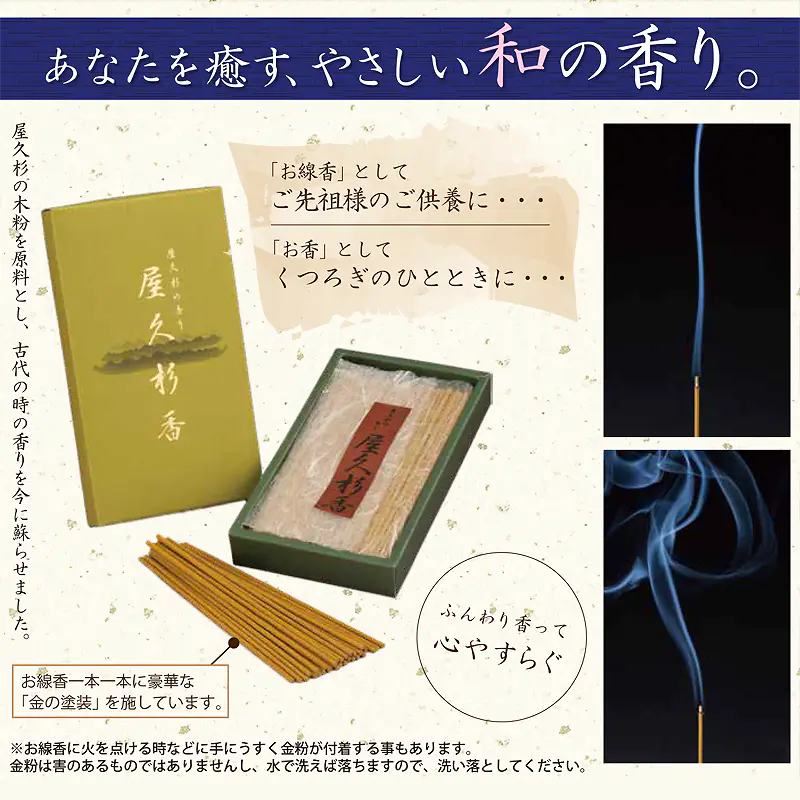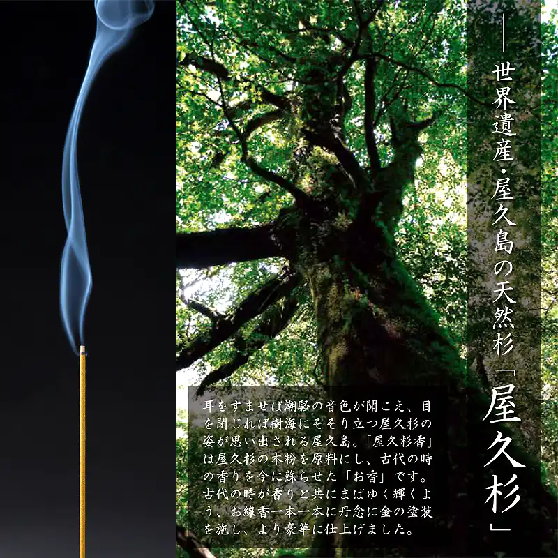 発送目安 : 2~3日で発送予定(土日祝除く)![]() ![]() 屋久杉香【悠久の時を旅する香り】 世界遺産の森を、部屋に灯す贅沢。 まず特筆すべきは、素材の希少性です。現在、屋久杉の伐採は禁止されており、土埋木や倒木のみが許された貴重な資源です。数千年の風雪に耐え抜いた屋久杉には、杉特有の清涼感に加え、樹脂の甘みと大地の力強さが凝縮されています。この香木を粉末にし、練り上げることで、火をつけた瞬間に屋久島の深い森そのものが部屋に広がるような感覚を味わえます。 そして、この商品の真骨頂は「視覚へのアプローチ」にあります。 通常、お香は香りを楽しむものですが、本品は一本一本に「金色の塗装」が施されています。これは単なる装飾ではありません。仏教において金は「極楽浄土の光」や「永遠」を象徴する色。火を灯した際、燃えゆく先端に微かに輝く金色の光は、見つめるだけで心を鎮める「トラタク(凝視)瞑想」のような効果も期待でき、ご先祖様への敬意を表す供物としても最適です。 忙しい現代社会において、私たちは常に情報のノイズに晒されています。 一日の終わりに、この屋久杉香を焚いてみてください。古代の香りに包まれ、揺らめく黄金の光を見つめる15分間。それは、あなたの魂を屋久島の太古の森へと誘い、本来の自分を取り戻すための儀式となるはずです。 大切な方への贈り物として、あるいはご自身の心を整える特別なツールとして。 世界遺産の森の恵みを、ぜひその手で感じてください。 ![]() 世界遺産・屋久島の天然杉「屋久杉」 耳をすませば潮騒の音色が聞こえ、目を閉じれば樹海にそそり立つ屋久杉の姿が思い出される屋久島。 「屋久杉香」は屋久杉の木粉を原料にし、古代の時の香りを今に蘇らせた「お香」です。 古代の時が香りと共にまばゆく輝くよう、お線香一本一本に丹念に金の塗装を施し、より豪華に仕上げました。 屋久杉の木粉を原料とし、古代の時の香りを今に蘇らせました。 ![]() ※使用上の注意 火の取り扱いにご注意ください。 お子様の手の届かない所へ保管してください。 お香は、年月を経ると退色することもありますが、それと共に香りが変わることはありません。 お線香は金の塗装を施した後、よく乾かしておりますが、火を点ける時にうすく手に付着する事もあります。害があるものではありませんし、水で洗えば落ちますので、付着した場合は水で洗い落としてください。 |