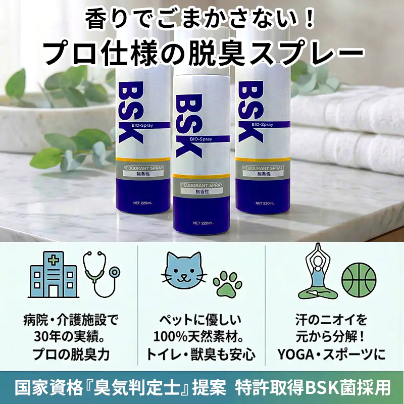発送目安 : 2~3日で発送予定(土日祝除く)![]() 特許取得の天然バイオ脱臭スプレー 「消臭スプレーを使っても、結局ニオイが混ざって余計に不快…」 皆様は、トレーニング後のウェアや、洗えないスポーツギア、お部屋のペットのニオイに悩まされた経験はありませんか?一般的な消臭剤の多くは、別の強い香りを被せてごまかす「マスキング方式」を採用しています。しかし、それでは根本的な解決にはなりません。 そこで私たちが自信を持ってご提案するのが、国家資格である「臭気判定士」が推奨する特許取得品プロ仕様 BSKバイオスプレーです。 ■秘密は100%天然の「BSK菌」 主成分は、驚くべきことに「水」と「BSK菌(バクテリア)」のみ。自然界に存在する有用バクテリアが、悪臭の元となる物質に直接アプローチし、水と二酸化炭素に徹底的に分解・浄化します。香りでごまかすのではなく、「ニオイそのものを無くす」という科学と自然のハイブリッド技術です。 ■あらゆるシーンで活躍する万能な脱臭スプレー アルコールフリーかつ無香料のため、デリケートな環境や素材にも気兼ねなくシュッと一吹きできます。 【介護・医療の現場からご家庭へ】病院や介護施設、地下鉄など、絶対にニオイを残せない極めて高い衛生基準が求められる現場で、30年以上の業務用実績を誇ります。気になる介護臭やトイレ臭、タバコ臭、生ゴミのニオイまで強力に脱臭します。 【スポーツ&フィットネス】YOGAやPILATESのマット、野球、バスケやサッカーのシューズや用具など、洗いにくいギアに染み付いた強烈な汗のニオイも、バクテリアの力で強力リセット。プロアスリートも納得の仕上がりです。 深い呼吸が基本となるYOGAやPILATESでは、無臭でクリーンな空気が何より重要です。香料ゼロ・アルコールフリーの天然成分なので、デリケートなヨガマットやウェアにも気兼ねなくシュッと一吹きできます。 【愛するペットとのお部屋】猫ちゃんやワンちゃんにもストレスフリー。トイレのアンモニア臭や特有の獣臭も優しくクリアに。 嗅覚の鋭い猫ちゃんやワンちゃんにとって、強い人工香料はストレスの元。本品は100%天然素材のため、ペット用トイレやベッド周りにも安心です。 ご家庭のあらゆるニオイの悩みに対応できるよう、たっぷり使える220mlの3本セットをご用意いたしました。 深呼吸したくなるような、本来のクリーンな空気をぜひご体感ください。 |