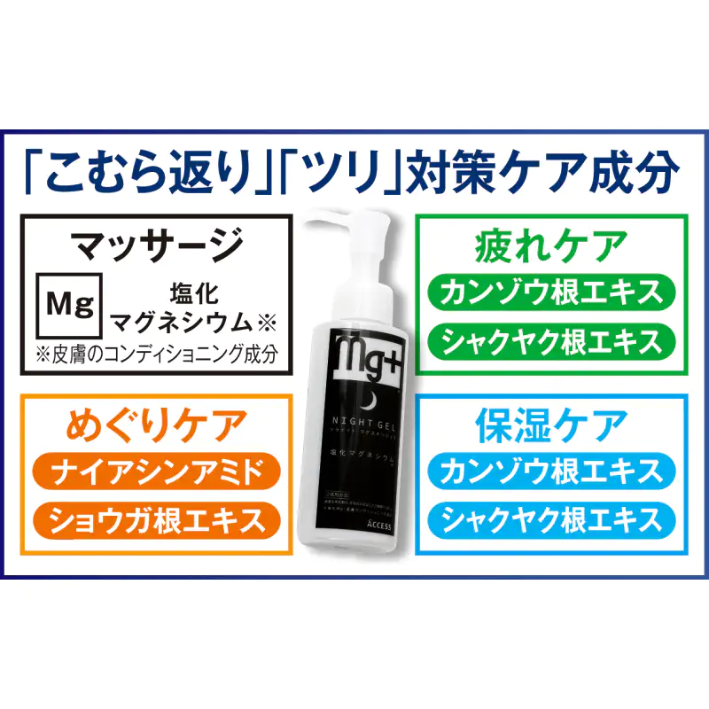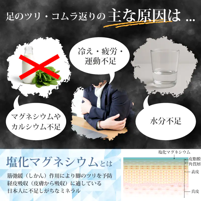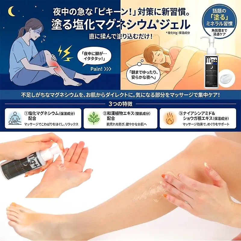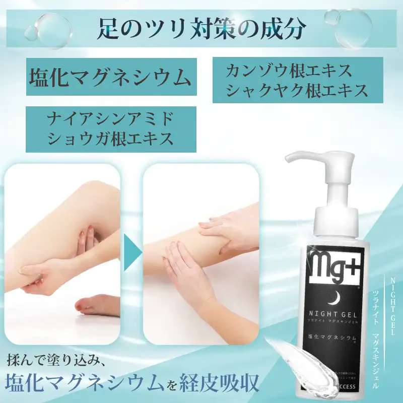 発送目安 : 2~3日で発送予定(土日祝除く)![]() 専門家も注目。「飲む」から「塗る」新習慣で、もう夜のイタタタ!に悩まない。 お客様、夜中にふくらはぎがピキーンと攣って、激痛で目が覚めてしまうことはありませんか? あの激しい痛みと、その後も続く違和感…本当にツライですよね。 実は、足のツリやこむら返りの主な原因は、冷えや疲労、水分不足だけでなく、「マグネシウムやカルシウムといったミネラルの不足」が深く関係しているんです。 特にマグネシウムは、私たちが筋肉を「伸ばす(動かす)」ために欠かせない栄養素。不足すると筋肉が収縮したままになり、痙攣を起こしやすくなってしまいます。しかし、現代の日本人は食生活の変化などから、このマグネシウムが慢性的に不足しがちだと言われています。 「じゃあ、サプリメントで飲めばいいのでは?」と思われるかもしれません。もちろんそれも一つの方法ですが、お腹がゆるくなりやすかったり、実感するまでに時間がかかったりすることも。 そこで、私たちが自信を持っておすすめするのが、この「ツラナイト マグスキンジェル」による【経皮吸収(皮膚からの吸収)】です。 海外のアスリートたちの間でも、コンディショニングに「マグネシウムを塗る・入浴する」ことは常識になりつつあります。なぜなら、塩化マグネシウムを皮膚から直接吸収させることで、気になるふくらはぎや足首などの筋肉へ、ダイレクトかつスピーディーに届けることができるからです。その吸収率は、なんと経口摂取の約3倍。 使い方はとっても簡単。1日頑張ったご自身の足を労わるように、適量のジェルを手に取り、ふくらはぎに「じわ~っ」と優しく揉み込んでください。 透明でみずみずしいテクスチャーのジェルが、スッと肌の角質層まで浸透していきます。ベタつかず、ナイアシンアミドや和漢植物エキスの力で、血の巡りをサポートしながらお肌もしっとり保湿してくれます。 寝る前の1分のマッサージ習慣で、筋肉の緊張がスーッとほぐれ、朝までぐっすり、快適な安眠環境をサポートします。 もちろん、ランニングやゴルフなど、急な運動時の足つり予防マッサージにも最適です。 「もうあの痛みで起きたくない…」そんな切実な願いに応える、新発想のマッサージジェル。安心の日本製クオリティで、ご自身用としてはもちろん、足の冷えやツリでお悩みのご家族への思いやりギフトとしても大変喜ばれております。ぜひ、今夜から「塗るマグネシウム習慣」を始めてみませんか? ![]() ![]() ![]() |