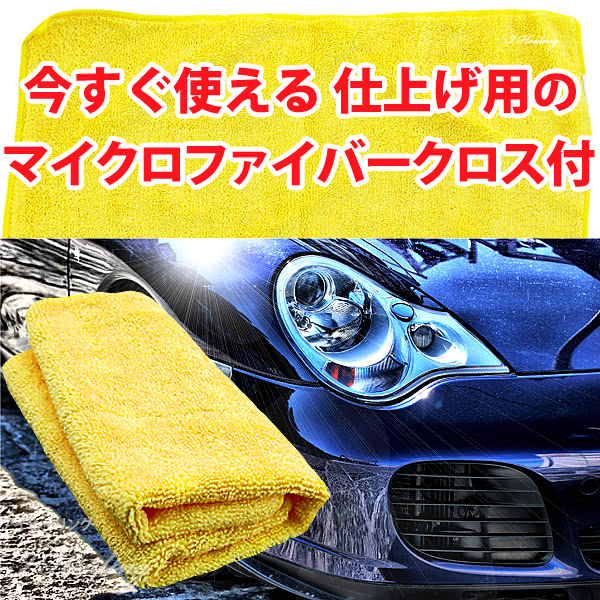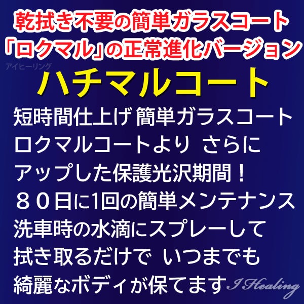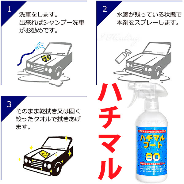 ![]() 超簡単・超きれい コーティング史上最も簡単な車コート剤 基本性能を上げたハチマルコート 早くて簡単なガラスコート施工。 洗車後の水滴が付いている状態にスプレーして、乾いた柔らかいタオル又は水を含ませ固く絞ったタオルで拭き伸ばすだけで終了です。 液体ワックスよりも簡単、市販品で最も簡単なものです。 ハチマルコートの成分は完全硬化しないため、多少雑に塗ってもムラ等が起きにくいようになっています。 ハチマルコートの秘密1 ムラの出来難い「アモルファスゲル」採用。 アモルファス(非結晶)構造は、通常の結晶構造に比べて固化し難い特性があります。 結果、ムラができにくく取り扱いが簡単なコート剤となりました。 ![]() 1.さらに保護光沢性能アップ 光沢昇華防止剤を配合 ハチマルコートには保護光沢性を維持するために「光沢昇華防止剤」を配合しました。 光沢昇華防止剤は、保護光沢性を担う薬剤が無くなる昇華を抑える働きをします。これによって保護期間を延ばすことが出来ました。 光沢昇華防止剤が光沢保護成分を囲うようにして昇華を抑えます。 2.短時間施工 最も簡単な施工方法 ハチマルコートは、洗車後の水滴が付いたままの状態でスプレーして拭き取るだけ。洗車時間内でコート施工が出来ます。 拭き取り工程等が少なく至極短時間に施工が完了します。 ハチマルコートの化学的特性は親水性。水に溶かすことが出来ますので、水滴の付いている状態でスプレーすることが出来ます。 ハチマルコートの秘密2 水滴が付いたまま施工出来るミセル構造。 ガラスコートが水溶性の特性を持っているので、水滴が付いている状態でも均一な仕上げになります。 3.省体力施工 最大の体力を要する乾拭き作業が省かれるので、とても楽に施工が出来ます。 洗車機を使用した施工にも最適です。 洗車機完了時に多少の水滴が付いていますので、その状態からスプレーして拭き取るのが最良の施工方法です。 ハチマルコートの秘密3 拭き取り抵抗の少ない水滴が付いた状態での拭き上げ作業。 固化した余分なコート剤を拭き取るのではなく、水滴を拭きあげるだけの作業なので、想像よりも簡単です。洗車時に必要な作業工程だけなので、実質的に洗車時の体力だけでコーティングが出来ます。 4.無頓着施工 ボディ以外に付着しても問題ありません。ホイール・フロントガラスにも施工可能です。 ガラスに付着した場合は、そのまま乾いたタオルで透明になるまで拭きあげると簡単な撥水剤代わりになります。 ゴム部やウレタンバンパー等もそのまま保護、防汚効果が高まります。 5.メーカーコートの上に施工 メーカー(ディーラー 販売業者)コートを行った、その上から施工が可能です。 6.推奨施工間隔80日 推奨される施工間隔は80日。洗車時に行うことで、いつまでもきれいな状態を保つことが出来ます。 最長で120日程度の保護期間を目安にしてください。 7.優れた経済性 容量は500ml。ハチマルコートは大容量なのでこれ1本で25回分。80日間隔の推奨期間で施工を行うと5年以上の使用が可能です。 8.ガラスコートの特性はそのまま 防汚+静電気防止 良質のガラスコート性能 ガラスコート剤の最大のメリットとなる、静電気によるホコリの付着が少なく、汚れを水と共に洗い流すセルフクリーニング特性はそのままです。 推奨期間の80日毎の洗車時にスプレーすることで、いつまでも美しくホコリや汚れが付きづらいボディを保ちます。 ハチマルコートは、ガラス繊維ポリマーを主体とするガラスコート剤です。ですので、ガラスコートの特性である汚れが付きにくく静電気が帯電しにくい特性はそのままです。 塗布後は強固な皮膜で保護され、後々の洗車も簡単で埃や汚れが付きにくくなります。 もちろん光沢も充分納得頂けるものとなっています。 ムラなく綺麗な仕上がり・防汚&静電気防止効果・フロントガラスの撥水効果・家庭内の保護、ツヤ出し剤としてもご使用出来ます。 ■特徴 ハチマルコートはこんな方におすすめ 質問:コーティングと聞くとなんだか面倒そうで ハチマルコートに限っては普通の液体ワックスよりも、はるかに簡単で、労力も使いません。 質問:ディーラーコートをしてあるのですが 新車時にコーティングを行っていた場合でも、ハチマルはかなり刺激性が低いので塗面に影響を与えません。 質問:マスキング作業とか必要ないの? フロントガラスも樹脂部も大丈夫なので、そのまま まるっと塗る事ができます。ただしゴムやペダル等の塗れない部分もあります。 質問:寒い日にコート作業なんて考えただけでも 洗車機を使用するなら、機械から出た後の水滴をハチマルでスプレーして拭き取れば、ほとんど水に触れることなく完成です。 質問:とても簡単に施工が出来るのでかえって心配です 長期保護性能は専門の商品に比べて落ちますが、施工時間が極めて短く回数を重ねられるので、トータルでは良い結果を得られます。 ![]() 便利なマイクロファイ