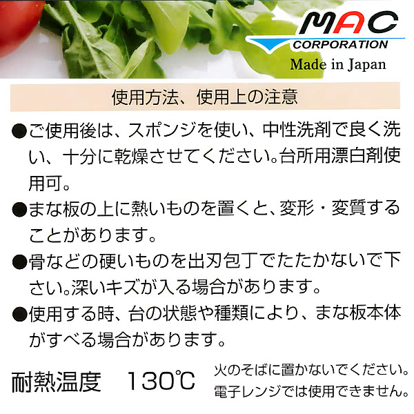 スタイリッシュ しなる iHealing MACSTAR CORPORATION ●まな板サイズ:縦24cm*横37cm*厚さ0.4cm、重さ330g ●本体材質:合成樹脂類(特殊エラストマー) ●カラー:ブラック・黒 BLACK ●国産 製造:日本 MADE IN JAPAN ◎内容:包丁のマックが作った、こだわりのまな板です。 まな板の表面の凹凸意匠は金型加工によるこだわりの手作り加工で、何度も試行錯誤しました。 食材を置いた時の安定感、刃当たり、水はけなど最適な使い心地を生み出すよう、全てにこだわった自信の一品です。プレゼントにもおすすめ。 汚れが目立ちにくく落ち着きのある黒色。 シンプルで軽く、使用後も洗いやすい、清潔、傷がつきにくい。普通のまな板よりわずかに大きいので作業効率も上がります。 表と裏 関係なく使用可能。 MACエラストマーまな板の特徴 1.軽い、水に浮く約330gの軽さで強靭な素材。水切り、水弾きも良い。 2.強い、耐熱温度130度、食器洗浄機や食品乾燥機に対応。煮沸や熱湯消毒もできますのでより衛生的に使用できます。 3.抗菌、抗菌剤を配合した特殊エラストマー素材は、ソフトで弾力がありながら強靭で< 包丁によるキズ等がつきにくく、雑菌が増えにくい衛生的な素材です。 4.弾力、刃あたりが良く薄い。ソフトで弾力があり、木のまな板のように刃あたりがとても良く、料理が楽しくなります。 SIAAマーク表示 抗菌製品技術協議会が制定した抗菌のシンボルマークです。 SIAAマークは、旧022196法により評価された結果に基づき、抗菌製品技術協議会ガイドラインで品質管理・情報公開された製品に表示されています。 使用方法 使用上の注意 ご使用後は、スポンジを使い中性洗剤でよく洗い、十分に乾燥させてください。台所用漂白剤使用可。 まな板の上に熱いものを置くと、変形・変質することがあります。 骨などの硬いものを出刃包丁でたたかないでください。深いキズが入る場合があります。 使用する時、台の状態や種類により、まな板本体がすべる場合があります。 火のそばに置かないでください。 電子レンジには使用できません。 |