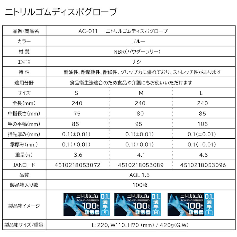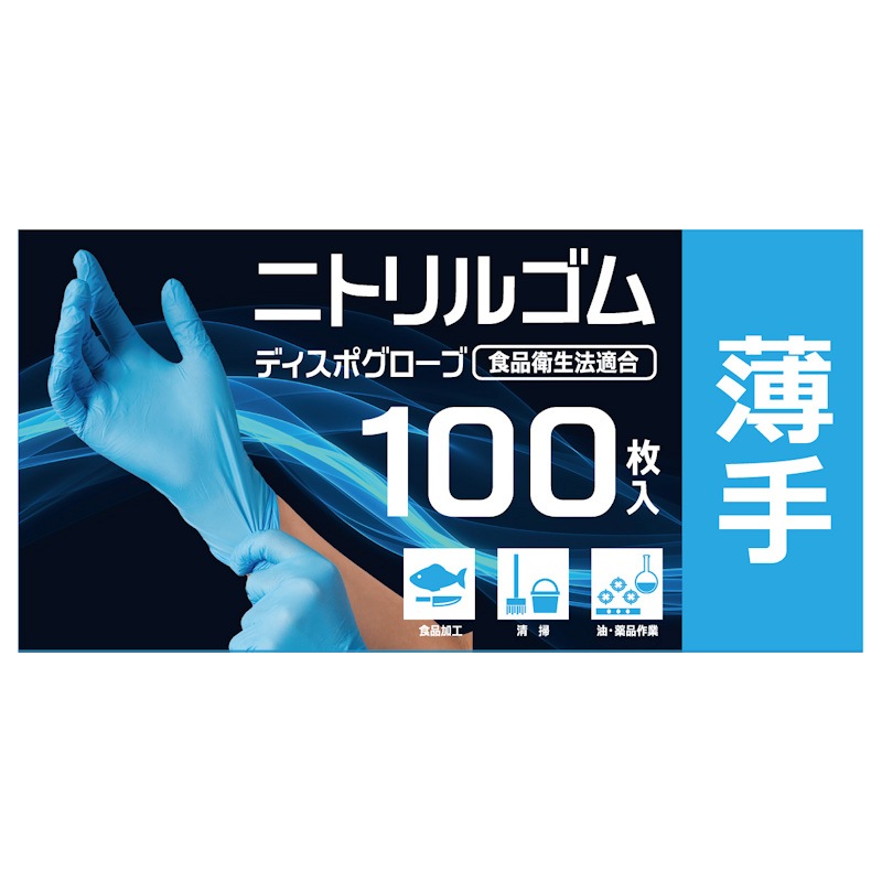 食品衛生法適合 ニトリルゴム手袋 ディスポグローブ 薄手 100枚入り Lサイズ AC-011 パウダーフリー ラテックスフリー 左右兼用 業務用 衛生 介護 作業用 使い捨て 使い切り ニトリル手袋