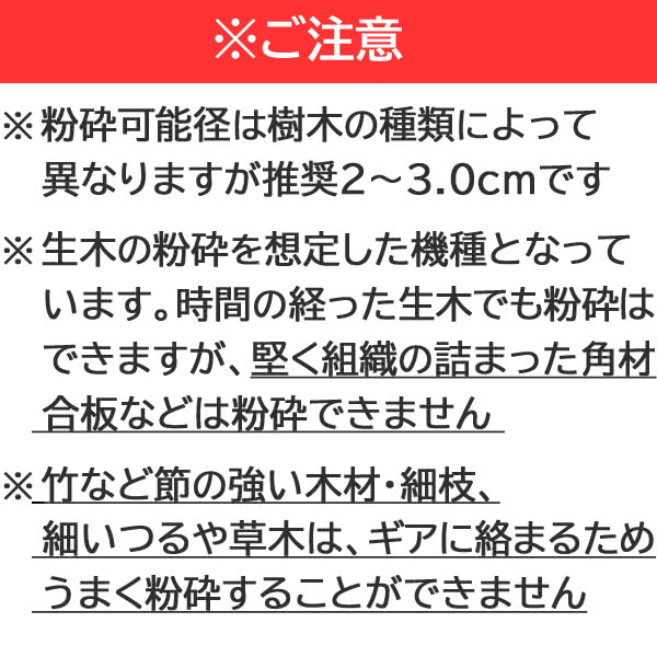 ![]() YARD FORCE ・ヤードフォース 静音ガーデンシュレッダー ERU35-JP 電動ギア式 静音モデル 剪定後のかさばる枝木を一気に粉砕して処理を楽にします。人気のヤードフォース枝シュレッダーが、強力ギア式になりました。 お客様のリクエストから、住宅街でも使える音量レベルを実現。 新型は旧型との従来品と比較し、ギア式の採用により運転音40%削減。 1450Wのパワフル設計はそのまま、静音64dbで作動音が静か。音が心配な住宅地でも、ご近所を気にすることなくいつでも作業できます。 日常音のレベルの目安 db(デシベル) 80db 飛行機の機内、70db カフェ店内・バスの車内、60db 博物館の館内・銀行の窓口、50db 書店の店内・図書館の館内、40db 夜間の戸建て住宅街 静音ガーデンシュレッダーは博物館や銀行窓口の音に匹敵する静かさです。 ギア式なので枝を押し込まなくても自動でぐいぐい巻き込んで粉砕。 最大径3.0cmの太枝まで粉砕が可能。 ![]() 剪定後のかさばる枝木も、良質なウッドチップにして楽に処理。静かに枝を粉々にします。 粉砕後のウッドチップは敷石や畑の堆肥にも活用できます。 ![]() 葉や枝が短くなったら、付属の押し込み棒で作業もスムーズ。安全のためのゴーグル・手袋セット。 ![]() 大容量60Lダストボックス付 切断後のかさばる枝木を細かく粉砕してコンパクトにします。 ウッドチップは大きめのブロックタイプ。 シュレッドを繰り返し より細かく粉砕することも可能です。 ![]() 粉砕可能最大径3.0cm、葉付きの枝まで対応可能。 粉砕可能径は樹木の種類によって異なりますが推奨2-3.0cmです。 *生木の粉砕を想定した機種となっています。時間の経った生木でも粉砕はできますが、堅く組織の詰まった角材、合板などは粉砕できません。 *竹など節の強い木材・細枝、細いつるや草木は、ギアに絡まるためうまく粉砕することができません。 *ご使用の際は安全を確認しながら、必ず目や手を守る防護ゴーグルや手袋を着用し、全身を守って作業してください。 *この製品は脚部が組立式になっております。本体が重いため、組み立ては2人以上の大人が作業してください。 *子供やペットには、近付けさせないでください。 *絶対にコンセントを入れたまま開かないでください。 ![]() 荷台からはみ出すほどの山盛りの枝がスッキリ。ゴミ出しが大変な伐採後の枝木も、この静音ガーデンシュレッダーで粉砕すれば良質な木材チップに早変わりします。 ごみ減量対策 可燃ごみ削減 どっさりの粗大ごみが、ギュッと普通ごみにコンパクト。小さく袋詰めにでき、ゴミ出しを楽にします。 通常 可燃ごみ・燃やせるごみとして出す場合は、枝は短く長さを切り揃える・余計な小枝を落とす・束ごと小分けする・揃えて紐で束ねる等しなくてはいけませんが、ガーデン用シュレッダーで粉砕すればゴミ袋に入りゴミ捨ても簡単です。 ![]() 使いやすいボタンと自動ブレーカー機能付きで安心。 ボタンは全部で4つだけなので、初心者でも簡単に使えます。過負荷で自動停止する安全装置。逆回転切り替えスイッチ付き。 過負荷がかかると自動でブレーカーが落ちる安全設計です。ブレーカー解除もスイッチ1つで簡単。 オン・オフボタン・ブレーカーリセットボタン・詰まりを解消する回転切り替えボタン(逆回転機能付)。 ![]() ボックスのレバーを上げ固定しないと作動しない安全設計。 ![]() 大きいタイヤ付きで女性でも持ち運びが楽。重い本体もスムーズに運べます。 ![]() ヤードフォース 静音ガーデンシュレッダー ERU35-JP 剪定枝粉砕機 ご家庭の樹木を剪定した際に発生する剪定枝、落葉等を粉砕して堆肥などに利用するための機械。 家庭から出るごみの再資源化・減量化。剪定小枝・落ち葉などのごみ減量・自家処理を推進。 多くの家庭で果樹や樹木を剪定すると大量の枝葉が出ます。ガーデンシュレッダーで剪定枝をチップ状にして、樹木や植木の根元に散布、腐植土に転換などすれば、ごみを有機肥料に変える事が出来ます。燃えるごみとして出す場合でも、チップにすることで大幅にごみを削減でき、収集・運搬の効率も改善します。環境負荷が少なく、おすすめの商品です。 ![]() ごみの減量化対策・焼却ごみ削減の一環で、ガーデンシュレッダー 剪定枝葉粉砕機の購入費の一部を、各自治体の市町村が補助金・助成金を交付している場合があります。 例 名目:枝葉粉砕機(ガーデンシュレッダー)設置補助制度・枝葉破砕機購入費助成金等 例 補助率2分の1 上限5000円-19800円まで等 お住まいの地域の広報誌やホームページ等でお調べください。 |