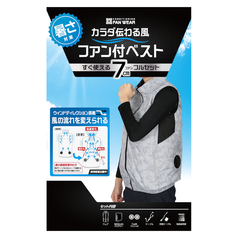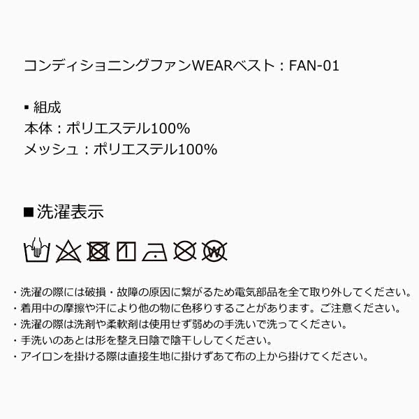 | ●商品名:ファン付きコンディショニングウエア ファンウェアセット 暑さ対策 ファン付ベスト 衣類 空調の服 作業着 袖なし 胴着 チョッキ iHealing CONDITIONING FAN WEAR VEST ●型番:FAN-01 ●服サイズ M:身長165-175cm、胸囲88-96cm L:身長175-185cm、胸囲96-104cm LL:身長175-185cm、胸囲104-112cm 3L:身長180-190cm、胸囲108-116cm ●材質:(本体)ポリエステル100%、(メッシュ生地)ポリエステル100% ●カラー:ライトグレー ●用途 おすすめ:暑い日の仕事・外作業 屋外・屋内・室内 汗をかく環境 業務 家庭 畑仕事 農作業 職人 現場 作業員 従業員 搬入 DIY 園芸 ガーデニング レジャー アウトドア スポーツ プレゼント・贈り物 ●販売店:アイヒーリング本店 ●セット内容:ウェア(ベスト)、5200mAhバッテリー、7cm径ファン2個、接続ケーブル、充電ケーブル、取扱説明書、保証書(メーカー保証6ヶ月間:バッテリー・ケーブル・充電ケーブル) ●製造メーカー:株式会社ディックコーポレーション 新潟 DIC CORPORATION ◎内容:風が吹き抜ける仕組みで涼しく快適にできるファン付き空調ベストのフルセットです。気軽に着られる人気のベストの基本機能をさらに充実させ改良した2022年モデルです。 夏の暑さによる汗の蒸れ 猛暑対策 暑さ対策 熱中症に気を付ける季節に。真夏の屋外作業 農業 配送検品 工場等などで活躍する夏の必需品です。 ☆商品の特徴 1.ウインドディレクション:風の流れを変え効果的に冷やす専用機能。 2.破れにくい:リップストップの生地で破れに強くて丈夫です。 3.遮熱コーティング:内側の遮熱コーティングが熱を緩和します。 4.フロントファスナー:着脱しやすいフルジッパー式。 5.ファスナーポケット:ファスナー式でしっかり収納。 6.内側メッシュ:衣類の貼り付きを防ぐ仕様。 7.消臭テープ付き:消臭テープでニオイを軽減します。 ◇出力電圧及び使用時間【表示ランプ・最大出力・連続使用時間】 表示ランプ4:出力7V 約7.5時間 表示ランプ3:出力6V 約10時間 表示ランプ2:出力5V 約13時間 表示ランプ1:出力4V 約16時間 ◇バッテリー仕様 電池容量:5200mAh 入力電圧:DC7.4V 2A 充電回数:約350回 充電時間:約7~8時間(残量0からの充電時) 使用環境:0度から50度推奨(非防水) 重量:230g |
