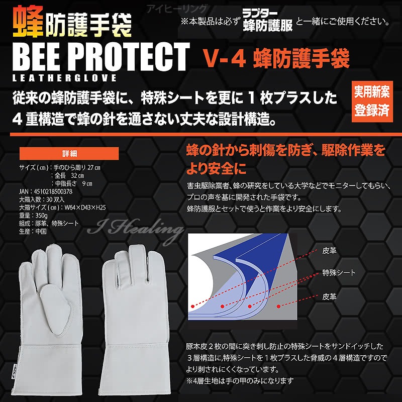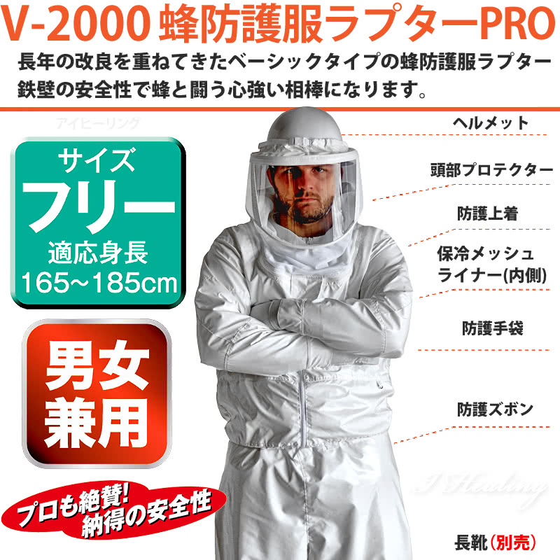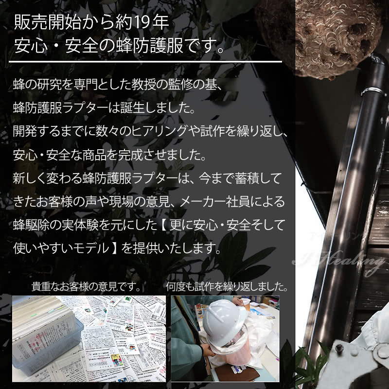 ![]() ![]() ![]() ![]() ![]() ![]() ![]() ![]() ![]() ![]() ![]() ![]() ![]() ラプターPRO仕様 蜂防護服:適応身長サイズ フリー 165-185cm 男女兼用 FREE 上着:胸囲130cm・胴囲78-120cm、身丈73cm 肩幅55cm 身幅67cm、袖丈63cm パンツ:総丈119cm 腰囲118cm 股下85cm 蜂防護手袋:手のひら周り約27cm、長さ約32cm、中指の長さ約9cm お届け製品箱サイズ:W38×D33×H27cm 持ち運びが便利な取っ手形状 製品重量:4.5kg 材質 組成 【頭部プロテクター品質】本体:ナイロン100% ソフトメッシュ:ポリエステル100% ハードメッシュ:ナイロン100% レンズ:ポリカーボネイト 【防護上着 上衣品質】ナイロン100% 【ライナー】本体:ポリエステル100% 関節部:ポリエステル90%、ポリウレタン10% ポケット:綿100% 【防護ズボン パンツ品質】表地:ナイロン100% 中生地:ナイロン100% 裏地:ポリエステル100% 【蜂手袋】豚革、特殊シート 着用モデル:身長178cm セット内容 収納ボストンバッグ V-1700 1400g 蜂防護手袋 V-4 350g ヘルメット 460g 頭部プロテクター 300g 上衣 880g ズボン 800g 保冷ライナー 380g 保冷剤4個 1個あたり200g ラプターPRO 取扱説明書1冊、携帯に便利なA5サイズ 冊子で使い勝手がアップした説明書 ※本製品には、長靴は付いておりません。 プロ向け蜂防護服 ラプターPRO バッグセット V-3700SET V-2000+V-1700+V-4 正規品 V-2000 蜂防護服 ラプター PROとV-1700 蜂防護服ラプター専用収納ボストンバッグとV-4 蜂防護手袋のトータルセット。移動・収納・保管に便利。 V-2000 蜂防護服ラプターPRO機能 3層構造生地 手首ファスナー ハードコートメッシュ 防雲フイルム 小型プロテクター 保冷メッシュライナー フルジップ式 胸ポケット カラビナストラップ ラプターPROの特殊三重構造生地 止まれない、突き刺せない。独自の特殊生地で蜂の脅威からしっかりガード。 ズボン部分対象。上衣は保冷ライナー部含め3重構造になります。 1層目 蜂が滑ってとまれない。 蜂が滑りやすい生地を使用しているため力が入らず、蜂が容易に刺せません。また、生地表面には抗菌防臭加工を施しています。 2層目 蜂の針を通さない。 PVCコーティングされた生地を使用。目が詰まっているので蜂の針の貫通を防ぎます。ポリエステルメッシュを採用しているので汗などで肌に生地が張り付くのを防ぎます。これにより作業時の不快感を軽減し、快適性も向上します。 ラプターPROの小型頭部プロテクター 従来品では対応出来なかった、屋根裏や狭い隙間にも対応した新モデル。 POINT01 レンズの視界はそのまま18%CUT 従来品には無い小型化を行い、屋根裏や狭い場所での作業が快適になりました。 POINT02 レンズが曇りにくい空間設計 顔とポリカレンズの距離を広げ呼吸の曇りをカット。さらにポリカレンズと生地繋ぎ目の強度をアップ。 POINT03 周囲の音も聞こえやすいハードメッシュ 背面にハードメッシュを使用。安全性を確保し、快適をさらに向上。 POINT04 視界クッキリをサポート レンズ内側に防雲加工を施し、レンズの曇りをさらに抑制します。 ラプターPROのヘルメット 厳しい国内基準をクリアしたヘルメットだけを使用。絶縁規格、飛来落下物墜落時の試験など厚生労働省の定めた様々な安全基準をクリアしたヘルメットを使用しています。 ラプターPROの上衣 ズボン ゆったりサイズで幅広くサイズ対応 上衣&ズボン。 POINT01 着やすい 脱ぎやすい フルジッパー式上着 フルファスナー式により従来品より脱ぎやすく、使用後は解放することで衣類内のムレを軽減し衛生的です。 POINT02 胸ファスナーポケット スマホや小物を収納可能な大きなポケット。 POINT03 肘2重強化仕様 従来品調査の元、駆除作業時に肘を付いた作業が多く、肘を2重に強化し耐久性を強化。 POINT04 カラビナストラップ 使用者で多く声が上がった調査報告をするための小物やデジカメを、カラビナで取付け出来るストラップを追加。 保冷メッシュライナー 通気 洗える 厚みしっかり 保冷メッシュライナー。従来品の保冷ベストがさらに進化。取り外しもしやすい前開きタイプです。 POINT01 関節部分ストレッチ 関節部分に伸縮性ある素材を使用し、作業をサポート。 POINT02 メッシュ素材 しっかりした厚みあるメッシュ素材で安心です。 POINT03 保冷剤専用ポケット メッシュライナーに冷やした保冷剤を収納出来るポケットを4箇所配置。炎天下の作業をサポートします。 POINT04 洗濯OK 肌に直接触れる保冷メッシュライナーは、ご家庭の洗濯機で洗濯も可能なので衛生的です。 蜂防護手袋 V-4 従来の蜂防護手袋に、特殊シートを更に1枚プラスした4重構造で、蜂の針を通さない丈夫な設計構造。 蜂の針から刺傷を防ぎ、駆除作業をより安全に。 蜂業者、蜂の研究をしている大学などでモニターしてもらい、プロの声を基に開発された商品です。 蜂防護服とセットで使うと作業をより安全にします。必ずラプター蜂防護服と合わせてご使用ください。 豚本皮2枚の間に突き刺し防止の特殊シート2枚をサンドイッチした3層構造に、特殊シートを1枚プラスした脅威の4層構造ですので、より刺さ