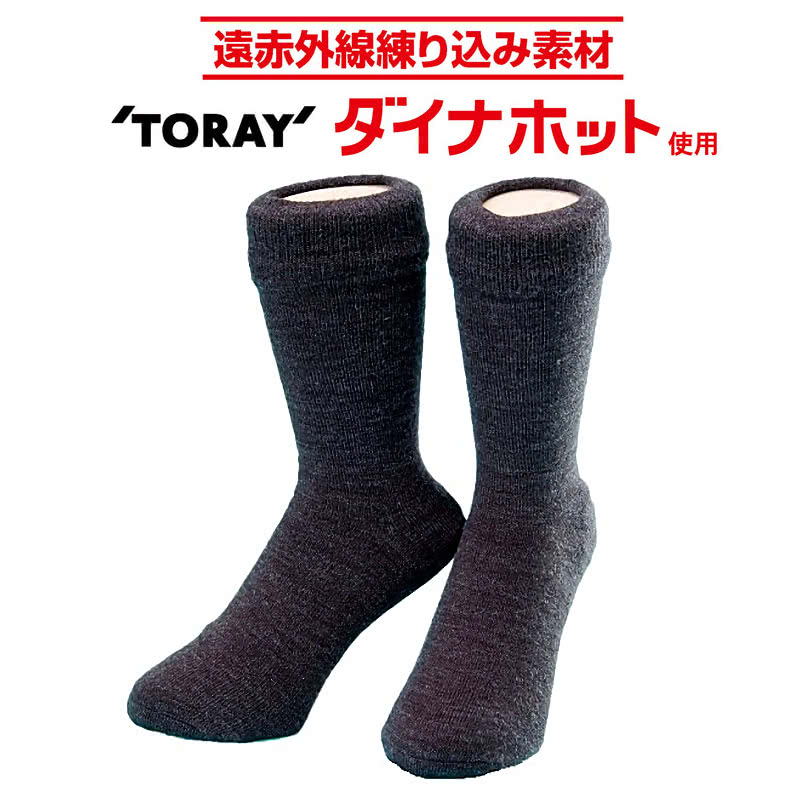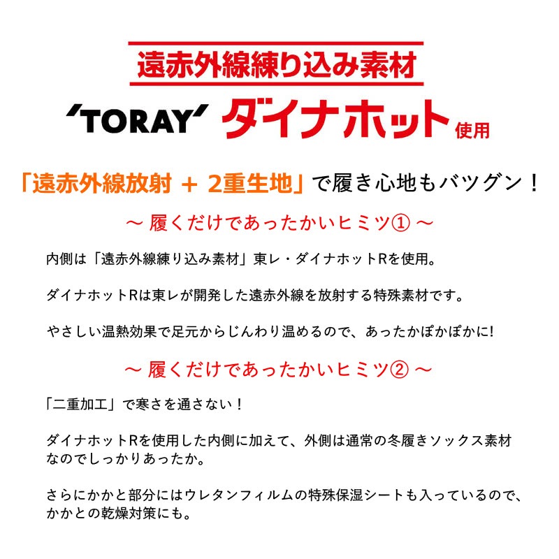 ◎内容:創業50年以上の老舗靴下メーカー開発のやみつき防寒ソックスです。ダイナホットRは東レが開発した遠赤外線を放射する特殊素材で、微弱なエネルギーを時間をかけて身体に与えていきます。やさしい温熱と二重加工により足元からじんわり温めるので、あったかぽかぽかに!