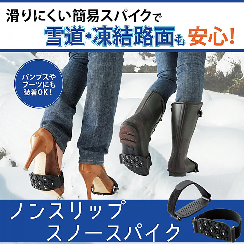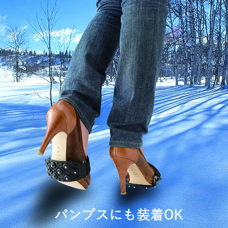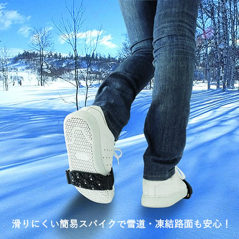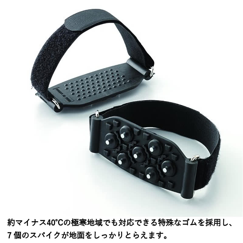 ◎内容:雪道や凍結路面を滑りにくく安全に歩けるように開発された簡易スパイクです。約マイナス40℃の極寒地域でも対応できる特殊なゴムを採用し、7個のスパイクが地面をしっかりとらえます。