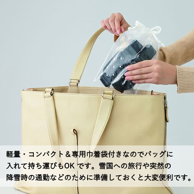 装着も簡単、軽量・コンパクト&専用巾着袋付きなのでバッグに入れて持ち運びもOKです。雪国への旅行や通勤などのために準備しておくと大変便利です。会社の机に机に常備しておけば突然の降雪時も困りません。 ■商品仕様 ●品名:ズレにくいノンスリップスノースパイク ●材質:合成ゴム(スチレン・ブタジエンゴム)、ナイロン、カーボンスチール ●カラー:ブラック ●サイズ(約):11.5 x 4.8 x 1cm ●適応サイズ:23.5~28cm ●重量(約):48g(片足) ●個装サイズ(約):20 x 11 x2cm ●個装重量(約):110g ●販売元:松栄興行株式会社 ●生産国:台湾製 ●付属品:収納用透明巾着袋(ポリエチレン) ※雪道等での滑りを少なくするためのもので、滑りを完全に防ぐことはできないため、雪道を歩く際には十分に注意してください。 また、靴の携帯・素材などにより外れる場合がありますのでご注意ください。 ※ホテル・旅館・店内・バス・電車等では必ず取り外してください。 ※明るい色の靴等に使用されますと、ゴム部分の色移りが生じることがありますので、色移りが心配な靴には使用しないでください。 ※用途以外では使用しないでください。また、スパイク面は人に向けないでください。 |