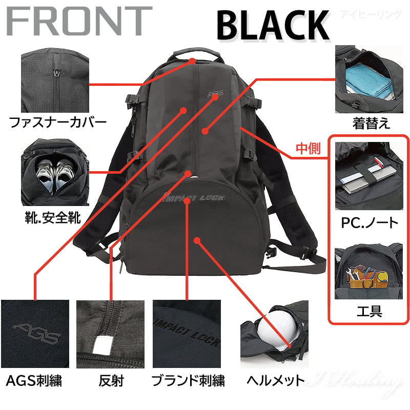 | ●商品名:アイヒーリング本店 AGS機能付きワークリュック エージーエス リュックサック サスペンション ワーカーズバッグ 作業用カバン 軽量 黒 スタイリッシュ シンプル おしゃれ 便利グッズ 現場リュック メンズ 男性 レディース 女性 iHealing AGS WORKERS ZACK RUCKSACK SUSPENSION ●ブランド・型番:インパクトロック IMPACT ROCK、RA-009 ●材質・生地:ポリエステル(裏側 PVCコーティング)、合成ゴム ●サイズ・重量:幅32cm 高さ55cm 奥行32cm、容量:32L、重量:約1.2kg ●カラー:ブラック・BLACK *刺繍含む ●用途 おすすめ:歩行時負担軽減 現場 作業 職場 工事 整備 管理 業務 出張 建設 土木作業、図面 安全帯 仕事道具 重い荷物の持ち運び 職人 作業員 従業員 作業用カバン 通勤 通学 現場ヘルメットバッグ ビジネス カジュアル ビジカジ シンプル スポーツ 農作業 自転車 軽登山 スポーツ レジャー 介護 子育て DIY プレゼント 贈物 屋外 ●製造メーカー:株式会社ディックコーポレーション DIC CORPORATION 新潟 ●販売店:アイヒーリング 正規販売店 ◇安全用ヘルメット対応サイズ:SS~LLサイズ ※幅25cm、長さ36cm(つばを含む最長部)、高さ25cm以内 ※バイク用のフルフェイスヘルメットは非対応となります。 ◎内容:歩行時の首・肩・背中・腰の疲労を軽減するAGSワーカーズリュックシリーズ。ヘルメット、シューズ・安全靴、工具が入る多機能な現場用バッグです。 ブラック無地柄。ブランドロゴが目立たないブラック色。 現場で働く人は荷物が多い、荷物が多いと負荷が大きい、そんな悩みはAGSが解決。 AGSは荷物の重さをエネルギーに変えます。 バッグ本体から伝わる力をAGSがサポートし、身体に掛かる負荷を軽減します。 首 肩 背中 腰、走行時の負荷を30%軽減。 動きに合わせて上下に弾む 歩行時の負担軽減。 AGS AntiGravity Systemを搭載 *国際特許取得 土木・建築系ワーカーを想定して作られ、丈夫さと収納性を重視しています。スタイリッシュなデザインが特徴。 外仕事で荷物が多い人へ幅広くおすすめ。現場出張から通勤・通学・小旅行まで使える、現場用リュックです。実用性がありプレゼントにもおすすめ。 機能 AGS 国際特許使用 Ultrabounce 特殊伸縮性の強いゴムベルト。身体が走行時に上下に弾むことで発生した弾力性効果が、肩などへの負担を軽減。 メイン素材は、裏側PVCコーティングを施した300Dの2重補強生地。 ショルダー部分は、厚みあるメッシュ素材。 側面合成ゴムは、車のシートと同様の材質を使用。 ファスナーカバー。 正面ポケット 靴・安全靴・着替え。 下部ポケット ヘルメット。 中側ポケット PC.ノート・工具・書類。 AGS刺繍 IMPACTLOCKブランド刺繍。 センターファスナー下部に反射材。 補強持ち手。 破れにくい立体EVAパネル。 傘や三脚等 棒状の物を収納可能なサイドコンプレッションストラップ付。 サイドポケット付 左右2箇所 ペットボトルや水筒を収納。 安全性を保つチェストストラップ。 持ち運び便利 キャリーケース取付。 |