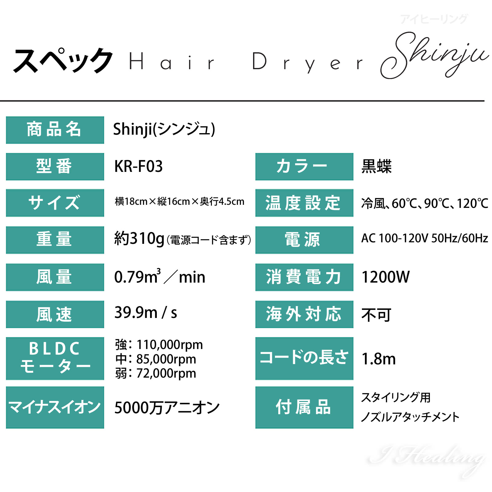 | ●商品名:アイヒーリング本店 公式 PSEマーク認証 ヘアードライヤー 黒蝶 くろちょう シンジュドライヤー 黒 かわいい おしゃれ 軽い iHealing HAIR DRYER BLACK レディース メンズ ●ドライヤー ブランド:Shinju シンジュ ●品番:KR-F03 ●本体サイズ:横18cm×縦16cm×奥行4.5cm ●お届け時 個箱サイズ:23.5cm×28cm×7cm、重さ1100g ●重量:約310g 電源コード含まず ●材質 本体:PC、送風口:アルミ、電源コード:PVC、スイッチ:PC PPS ステンレス ●カラー:ブラック 黒色 ●消費電力:1200W、電源コードの長さ1.8m ●温度:冷風・60℃・90℃・120℃ ●販売店:アイヒーリング本店 正規販売店 ●製造・発売元 メーカー:株式会社next innovation ネクスト イノベーション ●用途 例:髪を乾かす セット 髪のケア 髪の量が多い方 ロングヘア 長い髪の毛 ショートヘア 短い髪の毛 ミディアムヘア 家庭 美容院 美容室 ホテル 旅館 業務 理美容業界 サロン専売 プロが使う業務用ドライヤー 風量が高く素早いキューティクルの引き締め 時短 贈り物 ●定格・仕様:電源AC 100-120V 50/60Hz 日本国内用、風量 強110,000rpm・中 85,000rpm・弱 72,000rpm、風量:0.79m3/min、最大風速:39.9m/s ●セット内容:Shinjuドライヤー本体・送風ノズル、お手入れブラシ ●備考:保証書有 保証期間1年・説明書有 ◎内容:超時短 速乾プロ仕様ドライヤー Shinju ブラックモデル 黒蝶。美容室専売品を販売するメーカーが、最高峰のパワーとデザイン性を追求したプロ仕様のドライヤーを販売開始。黒ベースに金を取り入れた上品でおしゃれな色合い。ご家族や友人へのプレゼントにも。メッセージカード・ギフト ラッピング対応しています。 髪に優しい美容室専売メーカーが作るヘアドライヤー Shinju(シンジュ)ヘアードライヤーとは、最新世代のBLDCモーターを搭載し超軽量×超大風量。髪の毛をスピーディーに乾かし、より美しく仕上げます。 軽量コンパクト。本体は310gと軽いので、腕や手にかかる負担が少なく長時間のブローでも疲れにくい。ドライヤーを長時間扱う美容師・ロングヘアの方にもおすすめです。 温度は冷風、60℃、90℃、120℃の4段階設定と、強 中 弱の3段階の風量切り替え機能で美しく滑らかな髪に仕上がります。 オートクリーニング機能搭載なので、フィルター内部掃除機能搭載で簡単お掃除。いつでも内部を清潔に保つことができます。 風にはマイナスイオン(5000万アニオン)が含まれ、髪を美しく滑らかに輝かせます。 温風と風速が一目でわかる液晶ディスプレイなので、スマートなデザインです。 |