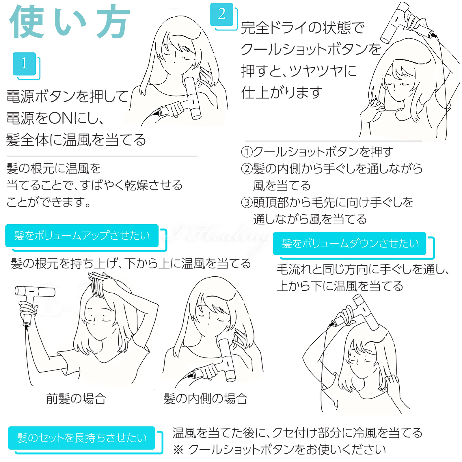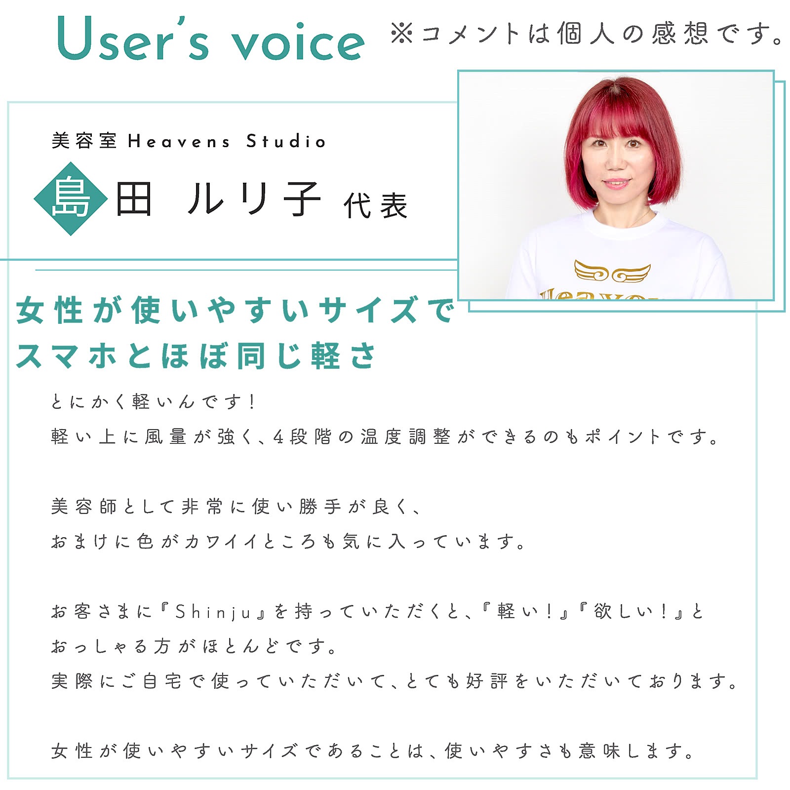![]() ![]() 今使用のドライヤーを使っていて、「重たい」「時間がかかる」「面倒くさい」と感じたことはありませんか? ひとつひとつが小さなストレスでも重なるとイライラ。 Shinjuドライヤーは、2つのポイントで速乾を実現。 4段階の温度設定と、毎分11万回転の高速モーターが生み出す大風量。 冷風・60℃・90℃・120℃で切替が可能。 60℃で乾かすことで頭皮や髪への負担を少なくし、やさしく乾かすことができます。 毎分11万回転の高速モーターを搭載。 毛髪だけでなく、毛穴に残る水まで乾かせます。 スマホを持つのと変わらない軽さで、あなたに ちょっとの気持ちと、時間に余裕を。 ![]() ちょっと 短くなったら…? 朝の支度もゆっくり コーヒーを飲んだり、スマホでニュースをチェックしたり、テレビを見たり…。 せわしない朝に、ほんのちょっとの時間をプラス。 急な外出にも 寝坊した日や、急にお出かけの日も。 いそがしい日も、いつもと変わらずキレイにセット。 ドライヤーが苦手な子どもにも 大切なお子さまが風邪を引かないように、より短く、静かな音で乾かすことができます。 お疲れの夜に お風呂から上がってもう寝たい。でも傷むから髪は乾かさなきゃ そんな夜も、早く乾かしてすぐベッドへ。 ![]() 見やすい液晶ディスプレイ 温度と風速が一目でわかるスタイリッシュなデジタル表記。冷風・60℃・90℃・120℃で切替ができます。 クールショットボタン ボタンひとつで冷風に切り替え。 電源OFF時には長押しで自動クリーニング機能になり、かんたんお掃除。内部をいつまでもキレイに保つことができます。 風速調節・温度調節ボタン 豊富な温度設定と大風量。3段階の風速・4段階の温度調節が可能なので、ひとりひとりの髪の状態にあったケアが可能。 毎分11万回転の高速モーターが生み出す大風量で速乾を実現。 Point パーソナライズドライヤー ■早く乾かしたい人へおすすめ:風速 強×温度120℃ ■ダメージが気になる人へおすすめ:風速 中×温度90℃ ■頭皮や髪をやさしく乾かしたい人へおすすめ:風速 弱×温度60℃ ※乾かす時間や短縮される時間には個人差があります。 ![]() ![]() ![]() ブラックカラーのおしゃれなドライヤー。 ![]() User's voice Shinjuレビュー ※コメントは個人の感想です。 美容室Heavens Studio 代表 島田 ルリ子 女性が使いやすいサイズでスマホとほぼ同じ軽さ 超軽量なので特に女性にお薦めです とにかく軽いんです。すごく軽いのに風量が強く、4段階に温度調整ができるのがポイントです。 美容師として非常に使い勝手が良くスタイリッシュなデザイン。おまけに色が可愛いところも気に入っています。 お客さまにshinjuのドライヤーを持っていただくと、「軽い」 「欲しい」とおっしゃる方がほとんどです。 実際にご自宅で使っていただいて、とても好評をいただいております。 女性が使いやすいサイズであることは、使いやすさも意味します。 ![]() ●付属品 スタイリング用ノズルアタッチメント ノズル 1.なめらかな風で髪をやさしく乾かします。 2.高速・高精度な風の流れで、一束ずつ自在にスタイリングできます。 3.風を均一に保ち、優しく乾かす事ができます。 ![]() 各部の名称とはたらき 1.吹出口 2.吸込口 3.フィルターケージ:取り外し可能で、お手入れ簡単。 4.風速調節ボタン:ボタンを押すことで変更できます。強・中・弱の3種類の精密な設定が可能です。現在の風速は液晶ディスプレイで確認できます。 5.温度調節ボタン:ボタンを押すことで変更できます。4段階の温度設定が可能です。現在の温度は液晶ディスプレイで確認できます。 6.電源ボタン 7.クールショットボタン:温風時に押している間は、冷風になります。電源OFF時に長押し(3秒間)すると、自動クリーニング機能になります。 その他の機能 熱シールド技術:ノズルの表面が熱くなり過ぎず、扱いやすい構造です。 オーバーヒート防止機能:通常の使用条件下での最高温度は120℃となります。 Shinjuドライヤーの使い方 How to Use 海外では使えません。日本国内専用(AC100V)です。また、変圧器でのご使用も故障の原因となります。 準備 タオルなどで髪の水分を拭き取る。 ブラシまたは手ぐしで髪のもつれを取る。 電源プラグをコンセントにさしこみ、電源ボタンを押す。 ![]() 1.電源ボタンを押して電源をONにし、髪全体に温風を当てる。 髪の根元に温風を当てることで、すばやく乾燥させることができます。 2.完全ドライの状態でクールショットボタンを押すと、ツヤツヤに仕上がります。 クールショットボタンを押す。髪の内側から手ぐしを通しながら風を当てる。頭頂部から毛先に向け手ぐしを通しながら風を当てる。 3.電源ボタンを押して電源をOFFにし、電源プラグをコンセントから抜く。 乾燥が終わったら、手ぐしまたはブラシで髪の毛を整えてください。 ドライヤーが十分に冷めてから、湿気の少ない所に保管してください。 電源プラグを持ってコンセントから抜いてください。 ![]() 髪をボリュームア
