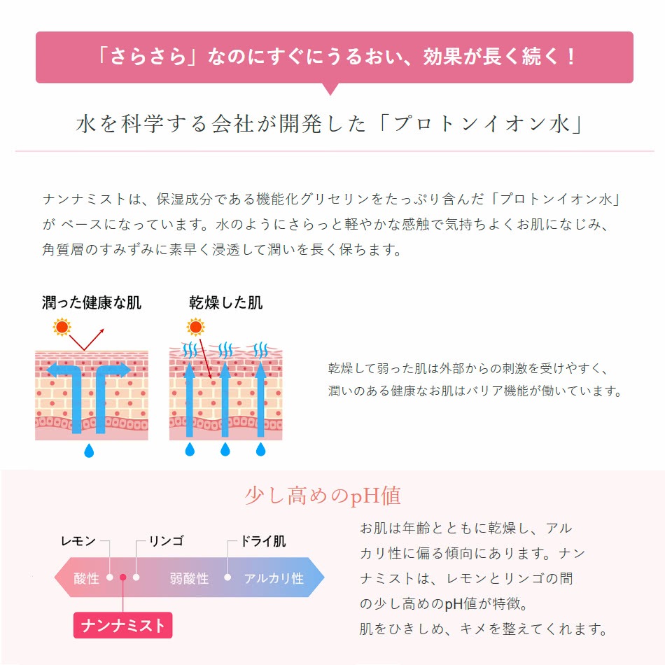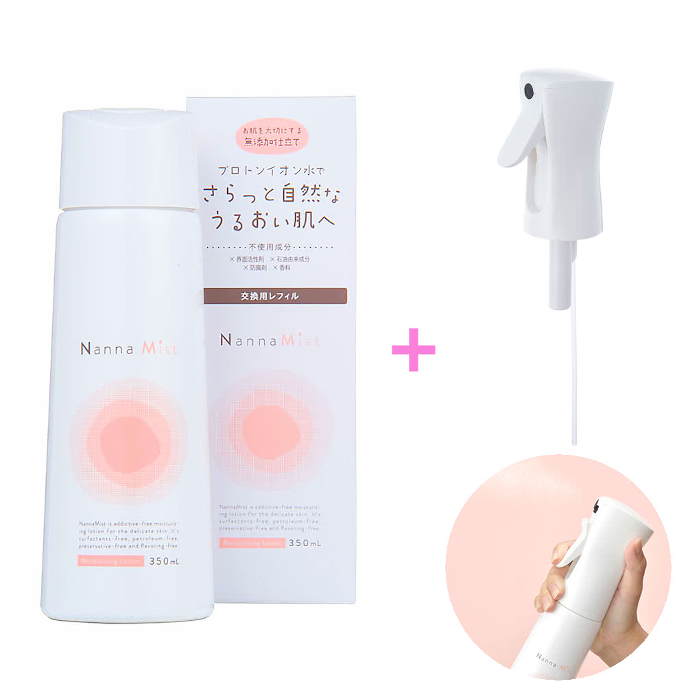 | ●商品名:Nanna Mist ナンナミスト 保湿化粧水 本体(交換用レフィル)、専用トリガー ●容量:350mL ●用途:化粧水/ボディローション ●成分:水、グリセリン、クエン酸、グレープフルーツ種子エキス ●液性:酸性 ●使用期限:開封後3ヶ月(未開封状態では製造日より3年間) ●販売店:アイヒーリング本店 正規販売店 ●発売元:株式会社ライトウェーブ ●製造国:日本 Made in JAPAN ◎内容:ナンナミストは水を科学する会社から誕生した、機能化グリセリン(植物性)を配合したプロトンイオン水がベースの保湿化粧水です。お水のようにサラサラなのに、べた付かない自然なうるおい感がひろがります。オールシーズン向きのさっぱりタイプで赤ちゃんから大人までご利用頂けます。 オランダのスプレーメーカーが開発した、マイクロミストスプレーを採用。広範囲に微細なミストがスプレーでき、全身の保湿に便利にお使いいただけます。 ☆お肌を大切にする無添加仕立て!界面活性剤、石油由来成分、防腐剤、香料は不使用です。 ◇ご使用方法 1.顔全体に行き渡るように、ミストを2〜3プッシュ振りかけます。 トリガーを引いている間、ミストが出続けます。少量噴霧したい場合はトリガーを離せば止まるので、噴霧量を調整してお使いください。 2.顔を手のひらで包み込むように、やさしくハンドプレスしながらなじませます。 ハンドプレスすると水分がスッと浸透してお肌に残らないのは保湿不足のサイン! お肌に水分が残るようになるまでミスト→ハンドプレスを繰り返して重ね付けしてください。 ・顔・手足・背中・頭皮など全身の保湿にお使いいただけます。 ・特にお肌が急速に乾燥する、入浴後のご使用がおすすめです。 ☆いつでもどこでも色々な使い方 ナンナミストはいろいろな使い方ができます。乾燥が気になったときでなく、様々なシーンでご利用いただけます。 ・お化粧の上からシュ! ・化粧水かわりにシュ! ・乾燥で肌がかゆくなったときシュ! ・日焼けで肌がほてったときにシュ! ・お風呂上り全身にシュ! ・頭皮が気になるときにシュ! ・汗のにおいを抑えたいときにシュ! ・赤ちゃんのよだれやミルクで汚れたお肌を拭くときにシュ! ◇ナンナミストQ&A Q:重ね付けはどれくらいすればいいですか? A:乾燥肌の方は5回くらいがおすすめです。ただし乾燥状態は季節ごと、個人ごとに異なるため、重ね付けする回数はご自身のお肌をその都度確かめながら調整してください。ハンドプレスした後、お肌に少し水分に残るようになれば保湿完了の サインです。 お肌が健やかになると、本来の水分を保持する力が戻ってくるため、重ね付けする回数は減ってきます。 Q:グレープフルーツ種子エキスが使われていますが日中使っても問題ないのでしょうか? A:ナンナミストで使用している種子エキスには光毒性のある成分は含まれておりませんので、日中いつでもお使いください。 |
