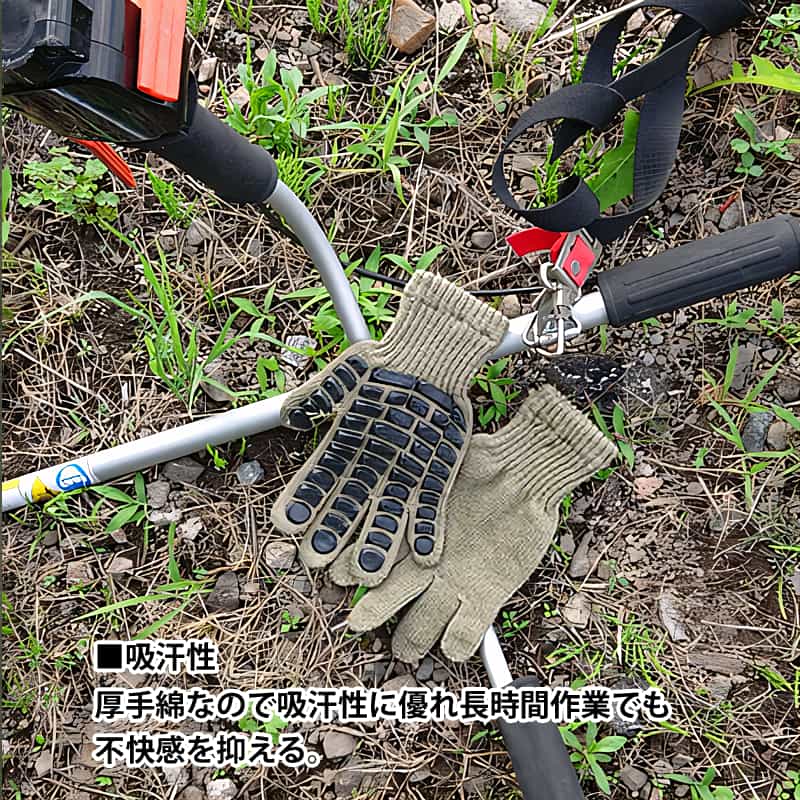 ![]() ■草刈りセット品 草刈り中は安全を確保してください 草刈りセット G-005は、草刈りをするために必要なアイテムが一つにまとまった3点セットです。安全性を最優先に考えたい方にお勧めです。 草刈りサロペット 草刈りサロペット 汚れを防いで安全快適。バツグンに使いやすい。 草汁の付着を防ぐ。撥水加工ポリエステル。本体とメッシュ部分はポリエステル100%。 後ろ側はメッシュで通気性UP。さらにこのメッシュは忌避剤加工をされており防虫効果。忌避剤とは虫が嫌がる成分です。 携帯・小物が入る胸ポケット付き。 大きめサイズで動作も楽。 草刈りレンズ付ネット レンズ付きで視界くっきり。刈払い機作業時に飛散する草や草汁から顔を守ります。本体はポリエステル100%。 くっきり透明感。ポリカーボネイト製レンズ。 ハットの上に被せるだけ。簡単取り付けタイプ。 顔全体を覆うネットで虫の侵入をガード。 絞り紐付きで幅広くサイズ対応。 振動軽減グローブ 厚手の天然ゴムが手に伝わる振動を軽減。 柔らかく独自のパターンの天然ゴムがハンドルをがっちり掴み操作性が向上。 親指部分はゴムを指又側に捻って加工しているので、疲れやすい人差し指と親指部分の振動を軽減。 厚手綿なので吸汗性に優れ長時間作業でも不快感を抑える。 本体綿100%、滑り止め部分天然ゴム。全長は235mm 掌幅100mm。 ![]() ![]() ![]() 草刈りの季節に必須 草刈りスターターセット 梅雨明けとともにやってくる草刈りの季節。雑草がぐんぐん伸びて、作業に追われる方も多いですよね。草刈りは虫や泥、飛散する草などで大変な作業です。そんな時に役立つのが、草刈り専用の作業服です。汚れや振動から身を守り、快適に作業できるように設計された草刈りウェア3点セットをご紹介します。 草刈りサロペット:超軽量で通気性抜群の素材で、汚れを防ぎます。腰バックルで簡単に着脱できます。 レンズ付きネット:ポリカレンズで視界がクリアになります。飛散する草や草汁から顔を守ります。お手持ちの帽子に被せるだけで簡単に装着できます。 振動軽減グローブ 防振手袋:振動を伴う工具を使用すると手腕にダメージが及びます。防振手袋で振動を軽減しましょう。 防振手袋について 草刈りの季節に必要なものといえば、草刈りチェーンソーや自走式草刈機などの電動機械や工具が思い浮かびますが、実はもう一つ忘れてはいけないものがあります。それは防振手袋です。 防振手袋とは、振動を伴う工具を使用する際に手に着用する手袋で、振動から手腕を保護する効果があります。草刈り機は、長時間使用すると手に強い振動が伝わります。これが原因で、手の痺れや痛み、疲れが取れない等の症状が出ることがあります。これを振動性白指症といいます。 振動障害は、血管や神経が傷つき、指先が白くなったり、冷えたり、しびれたりする病気です。重症化すると、指先が黒くなったり、壊死したりすることもあります。この病気は一度発症すると完治することは難しく、予防が重要です。 一日の作業時間は、メーカーの説明書をよく読み、数時間以内に抑えてください。 防振手袋は、振動を吸収して手腕に伝達されるのを防ぐことで、振動障害の予防に役立ちます。また、作業中の手の汗や汚れからも手を守ります。 草刈りの季節には、防振手袋を忘れずに着用しましょう。あなたの手腕の健康を守るためにも、防振手袋は必需品です。 この防振手袋付きの3点セットがあれば、草刈りも快適になります。この機会にぜひご利用ください。 |