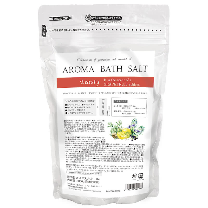 | ●品名:GA バスソルト Be 浴用化粧料 ●香り:グレープフルーツを主体とした香り ●内容量:1000g ●サイズ:160 x 233 x 73mm(パッケージ) ●全成分:塩化Na、海塩、レパゲルマニウム、グレープフルーツ果皮油*、ローズマリー葉油*、セイヨウネズ果実油*、イタリアイトスギ葉/実/茎油*、ヒバマタエキス、セイヨウキズタ葉/茎エキス、セイヨウナツユキソウ花エキス、スギナエキス、クレマティス葉エキス、ホホバ種子油、BG、水 *は植物から抽出した精油を使用しています。 ●発売元:株式会社デイリーアロマジャパン ●製造国:日本 MADE IN JAPAN ◎内容:エッセンシャルオイルのみで香りづけした体感バスソルト。約25回分のバスソルトが入ったお徳用サイズ。足湯なら約100回分お使いいただけます。軽量に便利なスプーン付き。 グレープフルーツを主体とした香り。気分をリフレッシュし、たっぷり汗を流したいときにオススメです。心地よい香りと温かさで、入浴タイムを癒しと美容のリラックスタイムに変えましょう。忙しい日常から一時離れて、毎日のお風呂を楽しみに! ☆配合精油:グレープフルーツ、ローズマリー、ジュニパー、サイプレス ◇ご使用方法:浴槽のお湯(200L)に本品スプーン4杯分(40g)1回分として入れてください。塩が完全に溶け切ったことを確認してください。入浴後はシャワーで汗を流し、十分に水分を補給してください。洗面器やバケツに本品スプーン1杯(10g)を入れてハンドバスやフットバスとしても使用できます。 【使用上の注意】 ・入浴以外の用途には使わないで下さい。 ・本品は食べられません。万一大量に飲み込んだ場合は水を飲ませるなどの処置を行なってください。 ・皮膚や体質に異常がある場合、妊娠中・乳幼児は医師に相談してから使用してください。 ・使用に際し肌に異常が見られた場合は使用を中止し医師に相談してください。 ・粒塩が完全に溶けたことを確認してから入浴してください。お湯の温度により、まれに粒塩が溶け残る場合がありますのでよくかき混ぜてください。 ・イオウは入っておりませんが、24時間風呂など入浴料の使用を認めていない浴槽・風呂釡では使用できません。追いだきしないでください。 ・浴槽や浴室がすべりやすくなりますので注意してください。 ・油分や色がつく恐れがあります。使用後はその日のうちに浴槽や風呂釜を洗浄してください。 ・残り湯は洗濯に使用しないでください。 ・直射日光や高温多湿を避けて保管してください。また開封後に保管が必要な場合は、密閉して冷暗所で保管し、早めに使い切るようにしてください。 ・お子様や認知症の方等の誤食に注意してください。 ・自然由来成分を使用しているため色や香りにばらつきがみられます。また海塩には不溶解物が含まれる可能性がありますが、品質には問題ありません。 |