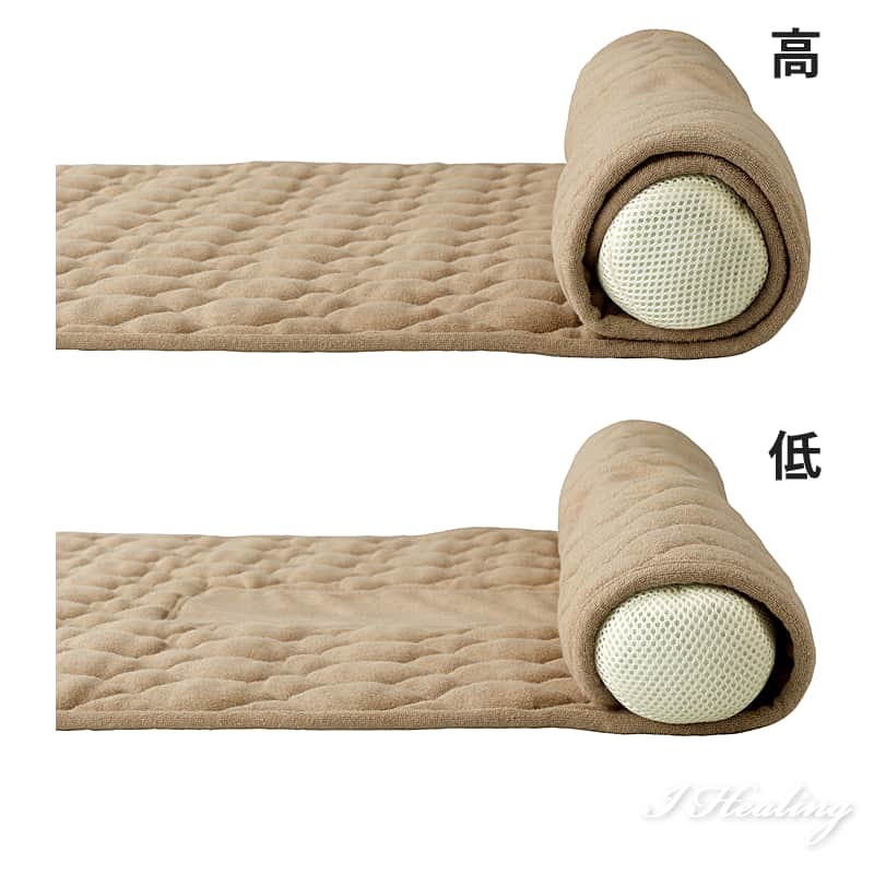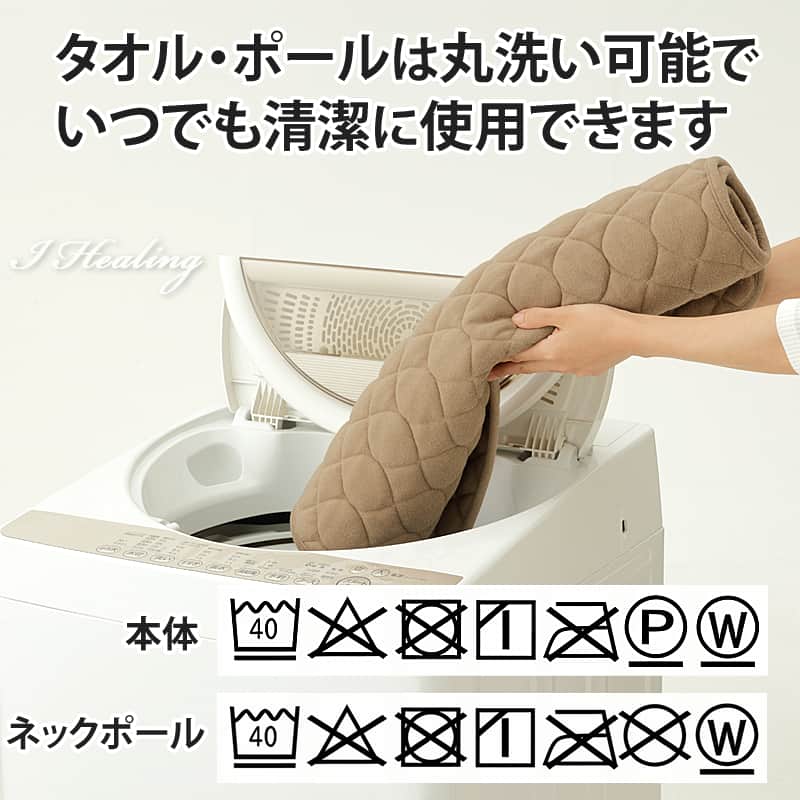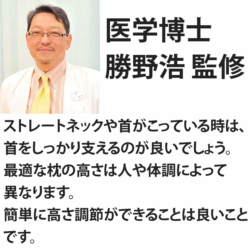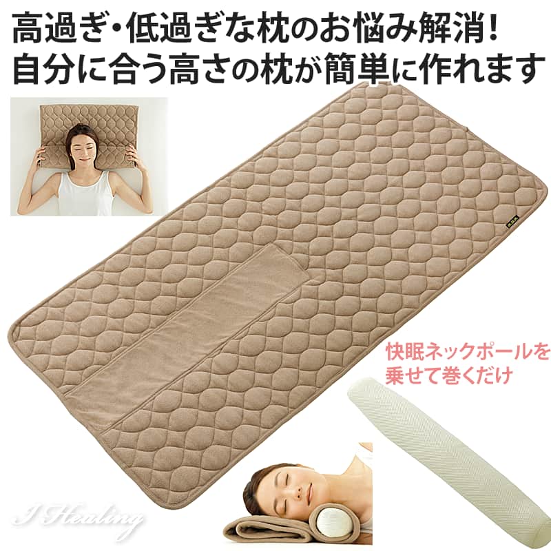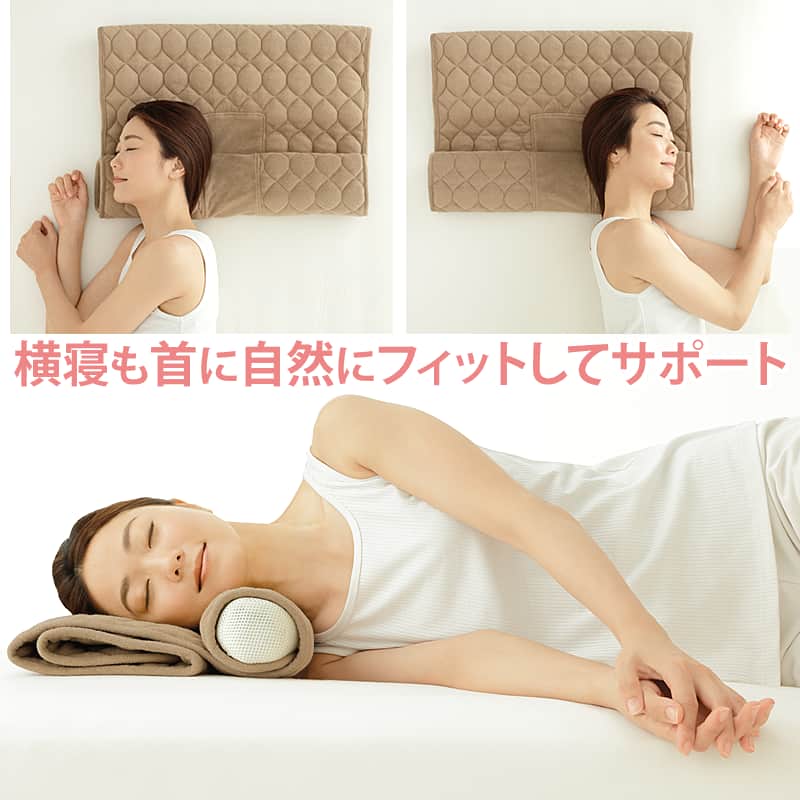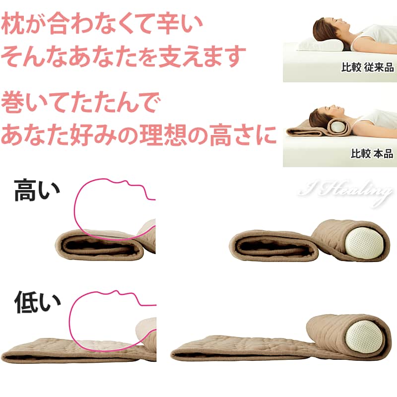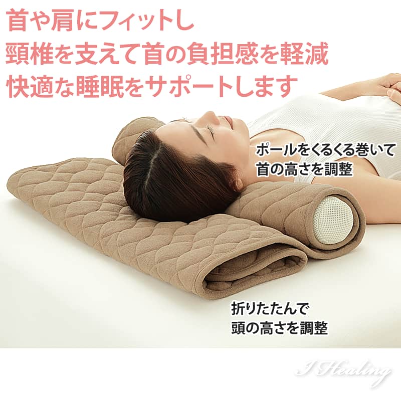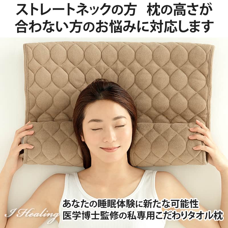 | ●アイヒーリング本店 公式 商品名:MDP 私専用こだわりのタオル枕 勝野 メイダイ わたしせんよう 拘り たおる マクラ ピロー かつのしき ストレートネック枕 よこむき寝 安眠枕 くび枕 自分で作る理想のまくら 洗える ウォッシャブル メンズ レディース 男女兼用 iHealing PILLOW ●まくら本体サイズ:幅120cm×奥行き56cm×厚さ1cm 440g、快眠ネックポール:径7×56cm 265g ●お届け時 袋サイズ:30×28×14cm、重さ755g ●材質 本体:綿75%・ポリエステル25%、中わた:ポリエステル100%、快眠ネックポール:ポリエステル100%、中材:ポリエチレン ●カラー:モカ色 茶色 ●製造:中国製(企画デザイン:日本) ●用途 おすすめ:枕 スマホネック スマホ首 テキストネック アッパークロスシンドローム 上位交差症候群 首枕 タオルまくら 横寝 横向き 寝返り 猫背 肩コリ 首コリ対策 ●販売店:アイヒーリング 正規販売店 ◎内容:首に心地よさを。ストレートネックの方、枕の高さが合わない方のお悩みに対応します。高い・低い 自分に合う高さの枕が簡単に作れます。 ふわふわの頚椎が安定する枕。首をしっかり支えて、快適な睡眠をサポートします。 タオル枕で頚椎の位置を整えることができ、首への負担感を軽減することができます。 枕の高さ調整可能。高過ぎ・低過ぎな枕のお悩み解消。 センター部分のくぼみが、布団と首のすき間をなくし首への負担感を軽減します。 快眠ネックポールに、くるくる巻くことで簡単に自分に合った高さが調節できます。 頭を乗せる部分も、折りたたみ方しだいで自分に合った高さの調節ができます。 両サイドが高くなっているので横寝でも肩への負担感を軽減します。 キルティングしたタオル生地を使用しているのでふわふわの肌触りです。 タオル素材だから毎日でも丸洗いできるので清潔に使用できます。快眠ネックポールも丸洗いできます。洗濯ネット使用。 あなただけの理想の高さをいつでも手軽に実現できます。 ストレートネックは筋肉のこわばりや悪い姿勢が原因です。スマートフォンやパソコンを長時間、同じ体勢で使用することで首が前に出てしまい、本来であれば少しカーブしている首の骨がまっすぐになってしまう状態を指します。この状態は、首への衝撃をバネのように吸収して、首の負担を防いでくれるカーブが失われ、衝撃を吸収しきれずに痛めやすくなってしまいます。 ストレートネックは別名、スマホ首・スマホネック・テキストネック・パソコン首とも呼ばれています。これらの名前は、ストレートネックの原因となる行動や習慣を反映しています。 ストレートネックの方は普段、上半身が前のめりの姿勢になられている方が多いです。1日の間で気づいた時に意識して、後頭部や体を軽く後ろに反らしてリラックスすることをおすすめします。 タオル枕の作り方と使い方 タオル枕がストレートネックの方におすすめな理由は、首の自然なカーブを保つことで、頸椎の圧力を分散させるからです。頸椎は、首の骨のことで、7つの椎骨からなります。頸椎は、頭を支えるだけでなく、脳と身体をつなぐ神経や血管を通す重要な役割も担っています。しかし、長時間のスマホやパソコンの使用、姿勢の悪さ、枕の高さの不適切さなどによって、頸椎がまっすぐになってしまうと、神経や血管に圧力がかかります。これがストレートネックの原因です。 ストレートネックは、首や肩の痛みやこりだけでなく、頭痛やめまい、吐き気、自律神経の乱れなどの症状を引き起こす可能性があります。そのため、ストレートネックを放置しないことが大切です。 タオル枕は、自分の首のカーブに合わせて高さや硬さを調整できるため、頸椎にかかる圧力を軽減することができます。タオル枕は、市販の枕よりも柔らかくてフィットしやすいため、首に沿って自然にカーブを作ることができます。タオル枕は、仰向けに寝るときに使うことで、首の後ろ側に当たる部分がやや高くなり、頸椎に自然なS字カーブを作ります。これによって、首の筋肉がリラックスし、神経や血管にかかる圧力が減ります。 手作りのタオル枕は、数枚のバスタオルなどを重ねて作ります。タオル枕は、市販の枕と違って、自分の首のカーブに合わせて高さや硬さを調整できます。タオル枕の作り方と使い方は以下の通りです。 タオル枕の作り方:バスタオルやフェイスタオルなどを用いてタオル枕を作ります。タオルを丸めてゴムバンドで固定するか、タオルケースに収納して固定します。タオルの長さや太さは、自分の首のカーブに合わせて調整します。タオル枕は、首の後ろ側に当たる部分が少し高くなるように作成すると良いでしょう。 タオル枕の使い方:タオル枕を普通の枕の上に置いて使います。寝る際は、仰向けになり、首をタオル枕に乗せます。タオル枕が首のカーブにフィットするように調整します。横向きに寝る際は、普通の枕だけを使います。タオル枕の使用時間は、初めは約10分から開始し、徐々に時間を延ば