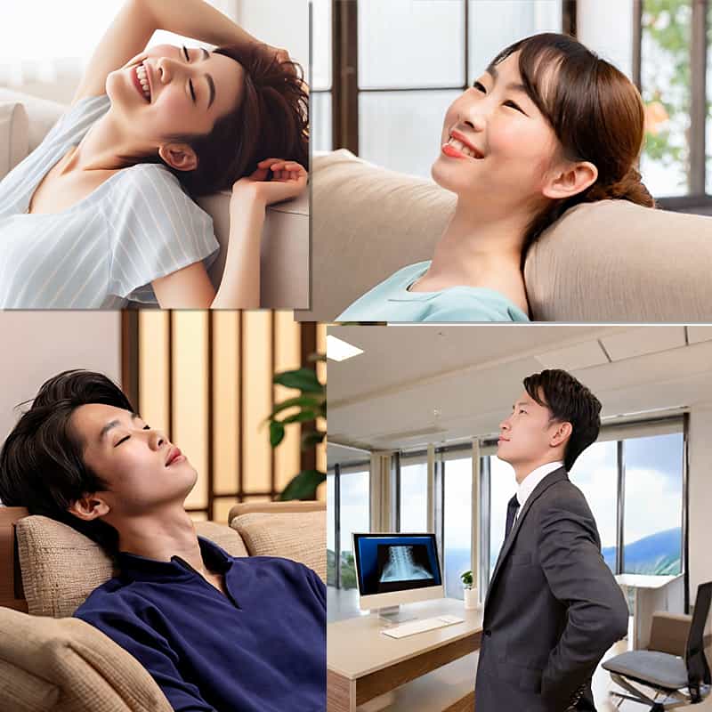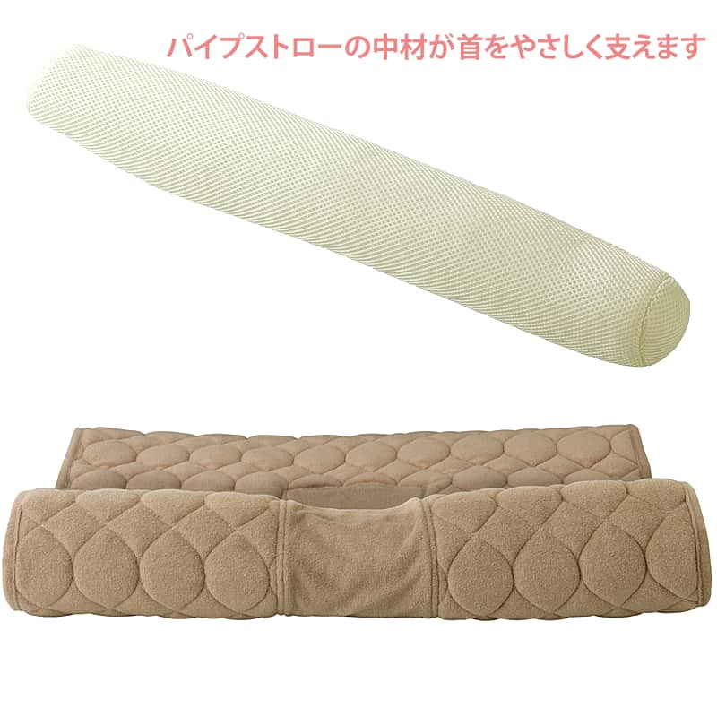 ![]() ![]() 首にぴったりフィットする ふわふわタオル枕 使い方はシンプルで簡単です。 1.ポールを置いて丸めます。 2.頭を載せる部分を折り畳み、調節します。 3.自分に合った快適な高さに調整して完成です。 高さが調整できるので、自分にピッタリの枕が簡単に作れます。芯部分のポールが首をしっかりと支えてくれます。また、タオル生地で丸洗いができるので、清潔に保つことができます。この枕は、首や肩のコリを和らげるという声も多数寄せられています。 ただし、巻きつけたタオルが解けやすいという意見や芯の部分がビーズで形が崩れやすいという意見もありました。そのため一部のお客様は芯部分を高反発素材や低反発素材などに変更されてご使用の方もいらっしゃいますが、これにはおすすめできません。完全なロール状だと横を向いたり寝返りを打つ時には、首が不安定になり良くないといわれています。完璧なロール状枕はやめて、形が崩れて枕が低くなっても平らに近い状態をおすすめします。また、どうしても会わない方はお手持ちのフェイスタオルなとを敷いて調整してください。 色については黒や白などの選択肢があると良いというお客様の意見もありますが、モカ色のみの販売です。しかし全体的には「購入してよかった」というお客様から満足の声が多く寄せられており、自分に合った高さに調整できることが評価されています。 ストレートネックの原因と対策についてお伝えします。ストレートネックとは、首の自然なカーブが失われてまっすぐになってしまう状態のことです。ストレートネックは、長時間同じ姿勢でパソコンやスマホを使ったり、枕が合わなかったりすることで起こりやすくなります。ストレートネックになると、首や肩のコリや痛み、頭痛やめまいなどの不快な症状が出ることがあります。 ストレートネックをなんとかするには、タオル枕を使うことがおすすめです。タオル枕とは、タオルを丸めて枕の下に敷くことで作ることができる枕のことです。タオル枕は、首のカーブに合わせて高さや硬さを調整できるので、首に適度な負荷をかけて筋肉を刺激することができます。タオル枕を使うことで、首のカーブを取り戻すことが期待されます。 しかし、タオル枕だけでは首を元の状態に戻すことは難しいです。タオル枕と一緒に、他の方法も試してみましょう。例えば、ストレッチや筋トレで首の筋肉をほぐしたり、適度な運動をしたり、背筋を伸ばし顎を引き軽く胸を張る、姿勢を正したりすることが大切です。また、接骨院や整体院、整形外科などの専門家に相談するのも良いでしょう。 ストレートネック予防のためのストレッチや運動 ストレートネックの予防に役立つストレッチや運動を紹介します。これらの運動は、自宅で簡単にできるものばかりです。家事や仕事の合間、お風呂など空いた時間に、毎日数分間でも続けることで、首の状態が良くなることが期待できます。 ストレッチは、硬くなった首や僧帽筋の筋肉を柔らかくすることができます。コリや痛みを和らげることもあります。以下のようなストレッチや運動を試してみましょう。 歩く・散歩・ウォーキング:頭が上に引っ張られているようなイメージを持ちつつ、胸を張ることを意識して背筋を伸ばす姿勢で歩いてください。顎を軽く引き、肩に力を入れず、腰が反らないように注意してください。必ず腕を後ろに振りながら歩いてください。ウォーキング中は、腕を振ることが重要です。握りこぶしを作り、両肘を90度に曲げて前後に振ると、背中や肩の筋肉が刺激され、ウォーキングの効果が高まります。特に、腕を後ろに大きく引く動きがポイントです。この動きにより肩甲骨が活発に動きます。 胸を反らすストレッチ:両手を後ろで組み、胸を反らせます。首の前側が伸びる感覚があります。3-5秒キープして3回繰り返します。 寝ながら背中のストレッチ:仰向けの体勢で力を抜きつつ、両手を組んだまま頭の上に両手を上げます。手が床に触れたら2-3秒キープし、その後両手をお腹の方に戻します。これを10回行います。ポイントは、腕を伸ばすときに無理に引っ張らず、必ず脱力してリラックスした状態で行うことです。 肩甲骨引きストレッチ:背筋を伸ばし、肩甲骨を背骨に寄せて顎を後ろに引きます。胸を張ったいい姿勢になります。5秒キープして3回繰り返します。 首を後方に伸ばすストレッチ:目線を上に向けて、ゆっくり顔を上に上げます。首の前側が伸びる感じがします。3-5秒キープして3回繰り返します。 首を前後に傾ける運動:ゆっくり首を前に倒して顎を胸に近づけます。次に、首を後ろに倒して顎を上に上げます。10回程度行います。 首を左右に傾ける運動:ゆっくり首を左に倒して耳を肩に近づけます。次に、首を右に倒して耳を肩に近づけます。10回程度行います。 首回し運動:首を左右にゆっくり回します。首の周りがほぐれる感覚があります。10回程度行います。 筋ト