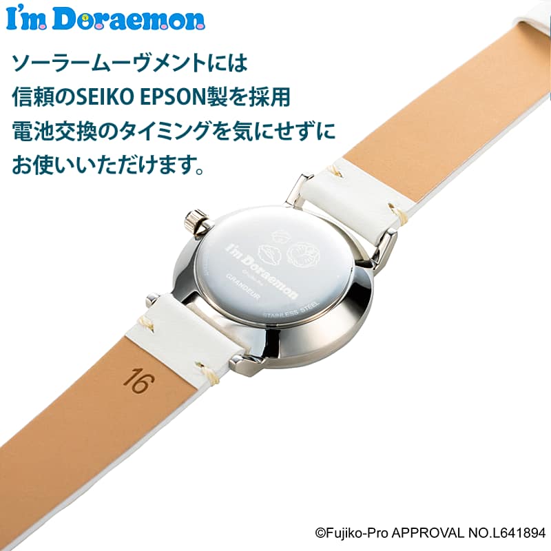 | ●アイヒーリング本店 公式 商品名:ドラえもん青空さんぽモデル ウォッチ i'mドラえもん うでどけい 女性 ソーラー腕時計 ファッション アクセサリー GSW005D WHITE iHealing LADIES SOLAR WATCH WATER RESISTANT STAINLESS STEEL ●ブランド メーカー:I'm Doraemon GRANDEUR・アイムドラえもん グランドール 株式会社マルゼキ MARUZEKI ●型番・品番:GSW005D2 ●文字盤カラー ケース色:ホワイト色 白 ●時計サイズ:直径31mm×厚度6.5mm、特別化粧箱サイズ:幅82mm×高さ27mm×奥行63mm 重さ100g ●バンドサイズ:幅16mm 手首周り14-18cm ●重量:28g ●材質 ケース素材:ステンレスシルバー、バンド素材:牛革(イタリアンレザー)、風防:ミネラルガラス ●ムーブメント:SEIKO EPSON ●防水性:日常生活防水 ●製造:日本製 MADE IN JAPAN ●用途 おすすめ:レディース腕時計 普段使い カジュアル イベント 贈り物 ●販売店:アイヒーリング 正規販売店 ●セット内容:本体 ドラえもん時計・専用箱・保証書 保証期間1年 ◎内容:ドラえもんと一緒に青い空を歩こう。清楚感とキュートさが溢れる腕時計。ドラえもんが文字盤にあしらわれたドラえもんソーラーレディースウォッチ。 ホワイトのイタリアンレザーが肌に馴染みます。GRANDEURレディースウォッチは、電池交換不要のソーラー式で安心して使えます。 ドラえもんと時間を大切にする、あなたの毎日を明るくする魔法のアイテムです。 手描きタッチのかわいいけどおしゃれなドラえもん腕時計。 「I'm Doraemon」より新たにソーラーレディースウォッチ。 高品質と遊び心が特徴のウォッチブランド「GRANDEUR」のソーラーウォッチモデルから「I'm Doraemon」シリーズ「ドラえもん青空さんぽモデル」が登場。 薄型&軽量ケースで身につけやすいソーラーレディースウォッチ。 やわらかい手触りのイタリアンレザーを使用した革ベルトは、白い雲をイメージしたホワイトカラー。 ドラえもんが雲の上で散歩する様子が、立体的に描かれたキュートな文字盤。 ドラえもんや、どこでもドア・雲ねんど・きんとフードなどのひみつ道具が風防ガラスと文字盤に描かれることによって、時計の中に奥行きある世界観が表現されています。 作品のワンシーンを切り取ったような、癒しを与えてくれるアイテムです。 ソーラームーブメントには、信頼のSEIKO EPSON製を採用。フル充電で4ヶ月稼働可能。 電池交換のタイミングを気にせずにお使いいただけます。 当店では、雲の上でお昼寝をするドラえもんのアートステッカーが貼られた特別化粧箱でお届けします。 ドラえもんと同じ青色の化粧箱には、時計とは別のアートが描かれた特別ステッカー付きパッケージ 。 プレゼントや頑張った自分へのご褒美としてもオススメです。ギフト ラッピング対応しています。 ※使用後は、電池を長く保たせるために定期的に太陽光の当たるところに置いてください。 |