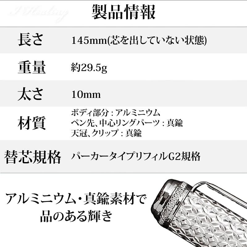 | ●アイヒーリング本店 公式 商品名:PLUS LINKボールペン 退職祝 たいしょくいわい ティア ドロップ 水や涙のしずく型 筆記具 高級ボールペン ぷらすりんく ぼーるぺん Ballpoint pen iHealing Tiara ティアドロップ柄ペン ティアラペン ●ボールペンサイズ:長さ145mm(芯を出していない状態)、太さ10mm ●重量:29.5g ●専用化粧箱(ペン込)サイズ:19cm×7cm×4cm、重さ210g ●材質 ボディ部分:アルミニウム、ペン先・中心リングパーツ:真鍮、天冠・クリップ:真鍮 ●替え芯規格:パーカータイプ リフィルG2規格 ●紋様:しずくの模様 ●販売店:アイヒーリング 正規販売店 ●説明書:有 ●保証期間:1年 ●用途・おすすめ:退職祝い・退職記念品・退職者・退職される方や退職された方へのお祝い 男性 女性・ビジネスパートナー・クライアント・餞別 送別の品・相手に敬意と感謝の気持ちを伝える・これからの新たな道へのエールを込めて贈る・美しいデザインと職人技に魅了された方・贈り物・自分の努力や成果を認めて自分に贈るシーン ●セット内容:ボールペン本体・化粧箱 ●製造・発売元 メーカー ブランド:日本製 Made in Japan 株式会社ティアラ ◎内容:大切な方への想いを届ける筆記具。ジュエリーメーカーが創る美しいボールペンをお届けします。相手の長年の努力や貢献に感謝と尊敬の気持ちを込めて、リスタート後も潤いと実りある豊かな歩みを願います。 「ティアドロップ柄」:さらに成長するエネルギーを願います。 経験55年、創業35年の宝飾メーカーがつくりあげたジュエリーのような輝きのボールペンです。細部にも施した美しいカットとアルミニウム・真鍮素材で品のある輝きを放ちます。 独自のティアラカットで、すべての工程を人の手で1本ずつ製作しました。古くからの文様やモチーフを施したアルミ製のボディは重すぎず、程良い重量感がある逸品のボールペンです。 専用の化粧箱に入れてお届けします。化粧箱はシンプルで上品なデザインで、ボールペンの美しさを引き立てます。 いつも傍にある「一生モノ」に。今までにない斬新な高級感のあるデザインで、記念品、プレゼント、自分へのご褒美に最適な逸品です。 |