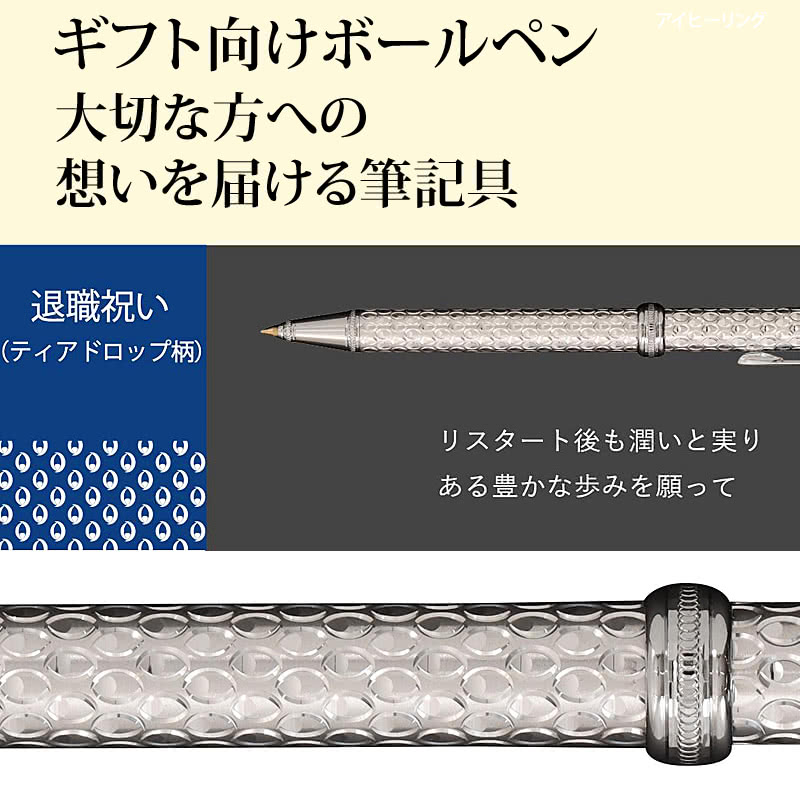 ![]() 想いを届けるために生まれた高級ボールペン がんばったね・お疲れさま・ありがとう・ずっと応援しているよ。 大切な方への、大切な想いはちゃんと届いてほしいから。 「PLUS LINK」は、昔から人々に愛されてきた文様やモチーフになぞらえて、贈る方の想いをデザインにのせたギフト筆記具です。 想いよ、届け。 退職祝い 職務を全うしたことに対する尊敬の念を込めて。 退職祝いに贈るなら、このボールペンがおすすめ あなたの大切な方が長年勤めた会社を退職されるとき、どんな贈り物を選びますか? 花束やお菓子、ネクタイやハンカチなど、定番の贈り物はたくさんあります。しかし、退職される方は、これまでの仕事や人間関係に対する感謝や惜しみ、そしてこれからの人生に対する不安や期待など、様々な感情を抱いていることでしょう。 そんな方に贈るなら、ただの物ではなく、想いを伝えることができる贈り物がおすすめです。 このボールペンは、PLUS LINKボールペン 退職祝い ティアドロップ柄という名前で、ジュエリーメーカーが創り出した、まるで宝石のような輝きと美しさを持つ逸品です。 ティアドロップ柄という名前の由来は、このボールペンが水や涙のしずく型のデザインをしていることから来ています。これは、乾いた大地に潤いを与える雨のように、リスタート後の新たな一歩に成長するエネルギーを願っていることを表しています。退職される方には、これまでの感謝の気持ちとともに、これからの日々が一層心豊かであることを応援するメッセージが込められています。 このように、このボールペンは、退職祝いに贈るなら、最適な贈り物です。 ![]() PLUS LINKボールペンがギフトに選ばれる理由 手に取るたびに輝くティアラカット ダイヤモンドカットで文様を描く独自の技術。ティアラカットとは時計王国スイスで培われた技術をジュエリー加工に応用、さらにさまざまな文様を描くため磨き上げた技術です。文字を紡ぐたび、手に取るたびに細やかなデザインが手元できらめきます。 熟練の職人が一つずつ手作り ひとつひとつ切削する熟練の技術。熟練の職人が一つ、また一つと手仕事で作っています。ペン先の口金、ペン中央のリング、胸ポケットに挿したときにきらりと光る天冠も機械に頼らず、その目でしっかりと確かめながら仕上げます。 ![]() 筆記具としても高品質 なめらかな書き心地 ペン軸を回転させてペン先を出す「ツイスト式」。 ノック音がしないので、ビジネスシーンにも最適です。静かな場所でも気兼ねなく使用できます。 マイルドな書き心地の油性インク。リフィル(インク)は、汎用性の高い0.7mm芯を使用しています。市販のパーカータイプリフィルG2規格対応。適切なお手入れで一生付き合えるパートナーに。 ほどよい重さと手馴染みのよい太さは持ちやすく、長時間の使用でも疲れにくい設計です。 ![]() 退職のお祝いに「ティアドロップ柄」 乾いた大地に潤いを与える雨は、昔から「神々が流す涙のしずく」、つまり「ティアドロップ柄」として、生きるエネルギーと紐づけて崇められてきました。これまでの感謝の気持ちとともに、これからの日々が一層心豊かであることを願ってデザインされました。 ギフトラッピングで、贈り物を一層引き立てます PLUS LINKボールペンは、その美しさと機能性で既に素晴らしい贈り物となっています。しかし、私たちはお客様にさらに特別な体験を提供したいと考えています。そのため、ご希望のお客様には、無料のギフトラッピングサービスとメッセージカードサービスを提供しています。また、どちらか一方だけの利用も可能です。 このサービスを利用すると、ボールペンは化粧箱の上からラッピングされ、リボンで飾られます。さらに、お客様からのメッセージを記入したカードをギフトボックスに添えます。これにより、お客様の贈り物は、ただのボールペンから、心からのメッセージを伝える特別な贈り物に変わります。 ギフトラッピングは、卒業祝いや誕生日、記念日など、特別な日に最適です。また、ビジネスのパートナーやクライアントへの感謝の意を示す贈り物としても最適です。どんな場合でも、お客様の贈り物は忘れられないものになることでしょう。 PLUS LINKボールペンと一緒に、あなたの想いを届けましょう。 |
