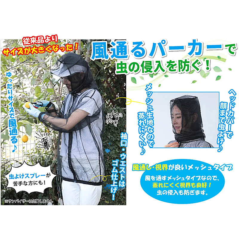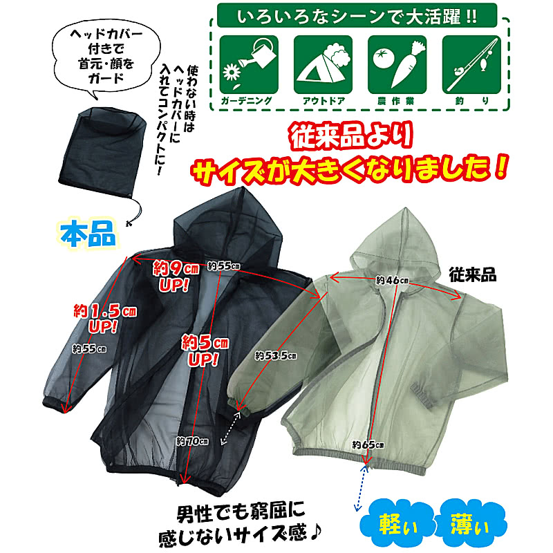 ●品名:風通る虫よけメッシュパーカー ヘッドカバー付き メッシュ素材 フリーサイズ 夏用 ガーデニング アウトドア ●型番:FP-411 ●適応サイズ 男女兼用 胸囲(約):80~112cm、適応身長(約):155~180cm 手首周り:18~26cm、ウエスト周り:59~106cm ●ヘッドカバーサイズ(約):幅36.5 x 高さ40cm ●重量:約95g ●素材・材質:本体・ヘッドカバー:ポリエステル100%、ヘッドカバー留め具:PP ●用途・おすすめ:夏場のアウトドアやガーデニングでの虫よけ対策 ●原産地:ベトナム ●販売元:富士パックス販売株式会社 ●セット内容:本体、ヘッドカバー ◎内容:風通る虫よけメッシュパーカーは、メッシュ素材で通気性が良く、夏場でも蒸れにくいフリーサイズのパーカーです。着るだけで簡単に虫よけ対策ができるため、虫よけスプレーが苦手な方にもおすすめです。フードとヘッドカバーが付いており、首元や顔もしっかりガードします。夏場のアウトドアやガーデニングに最適なアイテムです。 |