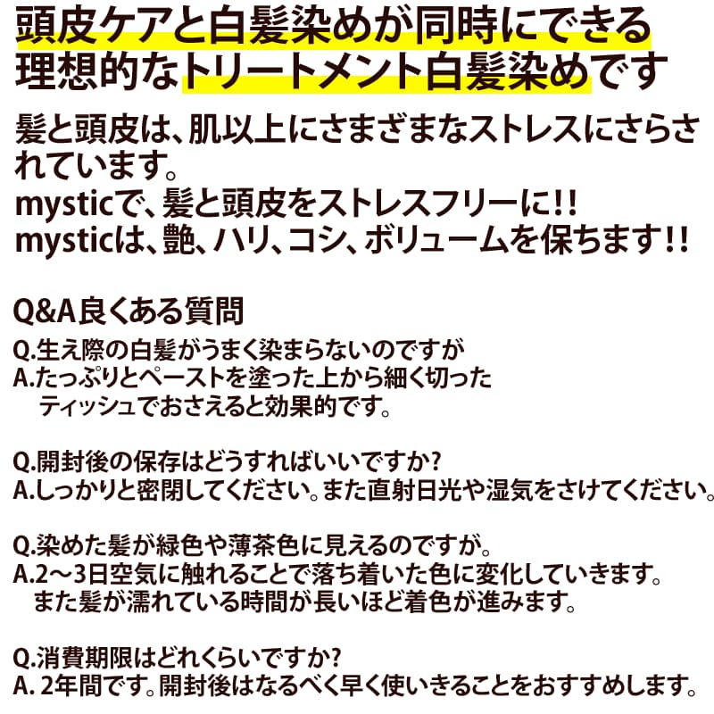 ![]() トリートメント白髪染め mysticは、頭皮ケアと白髪染めが同時にできる理想的なトリートメント白髪染めです。 髪と頭皮は、肌以上にさまざまなストレスにさらされています。 mysticで、髪と頭皮をストレスフリーに保ちます。mysticは、艶、ハリ、コシ、ボリュームを保ちます。 ■トリプルAヘナ mysticダークブラウン タイプ別の仕上がり 白髪がない方:全体が暗く深みのある色に。 白髪が少ない方:白髪部分が落ち着いた茶色に仕上がリます。 白髪が多い方:全体的に自然に。 染め時間:単品使用で40分。べーシックトリートメントを使うことで20分。 こんな方におすすめの自宅でヘアエステ 傷んだ髪・パサパサの髪を、潤いのある艷やかな髪に。 ネコっ毛やペタッとした髪を、ボリュームアップし、ハリ・コシのある髪に。 クセ毛やゴワゴワした髪を、しっとりまとまりのある髪に。 かぶれや敏感肌の方に。毛穴をさっぱりさせ、頭皮を健やかに。 ![]() 洗髪後は髪が緑色や薄茶色に見える場合がありますが、空気に触れて2-3日で本来の落ち着いた色に変化します。 また、髪が濡れている時間が長いほど着色が進みます。 キレイに染めるポイント 量はたっぷりと使いましょう。 分け目をきっちり取ると塗りやすくムラなく仕上がります。 白髪染めは2度染めがおすすめです。 ![]() mysticの使用方法には、1度染めと2度染めがあります。 2度染めは「ベーシックトリートメント」を先に使用し、他カラーを後から使用する方法です。 2度染めをすることで、ブラウン系の色はより鮮やかにより深みのある色に仕上がります。トリートメント効果も上がります。 2度染めの場合、ベーシックトリートメントを塗布して、20分放置した後洗い流します。 濡れたままの状態で構いませんので、その後にお好みのライトブラウンorブラウンorダークブラウンを塗布して20分放置してください。 その後シャンプーを使って洗い流します。 ベーシックトリートメントを使った時、白髪が明るいオレンジ色に染まりますが、その後、お好みのライトブラウンorブラウンorダークブラウンを塗布していただくことでお好みのブラウン系の色に綺麗に変化していきます。 なぜmysticは二度染めをオススメするのか 白髪の多い方には、ベーシックトリートメントをブラウン系のカラーの前に使うことで、エイジングケアのための頭皮ケア、キューティクルケアの働きと同時に、白髪染めのベースの働きで、次にのせるブラウン系各色をより深く根元まで綺麗に染めることができます。 また、単品使用の半分の放置時間(20分)でお好みの色に染めることができます。 もちろんブラウン系各色だけで1度染めする事でも綺麗な発色を望むことができますが、2度染めの効果や違いもぜひご体感ください。 ![]() ■最良をもとめた、安全の証 トリプルA認定商品 世界最大級のヘナメーカー、インドの「ヘナインダストリー社」と日本一のヘナの団体「一般社団法人自然ヘナ・シロダーラ研究会」の厳正な審査により認定された規格品です。 エコサート認定商品 フランスに本部を持つ、「オーガニック認証団体の世界基準」と言われる国際有機認証機関です。 国際的な第一級の有機認定マークのひとつとして、高い評判と信頼を得ています。国際有機認定機関としては、世界最大規模の団体です。 USDA認定商品 米国農務省(USDA)の認可を受けた認定機関が審査を行ない、オーガニックと認められた証です。 トリプルA認定ヘナ mystic オーガニックヘナ ダークブラウン 自然の力で美しい髪へ。白髪を深みのあるダークブラウンに自然に染め上げるだけでなく、髪と頭皮に優しい天然植物成分を使用しています。国内唯一のトリプルA認定、エコサート、USDA認定を受けた最高品質のオーガニックヘナです。頭皮ケアをしながら白髪染めをしたい方、敏感肌の方、化学成分を避けたい方におすすめです。 |