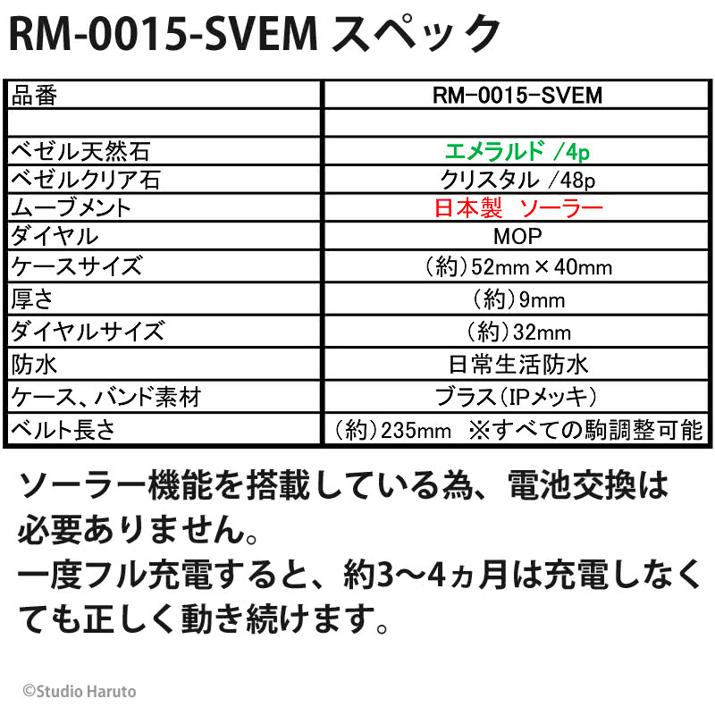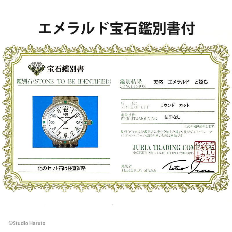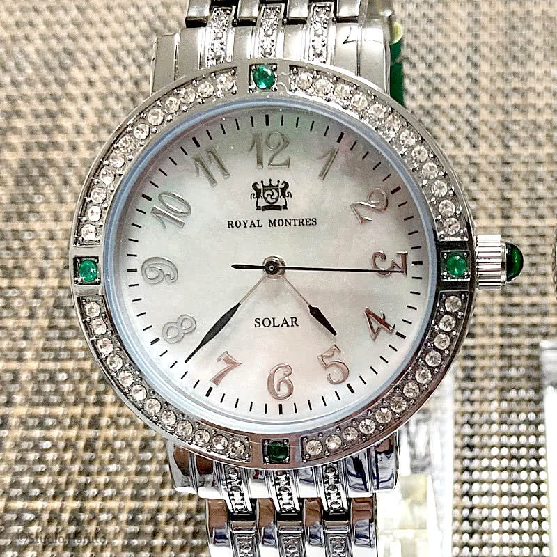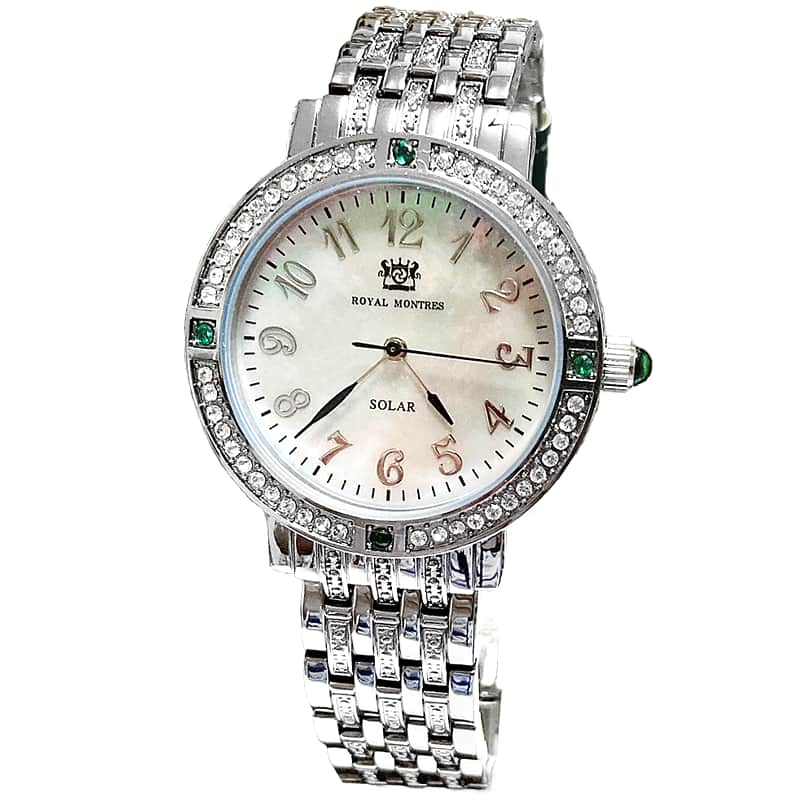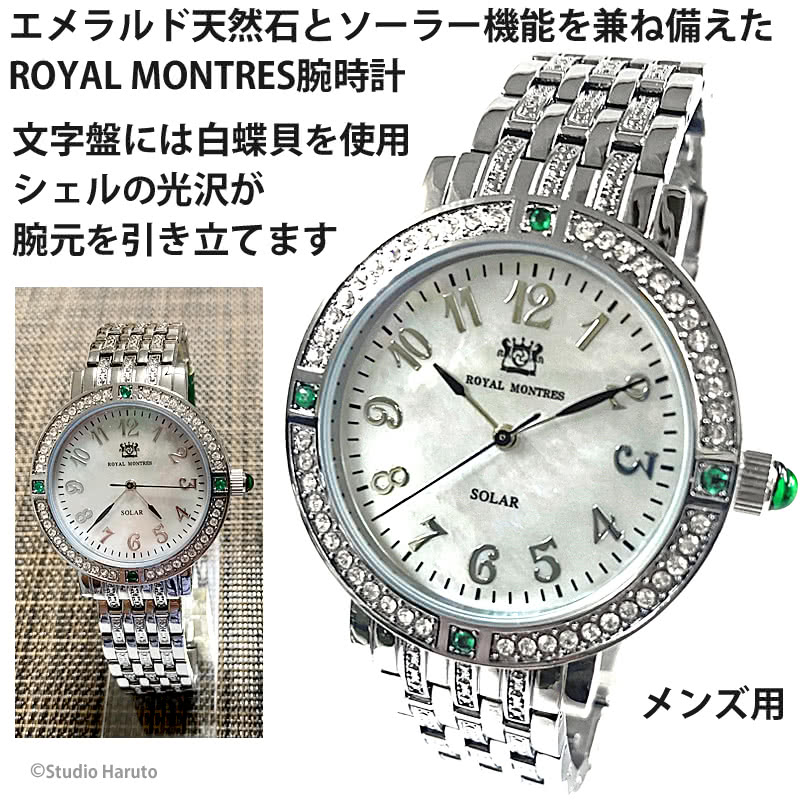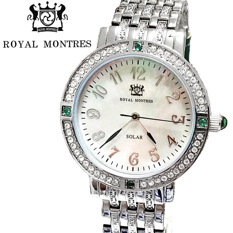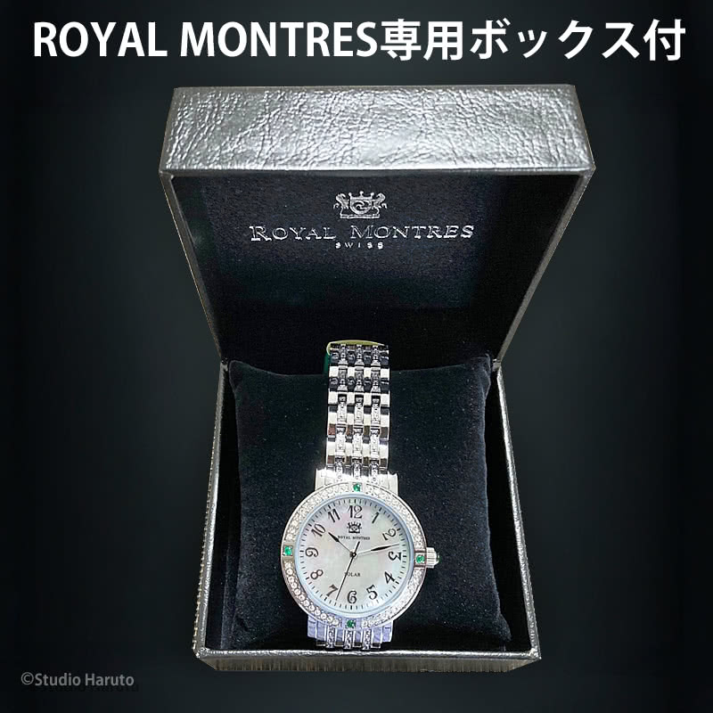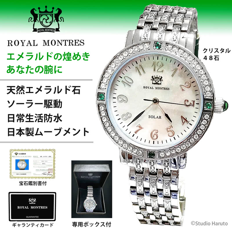 ROYAL MONTRES エメラルド天然石 ソーラー腕時計 RM-0015-SVEL レディース 宝石鑑別書付 日常防水 白蝶貝文字盤 クリスタル48石 ロイヤルモントレス