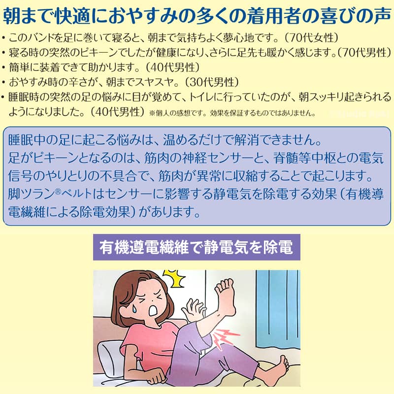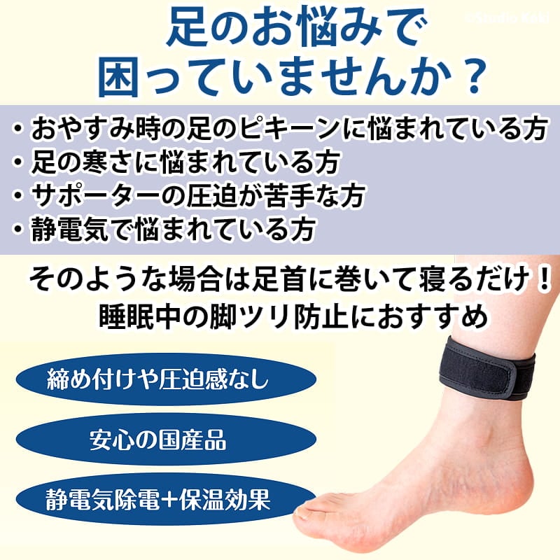 ![]() ![]() ![]() ■開発者の紹介 Dr.style整体院 院長 土信田裕介 筋膜整体の先駆者 保有資格・認定資格:FFT協会代表 柔道整復師、筋膜整体師としての業界歴9年 足がつる原因としては、食事による栄養不足、水分不足、体の運動不足、急激な寒暖差による冷え、または病気などが考えられます。まずは生活習慣を見直し、必要に応じて専門家に相談してください。 この商品は補助的なサポーターであり、過度な期待は避けてください。特に、足を温めることや、筋肉の硬直を緩め、水分と栄養をしっかり補給することが重要です。簡単にできる方法としては、足湯やストレッチ、白湯を飲むのもおすすめです。 朝まで快適に 着用者の喜びの声 このバンドを足に巻いて寝ると、朝まで気持ちよく夢心地です。 (70代女性) 寝る時の突然のピキーンでしたが健康になり、さらに足先も暖かく感じます。 (70代男性) 簡単に装着できて助かります。 (40代男性) おやすみ時の辛さが、朝までスヤスヤ。 (30代男性) 睡眠時の突然の足の悩みに目が覚めて、トイレに行っていたのが、朝スッキリ起きられるようになりました。 (40代男性) ※個人の感想であり、効果を保証するものではありません。 ただ、一部の方からは、すぐには効果を感じられなかったという声もあります。特に、使用初日には効果があったものの、数日後に再び足がつったという報告もあります。しかし、継続して使用することで改善したというケースも多く見られますので、焦らずに続けてみてください。 脚ツランベルト 標準サイズは、初めてお使いになる方や、こむら返りにお悩みの方にぴったりの入門モデルです。足首に巻くだけの簡単な使い方で、すぐに効果を実感でき、夜間の足のつりや冷えに悩む方にも安心してお試しいただけます。 お手頃な価格と使いやすさで、就寝中の悩みを解消し、快適な睡眠をサポートします。この機会に、脚ツランベルトで心地よい夜を手に入れてみませんか? ご使用上の注意 金属アレルギーの方はご使用をお避けください。 皮膚の弱い方やアレルギー体質、また肌に傷や湿疹、かぶれなど異常がある場合は使用しないでください。 使用中や使用後に肌にかゆみなどの異常が生じた場合は、すぐに使用を中止し、医師に相談してください。 除電効果には個人差があり、ご使用環境によって異なる場合があります。 本品は洗濯できますが、ネットを使用してください。塩素系漂白剤の使用はお避けください。アイロンも不可です。 本製品は、使用目的以外には使用しないでください。 幼児の手の届かない場所に保管してください。 効果が薄れてきた頃が買い替えの目安です。(目安として1年程度) |