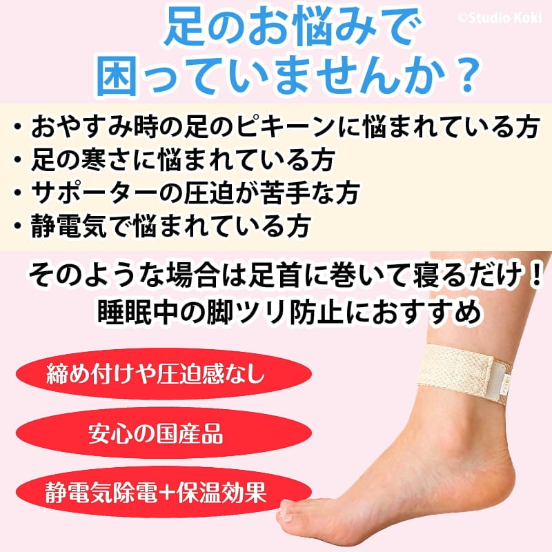 | ●アイヒーリング本店 公式 商品名:足首用ベルト 脚ツラン ベルト メッシュ あしつらん 2本入り 特許 健康器具 睡眠グッズ 足首 除電 こむらがえり 足のつり予防 アンクルベルト 圧迫感なしサポーター iHealing ashitsuranmesh ●ブランド:脚ツラン ●セット内容:ベルト2本 ●本体サイズ:約幅3.6cm×長さ27.5cm ●対応サイズ:足首周り16~26cm ●カラー:ベージュ ●重量:8g(2本) ●素材・材質 表地:ポリエステルメッシュ100%、中地:レーヨン80%・アクリル20%、裏地:ポリエステル100%、その他:導電繊維 ●使用方法:足首に巻く ●用途・おすすめ:体内にたまった静電気を除電し脚のつり予防に役立つ、夜間の脚のこむら返りに悩む方、睡眠中に足がつりやすい高齢者や中年層の女性・男性、こむら返り予防、足攣り ふくらはぎの痙攣、寒さ、足が寒くて眠れない方、足の冷え対策、保温、プレゼント ●発売元:株式会社蘭華 ●製造:日本製 ◎内容:就寝時に足首に巻くだけで、脚がつらないメッシュベルトです。足のつりやこむら返りに悩んでいる方へ、もう悩まないでください。軽量で通気性に優れたメッシュ素材を使用しているため、長時間の使用でも蒸れにくく、快適な着け心地を保ちます。脚のケアを、より心地よくスマートにサポートします。 脚ツランメッシュは、就寝中に足首に巻くだけで、脚のつりや冷えを予防するために開発された製品です。このメッシュベルトは、Dr.style整体師の土信田裕介院長との共同開発により、体内に蓄積された静電気を除電し、筋肉の正常な働きを促して脚のつりを防ぎます。特に夜間に脚がつりやすい方や、冷えに悩む方におすすめです。 足のお悩みで困っていませんか? ・おやすみ時の足のピキーンに悩まれている方 ・足の寒さに悩まれている方 ・サポーターの圧迫が苦手な方 ・静電気で悩まれている方 そんな方には、このベルトを足首に巻いて寝るだけでOKです。 締め付け感なし・圧迫感なし・安心の日本製 静電気除電と保温効果を兼ね備えており、足首に簡単に巻くだけで使用可能です。面テープでサイズ調整ができるので、圧迫感が少なく、サポーターが苦手な方にも快適にお使いいただけます。また、ネットに入れて洗濯可能なため、衛生的にも安心です。 ■使用方法 導電繊維テープが足に触れるように、足首に巻いてください。毎晩の使用が推奨されており、体質によっては3日から1週間で効果が現れることがあります。継続して使用することで、脚のつりや冷えを防ぎ、快適な睡眠をサポートします。就寝時はもちろん、日中の使用も可能です。 |