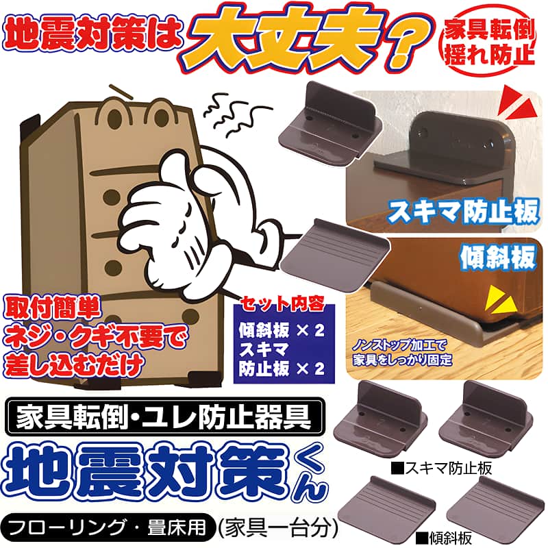 | ■地震対策くんの特徴と取り付け方 クサビの原理で家具をしっかり固定 地震対策くんには、家具の下に差し込むための傾斜板が付属しています。この傾斜板は、クサビの原理を利用して家具をしっかりと支え、揺れやすい家具を安定させます。地震時の揺れを抑制し、家具の転倒リスクを大幅に軽減します。 ノンスリップ加工で滑り止め効果アップ 傾斜板の裏側にはノンスリップ加工が施されており、滑りやすい床の上でも家具をしっかり固定できます。従来品に比べて約2倍の滑り荷重に耐えるため、より安心です。 壁と家具の隙間を埋める隙間防止板 セットには「隙間防止板」が含まれており、壁と家具の間に隙間がある場合でも対応可能です。この板を使用することで、家具が前方に倒れるリスクを抑え、壁と家具が密着することで地震対策効果がさらに高まります。タンスや食器棚など、さまざまな家具の転倒防止に役立ちます。 ■地震対策くんのメリットと注意点 簡単取り付けで初心者でも安心 ネジやクギを使わず、家具の下に差し込むだけで設置できるため、どなたでも簡単に取り付け可能です。一人暮らしの方や高齢者でも手軽に設置できます。 使用できない場合がある 「地震対策くん」は、家具の後ろに壁がない場合には使用できません。家具と壁が密着している必要があるため、部屋の中央に配置された家具には適しません。また、大きな隙間がある場合は隙間防止板が適用できない場合もあるため注意が必要です。 小ぶりでインテリアに馴染むデザイン ブラウン色で、家具と調和しやすいデザインです。設置後も違和感なく、お部屋に馴染みます。また、小さくて目立たないため、設置後も違和感がありません。 安価でできる地震対策 手頃な価格で簡単に地震対策ができる点が好評ですが、製品が華奢に見えるため、効果に対する不安の声もあります。本当に地震の際に家具を支えられるか疑問に感じる意見もありますので、ご心配な方は安心感を得るために他の耐震グッズとの併用をおすすめします。 地震対策くんは1セットで1つの家具の転倒を防止できますが、ご自宅には他にも大切な家具がたくさんあるのではないでしょうか。もしもの時にすべての家具をしっかり守りたいとお考えでしたら、転倒が気になる家具の数だけ、ぜひ複数の地震対策くんをご用意いただくことをおすすめします。 地震対策は早めの準備が大切です。地震の揺れからご家族の安全を守り、大切な思い出の品々も守るために、この機会にご自宅のすべての家具に地震対策くんを取り付け、安心できる暮らしを送りましょう。 |