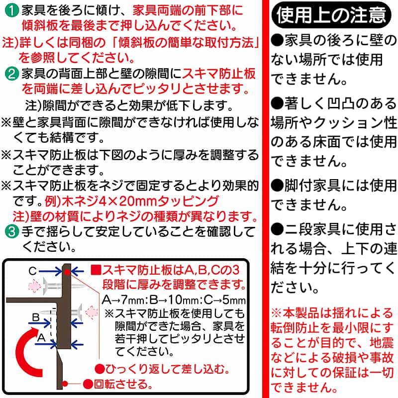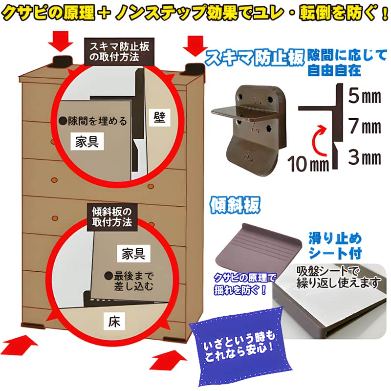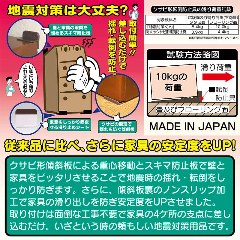 | ●商品名:地震対策くん2 家具転倒防止 ストッパー 耐震 防災用 防災グッズ セーブインダストリー ●サイズ 傾斜板:7×6×1cm 隙間防止板:5×6×3cm ●カラー:ブラウン ●重量:46g ●材質 本体:ポリプロピレン樹脂、シート:アクリル樹脂 ●使用方法:家具に差し込みます ●用途・おすすめ:家具固定、タンス、本棚、食器棚、収納棚、お子様がいらっしゃるご家庭 ●製造:日本製 ●セット内容:傾斜板2個、隙間防止板2個、取扱説明書 ◎内容:「地震対策くん」は、簡単に取り付けられる家具転倒防止グッズです。特に地震時に食器棚やタンスなどの家具が揺れ、転倒してしまうリスクを軽減するために開発されました。この製品はネジやクギを使わずに差し込むだけで設置可能で、クサビの原理とノンスリップ加工で家具をしっかり固定します。さらに、壁と家具の隙間を埋める「隙間防止板」がセットになっており、安定感が向上。いざという時に役立つ頼もしい地震対策用品です。 特徴 取付簡単(ネジ・クギ不要)、差し込むだけで揺れ・転倒を防止。 上部には壁と家具の隙間を埋める隙間防止板も付いています。家具をしっかり固定する滑り止めシートで安心度UP。吸盤シートで繰り返し使えます。 スキマ防止板で壁と家具をピタッと。 傾斜板による重心移動と吸盤シートの滑り止め効果で家具の安定感を高めました。 クサビの原理と滑り止め効果を組み合わせることで、従来の物より約2倍以上の滑り荷重を防ぐ効果があります。 釘やネジで固定する事も可能です。 使用上の注意 家具の後ろに壁のない場所では使用できません。 著しく凹凸のある場所やクッション性のある床面では使用できません。 脚付家具には使用できません。 ニ段家具に使用される場合、上下の連結を十分に行ってください。 ※本製品は揺れによる転倒防止を最小限にすることが目的で、地震などによる破損や事故に対しての保証は一切できません。 |