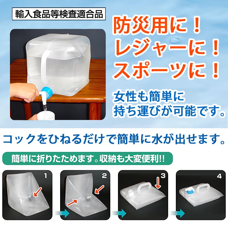 | ●商品名:折りたたみ式 ウォータータンク 防災用品 防災グッズ SV-4175 セーブインダストリー ●サイズ:22.5×22.5×27cm ●重量:約175g ●材質 本体:PE、コック部:PP(白・青)、コック部:LDPE(白色半透明) ●用途・おすすめ:水運び、給水タンク、防災対策、非常用水確保 ◎内容:防災対策に最適。レジャーやスポーツなど、さまざまな場面で活躍する折りたたみ式ウォータータンクです。持ち運びが簡単な10Lタイプで、輸入食品等検査適合品です。 女性でも簡単に持ち運びが可能です。 コックをひねるだけで簡単に水が出せます。 折りたたむとコンパクトになり、収納スペースを取りません。非常に便利です。 折りたたみ式水タンクの魅力 防災対策をしている家庭に:災害時の備えとして、非常用の水を確保したい方に。 アウトドア愛好者に:キャンプやバーベキューなど、屋外活動での水の持ち運びを重視する方に。 スポーツ・フィットネスをする方に:野外スポーツやイベントで便利に水を持ち運びたい方に。 高齢者・女性に:軽量で水の持ち運びが簡単な製品を探している方に。 |