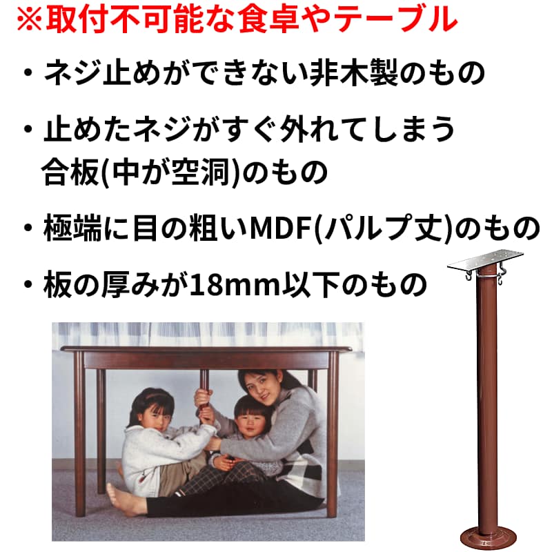 Tsukamarinbo brown 鋼鉄 ●取付可能テーブルの高さ:62~68cm ●カラー:ブラウン 茶色 ●重量:2.1kg ●材質:スチール ●用途・おすすめ:食卓用のテーブル耐震補強、地震対策を考えているご家庭、木造住宅や築年数が長い家に住む方、地震のリスクが高い地域にお住まいの方、子供や高齢者がいるご家庭、地震安全スペース ●製造:日本製 ●セット内容:本体、ビス10本、ハンガー2個、説明書 ◎内容:地震から身を守るために、食卓やテーブルの真下中央に取り付ける地震対策グッズです。この製品を使えば、テーブルが簡易的なシェルターに変わり、家族の安全を守ることができます。テーブルの中心に取り付けるため、邪魔になりにくい設計になっています。 地震が起きた時、私たちは反射的にテーブルの下に隠れます。しかし、そのテーブルが本当に安全と言えるでしょうか? 「つかまりん棒」は、そんな不安を解消するために開発されました。テーブルの中央下に簡単に取り付けるだけで、テーブルの強度が大幅に向上し、簡易的な防災シェルターとして利用することができます。 つかまりん棒を取り付けることで、地震の強い揺れでもテーブルが安定し、棒につかまることで体が外に飛び出すのを防ぎます。この製品を取り付けたテーブルは、最大4トンの圧力に耐えることができるほど頑丈です。 ハンガー付 フックに水や懐中電灯など、災害時に最低限必要なものをぶら下げておけば安心です。 照明として、つかまりん棒にLEDライトやランタンを取り付けると、暗い状況でも周囲を明るく照らすことができます。 高さ調節可能 取付可能なテーブルの高さは62~68cmです。 調整部により、床面にしっかりと固定することが可能です。 調整範囲は6cmです。 取り付け板のサイズは18cm×6cmと十分な安定性を提供します。 ※取付方法 つかまりん棒はテーブルの天板裏の中心に、付属のビスを止め、床面にピッタリ合うよう高さを調節します。 ※取付不可能な食卓やテーブル ネジ止めができない非木製のもの 止めたネジがすぐ外れてしまう合板(中が空洞)のもの 極端に目の粗いMDF(パルプ丈)のもの 板の厚みが18mm以下のもの |
