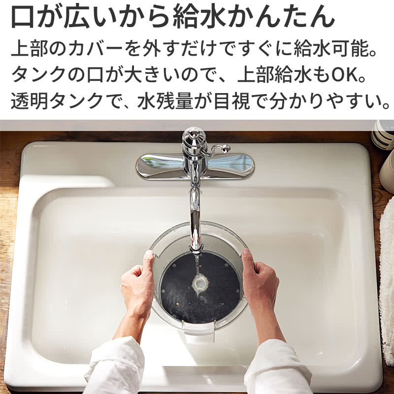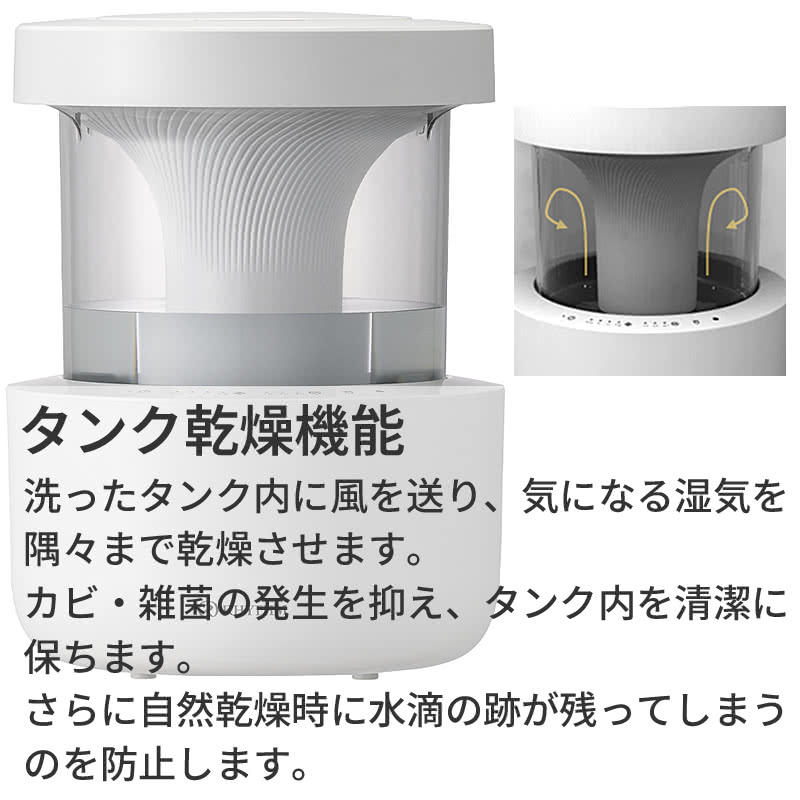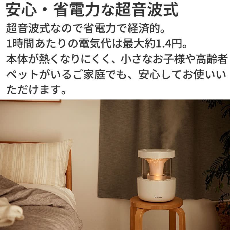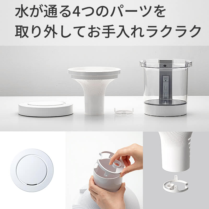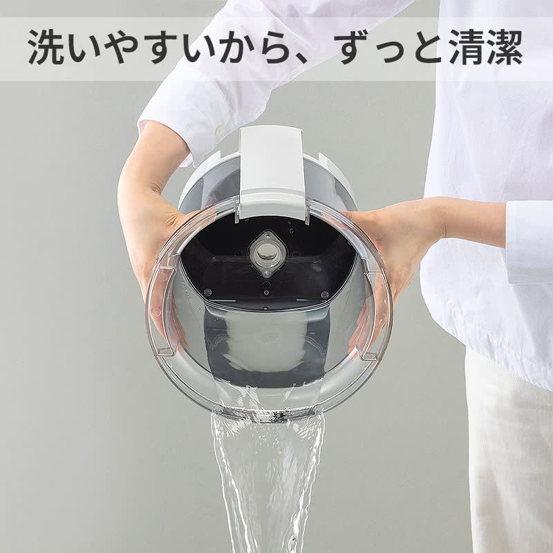 ![]() シンプルな佇まいと機能美 洗いやすい くつろぎの加湿器 MIST 350は、毎日「新鮮で清潔な水」を使用し、簡単なお手入れで清潔を保てる超音波式プールレス加湿器です。洗練されたデザインと優れた加湿性能で、快適な湿度を維持しつつ、インテリアにも馴染む一台です。 きめ細やかなミストで部屋全体を加湿 MIST 350は、約3.5マイクロメートルの超微細なミストを放出し、部屋の床や家具を濡らさずに加湿できます。これにより、リビングや寝室、オフィスでも快適な湿度を提供します。 ![]() ■快適な湿度を保つ技術 温湿度センサーで自動調節 搭載された温湿度センサーが、最適な湿度40~60%を自動で維持します。この範囲は、ウイルスやカビの繁殖を抑えるため、健康面でも安心です。 消費電力を抑えた省エネ設計 MIST 350は超音波式を採用し、1時間あたりの電気代が約1.4円(最大出力時)と経済的。エコで地球にも優しい仕様です。 幅広い用途に対応 広い空間を加湿。最大10畳の適用床面積で、リビングやベッドルーム、子供部屋など、さまざまな空間で活躍します。 加湿モードは4段階。(Auto・Hi・Low・Fog) 360度回転する吹き出し口 吹き出し口は水平方向に360度回転可能。部屋のどこに置いても効率的に加湿できます。 ![]() ■シルクのような霧とやわらかなあかり 雲海を再現するFogモード 「Fogモード」を使用すると、タンク内に雲海のような霧が広がります。この幻想的な演出は、リラックスタイムや来客時にもおすすめです。 心地よい暖色ライト タンク内を照らす暖色のライトは、部屋全体を優しい雰囲気に包み込みます。明るさは3段階で調節可能で、就寝時には自動減光機能も利用できます。 ![]() ■洗いやすさを徹底追求した設計 簡単に取り外せる4つのパーツ MIST 350は、水が触れる部分を4つのパーツに集約し、それぞれ簡単に取り外して洗える構造です。雑菌の繁殖を防ぎ、常に清潔なミストを保つことができます。 手軽に給水できる広口タンク 広口タンクを採用し、カバーを外すだけで簡単に給水可能です。タンクが透明なため、水の残量を一目で確認できるのも便利なポイントです。 タンク乾燥機能で清潔をキープ お手入れ後は「タンク乾燥機能」を使用するだけで、タンク内を効率よく乾燥。自然乾燥の際に発生しやすい水滴跡も防げます。 お手入れ方法:簡単ステップで清潔をキープ 1.電源を切り、タンクを取り外します。 タンク内の水を排水し、残った水を捨てます。 2.各パーツを水洗いします。 インナーカバーやブースターなど、タンクに触れる部分はすべて取り外して水道水で洗浄可能。柔らかい布で拭き取ります。 3.タンク乾燥機能を使用して乾燥。 洗った後は、タンクを本体に戻して乾燥機能を使用。1~8時間の乾燥時間が設定可能です。 ![]() 最大で約10時間の連続加湿が可能 一度の給水で長時間にわたって部屋の潤いをキープ。就寝中もしっかり加湿。乾燥しやすい冬場の睡眠時なども、湿度を気にせずに安眠できます。1・4・8時間に設定できる便利なOFFタイマー付。 デザイン性と機能性の両立 美しいフォルムと実用性を兼ね備えたデザインは、インテリアとしても高評価。 超音波式加湿器MIST 350は、洗いやすさと高い機能性を兼ね備えた理想的な加湿器です。乾燥が気になる季節に最適な湿度を提供し、リラックスできる空間を作り出します。シンプルで美しいデザインとお手入れのしやすさから、幅広いユーザーに愛されています。この冬、MIST 350で快適なくつろぎ時間を過ごしてみてはいかがでしょうか。 ![]() ■MIST 350が選ばれる理由:開発ストーリーと専門家の声 MIST 350は、「くらしのリズムを整える」というテーマのもと、開発されました。開発のきっかけは、既存の加湿器の「洗いにくさ」という課題に着目したことから始まります。毎日使うものだからこそ、清潔に保ちたい。その想いを形にするため、水の入れやすさ、洗いやすさ、使いやすさを徹底的に見直し、タンクだけで加湿できる「プールレス」という革新的な構造を実現しました。 また、MIST加湿器は、そのデザイン性と機能性から、数々の賞を受賞しています。 グッドデザイン賞 受賞 iF DESIGN AWARD 2023 受賞 JIDAデザインミュージアムセレクション vol.25 選定 さらに、各分野の専門家からも高い評価をいただいています。 家具・インテリアコーディネート ガイド 「優しい時間を演出してくれる、お部屋も心も潤う加湿器」 耳鼻科医 「温湿度センサーで雑菌繁殖しづらくお手入れも簡単。毎日きれいな水で加湿可能」 デジタル・家電 ガイド 「ゆらめく霧と暖かい光で部屋の雰囲気を演出してくれる超音波式加湿器」 |