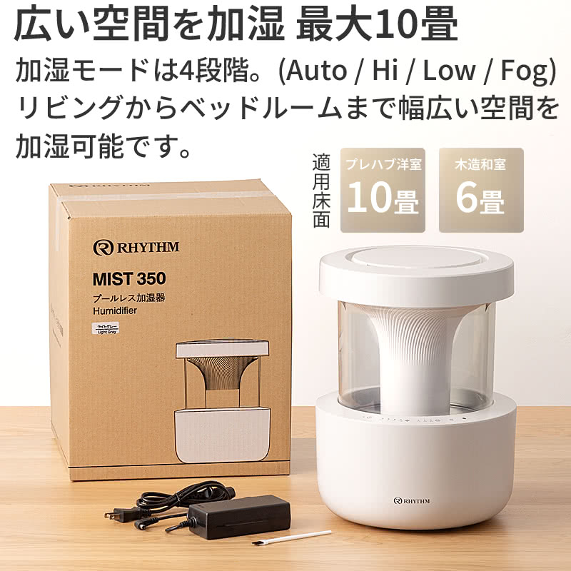 | ●アイヒーリング本店 公式 商品名:RHYTHM 超音波式プールレス加湿器 MIST 350 加湿器 手入れ楽 タンク乾燥機能付き ミスト カシツキ iHealing MIST350 加湿 ●型番:9YYA29RH 9YYA29RH08 ●カラー:08(ライトグレー) ●本体サイズ:高さ33.3×幅25.6×奥行25.6cm ●重さ:約3kg(AC電源アダプター含まず) ●電源:専用AC電源アダプター(付属)入力 AC100V 50/60Hz、出力 DC24V ●コード長:ACアダプター:1.5m、AC電源コード:1.0m ●加湿方式:超音波振動加湿方式(日本製デュアル圧電素子採用) ●運転モード: 4段階(Auto、Hi、Low、Fog) ●最大加湿量:Hi 約350~320ml/h、Low 約200ml/h、Fog 約28ml/h ●タンク容量:約2.2L(残水0.4L) ●最大連続加湿時間:Hi 約5.5時間、Low 約9時間、Fog 約64時間 ●消費電力:Hi 45W、Low 34W、Fog 21W ●適用床面積:木造和室 10m²(6畳)、プレハブ洋室 16m²(10畳) ●主な機能:温湿度センサーによる自動運転機能(Autoモード)、タンク乾燥機能、OFFタイマー(1・4・8時間) ●照明:LED(明るさ3段階切替+OFF 室内の明るさに応じた自動減光機能付き) ●販売店:アイヒーリング 正規販売店 ●用途・おすすめ:乾燥対策、風邪予防、リラックスタイム、リビング、寝室、子供部屋、オフィス、インテリア、ギフト、プレゼント、清潔な加湿を求める方、お手入れが簡単な加湿器を求める方、くつろぎの空間を演出したい方、静かで効率的な加湿を求める方 ●セット内容:本体、専用AC電源アダプター、ブースター、お掃除ブラシ、取扱説明書・保証書 ●保証期間:1年間 ●ご注意:モニター発色の具合により、実物と色合いが異なる場合があります。使用環境により加湿量・加湿時間は変動しますので目安としてご参考ください。 ◎内容:洗いやすくて、いつでも清潔。だから、快適。くつろぎの時間を、いつも清潔なミストで。 乾燥する季節に快適な湿度とくつろぎの時間を同時に叶える理想的な加湿器です。毎日「新鮮で綺麗な水」で加湿できるように、洗いやすさ、使いやすさを一から見直しました。プールレス構造を採用しているため、残水がなく、いつでも清潔な加湿を実現します。「水」が「霧」になり「湿度」に変化する一連の流れをあかりとともに演出し、パブリック空間を清潔に加湿する「MIST 350」でくつろぎの時間をお楽しみください。 ライトグレーはどんなインテリアにも調和しやすいニュートラルカラー。モダンなお部屋には品格を、ナチュラルな空間には優雅さをプラスします。目に見えない湿度の変化を、インテリアとしても感じられる美しいデザイン。まるで空間全体が新しい命を吹き込まれたような印象に。 控えめで柔らかな色彩は、北欧風のリビングにも、ミニマルな寝室にも完璧にフィット。部屋の雰囲気を壊さず、むしろ引き立てる存在です。お客様からも「インテリアとしても素晴らしい」「来客に褒められる」との声を多数いただいております。 忙しい日常の中でも、ほんの少しの潤いが心と体を整えるきっかけになる。そんな生活の「ちょっとした幸せ」をお届けする加湿器です。さらに、ギフトラッピングやメッセージカードの対応も可能ですので、大切な方への贈り物としても最適です。 ■MIST 350の魅力:清潔・快適・くつろぎ MIST 350は、単に部屋を加湿するだけでなく、使う人の心まで満たすような、様々な魅力を持っています。その中でも特に注目すべきは、以下の3点です。 洗いやすさから生まれる清潔さ 毎日使うものだからこそ、清潔さは最も重要な要素です。MIST 350は、水が通るすべてのパーツを簡単に取り外して洗える設計。しかも、洗うパーツはたったの4つ。従来の加湿器にありがちな、複雑な構造や洗いにくいパーツとは無縁です。さらに、新機能「タンク乾燥機能」により、洗い終わった後の乾燥も簡単。カビや雑菌の繁殖を抑え、いつでも清潔なミストで加湿できます。この洗いやすさこそが、MIST 350が提供する最大の「快適」なのです。 シルクのような霧と快適な湿度 超音波式により、シルクのようにきめ細かいミストを生成します。そのサイズは約3.5マイクロメートルと非常に微細で、床や家具を濡らしにくく、効率的に加湿します。また、温湿度センサーを搭載し、Autoモードで運転すれば、快適な湿度40~60%を自動でキープ。乾燥しがちな冬場はもちろん、ウイルスやカビの繁殖を抑えたい季節にも最適です。 やわらかなあかりと雲海Fogモードでくつろぎの時間を演出 MIST 350は、加湿だけでなく、くつろぎの空間を演出する機能も備えています。タンク内で灯る暖色のあかりは、インテリアのアクセントとしてお部屋を彩り、リラックス効果を高めます。さらに、Fog(フォグ)モードを選ぶと、タンク内に雲海のような霧が発生。ゆらめく霧とあたたかな光が織りなす幻想的な光景は、まさに癒しの空間を創出します。 洗いやすさ、快適な加湿、くつろぎの空間演出という、3つの要素を高次元で融合させた、まさに理想的な加湿器です。乾燥が気になる季節、MIST 350で、快適な湿度とくつろぎの時間をお過ごしください。 |