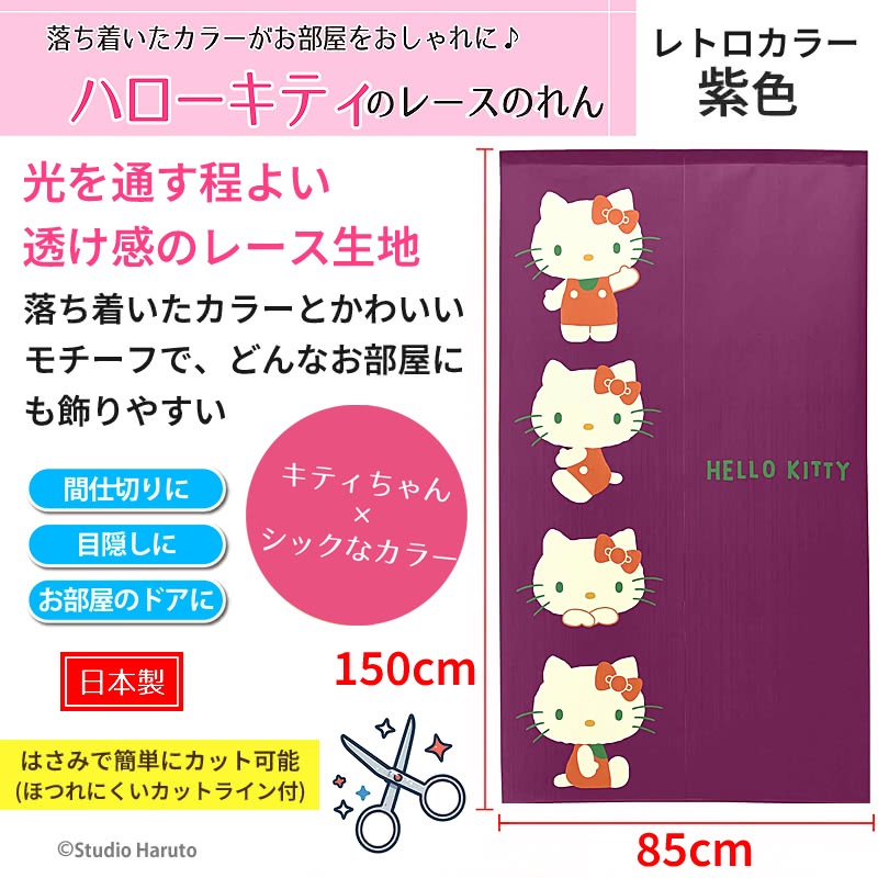 ハローキティのれん レトロカラー エンジ 85×150cm ロング かわいいキャラクター暖簾 光を通すレース生地 間仕切り C-00746 日本製