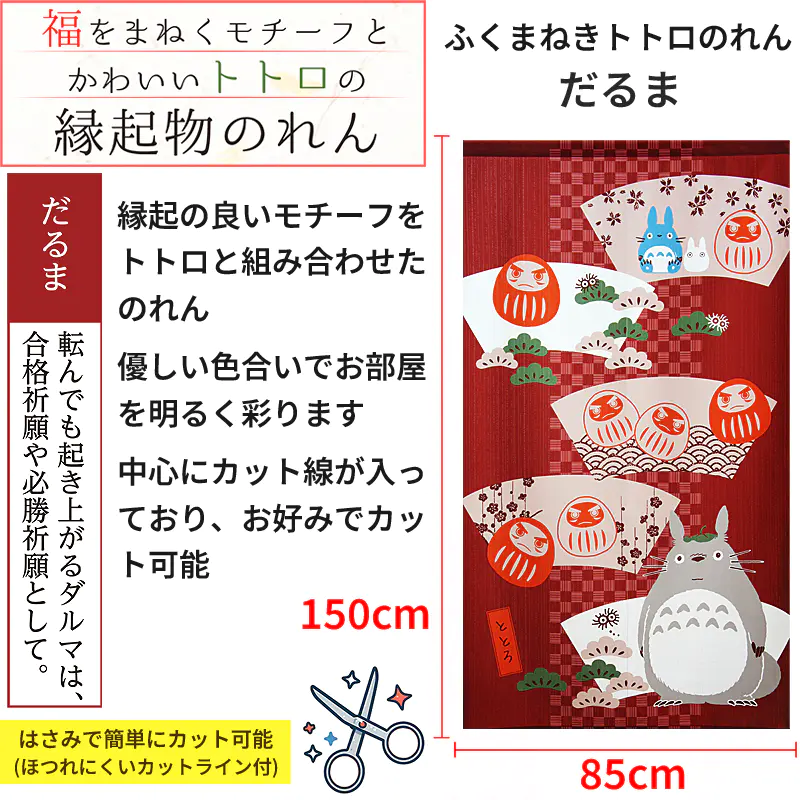 発送目安 : 2~3日で発送予定(土日祝除く)![]() ![]() ![]() ふくまねきトトロのれん こづち 85×150cm ロング 日本の伝統的な縁起物「だるま」のモチーフと、「となりのトトロ」の愛らしいキャラクターを組み合わせた、華やかな和風のれんです。赤を基調とした色合いが、お部屋や玄関、オフィスなどの空間を一気に活気づけ、見る人に前向きなエネルギーをもたらします。転んでも起き上がるだるまは「七転び八起き」の象徴として、合格祈願や必勝祈願など目標達成を願う方にぴったりです。トトロの優しい存在感が加わることで、和みと癒しの要素もプラスされています。 約幅85cm×丈150cmというロングタイプのサイズは、和室の間仕切りから玄関のインテリア、リビングのアクセントまで幅広く活用できます。中心にカット線が入っており、必要に応じて切り込みを入れれば、のれんとしての機能をより便利にお使いいただけます。切らずにタペストリーのように飾ることで、デザイン全体を存分に楽しむこともできます。プレゼントとして贈れば、相手の方の成功や幸福を願う気持ちを素直に伝えられる縁起の良い一枚です。 取り付け用のポールはのれん幅より2~3cmほど長めのものを選ぶと、開閉の際に生地が引っかかりにくく、美しいシルエットを保ちやすくなります。 赤が映えるデザインなので、玄関先や書斎など少し落ち着いた空間に取り付けると、よりいっそうだるまとトトロの存在感が際立ち、運気アップを実感できるでしょう。ぜひ、毎日の暮らしに前向きなエネルギーを与えてくれるのれんとしてご活用ください。 |