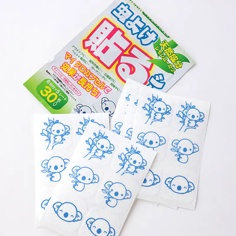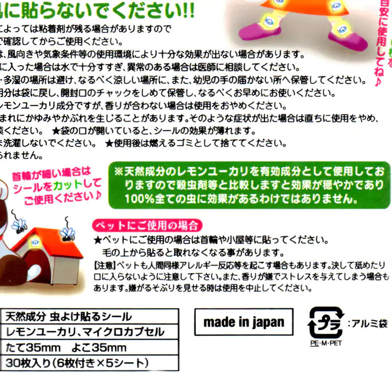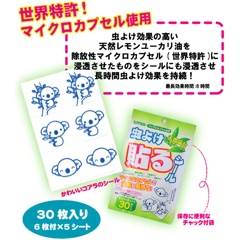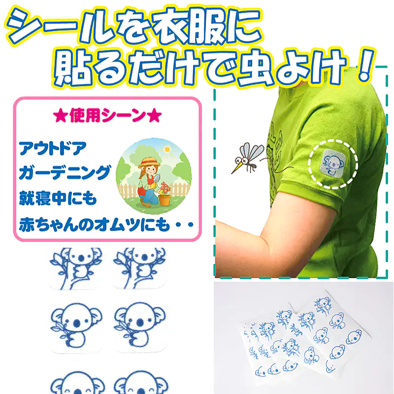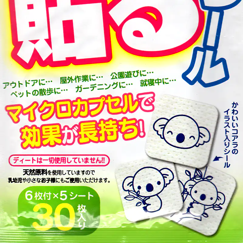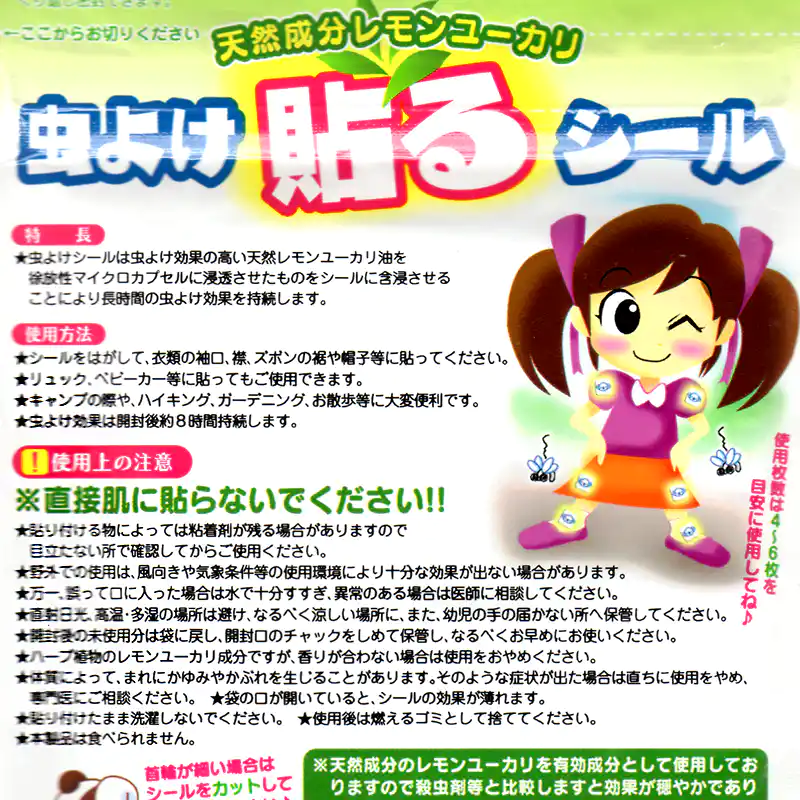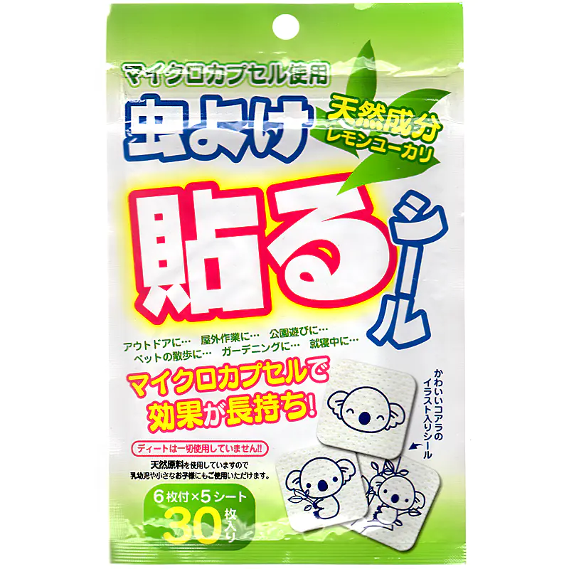 ![]() 貼るだけの簡単な虫よけ対策 夏の快適なひとときを、不快な虫に邪魔されたくない。そんな皆様におすすめするのが、この「虫よけ貼るシール」です。 本製品の核となるのは、世界特許を取得した「除放性マイクロカプセル技術」です。虫が嫌うことで知られる天然レモンユーカリ油を、目に見えない微細なカプセルに閉じ込めました。このカプセルが時間をかけて少しずつ成分を放出(除放)するため、約8時間という驚きの持続力を実現しています。 従来の虫よけスプレーのように、汗で流れたり、風で飛んで効果がすぐに薄れたりする心配はもうありません。衣服に一枚貼るだけで、有効成分が安定してあなただけのパーソナルなバリアを形成。活動的なお子様の外遊びから、本格的なアウトドア、集中したいガーデニングまで、あらゆるシーンでその真価を発揮します。 さらに、重要視されているのが安全性です。強い化学殺虫成分として知られる「ディート」を一切使用しておりません。自然由来の成分だからこそ、デリケートなお子様の肌の近くや、言葉を話せない大切なペットにも、ためらうことなくお使いいただけます。 手軽さと安全性、そして特許技術に裏付けされた確かな効果。これらすべてを両立させた本製品で、ご家族皆様の夏を、より健やかで快適なものにしてください。 使用上の注意 ※直接肌に貼らないでください。 使用枚数は4~6枚を目安にしてください 貼り付ける物によっては粘着剤が残る場合がありますので目立たない所で確認してからご使用ください。 野外での使用は、風向きや気象条件等の使用環境により十分な効果が出ない場合があります。 万一、誤って口に入った場合は水で十分すすぎ、異常のある場合は医師に相談してください。 直射日光、高温·多湿の場所は避け、なるべく涼しい場所に、また、幼児の手の届かない所へ保管してください。 開封後の未使用分は袋に戻し、開封口のチャックを閉めて保管し、なるべくお早めにお使いください。 ハーブ植物のレモンユーカリ成分ですが、香りが合わない場合は使用をおやめください。 体質によって、まれにかゆみやかぶれを生じることがあります。そのような症状が出た場合は直ちに使用をやめ、専門医にご相談ください。 袋の口が開いていると、シールの効果が薄れます。 貼り付けたまま洗濯しないでください。 使用後は燃えるゴミとして捨ててください。 本製品は食べられません。 |