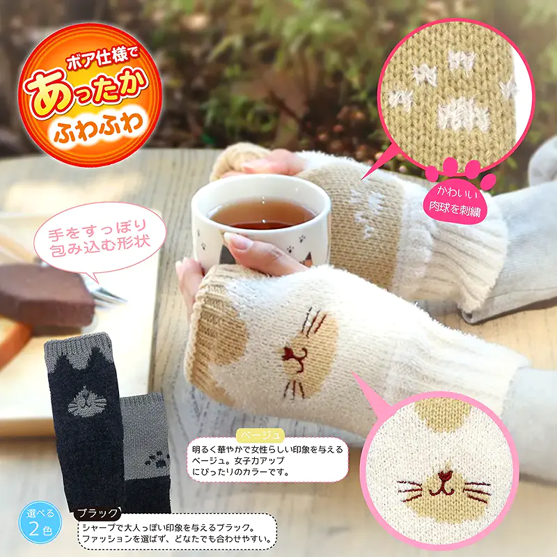 猫 ハンドウォーマー アームウォーマー レディース ねこ ボア あったか 指なし スマホ対応 ふわふわ かわいい ベージュ