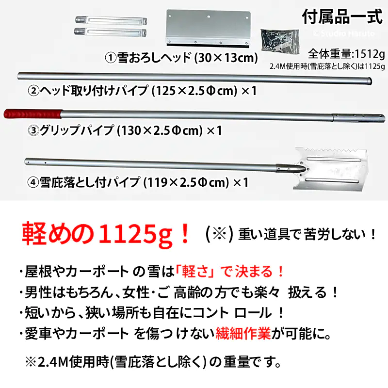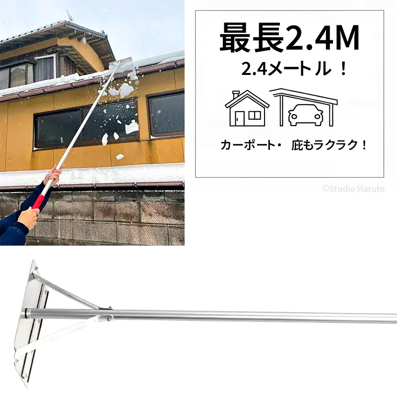 発送目安 : 2~5日で発送予定(土日祝除く)![]() ![]() いらっしゃいませ! ECサイトiHealingへ 本日はご来店いただき、誠にありがとうございます。 冬の雪対策、本当に大変ですよね…。 当店は2010年から雪下ろし用品を取り扱い、今年で販売実績15年を迎えます。 長年にわたり、お客様の「安全でラクな雪対策」を応援してまいりました。 こちらのページは、カーポートや1階の屋根など、「高さの低い場所」の雪下ろしに特化した「2.4Mタイプ」のご紹介です。6Mタイプと並んで、こちらも本当に使いやすいんですよ。 解説「雪下ろし2.4M 雪庇落とし付 KC-6713」の利点 雪下ろしと聞くと、つい高所の屋根ばかりを想像しがちですが、実は「高さの低い場所」の除雪にも特有の難しさと危険が潜んでいます。カーポートの屋根、1階の庇(ひさし)、あるいはビニールハウス。これらは積雪の重みに耐えられず、突然倒壊するリスクを常に抱えています。 私たちiHealingは、販売実績15年(2010年より)の経験から、こうした「低い場所」専用のツールが不可欠であると確信しています。 ■ 低い屋根専用 なぜ「2.4M」と「軽さ」が重要なのか? カーポートや1階の庇(ひさし)での除雪作業は、単に雪を下ろすだけではありません。2階の屋根とは全く異なる難しさがあります。それは「障害物との近さ」です。 ご自宅の壁、柱、家屋、そして何より大切な愛車。こうした障害物に囲まれた狭いスペースで、安全に雪だけを下ろすには、長さよりも「精密なコントロール」が求められます。 この「雪下ろし2.4Mセット」の最大の特長は、約1125g(雪庇落とし除く)という圧倒的な軽量性にあります。あえて中間パイプを排し、取り回しの良さを追求しました。この軽さが、振り回しやすさ=作業のしやすさに直結します。重い道具では、腕がすぐに疲労し、かえってカーポートや家屋を傷つける原因にもなりかねません。 ■ 「振り回しが楽」=「繊細なコントロール」が可能 「振り回しが楽」とは、単に「腕が疲れにくい」という意味だけではありません。 それは、雪を「押す」だけでなく、手前に「引く」、左右に「掃う(はらう)」、ヘッドの角度を「細かく調整する」といった、対象物との距離が近い作業で求められる「繊細なコントロール」を可能にすることを意味します。 重く長い道具では、疲労で操作が雑になり、かえって壁や車を傷つける原因になりかねません。この2.4Mモデルなら、雪が重くなる前にスピーディーかつ正確に作業を完了でき、結果としてカーポートなど構造物への負担も最小限に抑えられます。 ![]() ■ 低い場所にも潜む「雪庇」の危険 低い屋根であっても、せり出した雪庇(せっぴ)は形成されます。カーポートから張り出した雪庇が、車の乗り降りの際に突然落下すれば、事故につながります。本製品はコンパクトながらも専用の「雪庇落とし」を標準装備。危険な雪庇を安全に処理する機能を備えており、まさに「低い場所のオールインワン・ソリューション」と呼ぶにふさわしいセットです。 手軽に、素早く、そして安全に。ご自宅の大切なカーポートや庇を守るため設計された、この軽量雪下ろしセットは、冬の常備品として最適な選択です。 ![]() ![]() ■雪下ろし作業のワンポイント・アドバイス 安全に作業するために、当店からいくつかのアドバイスです。 1. 作業は2人以上で:万が一の事故に備え、必ず2人以上で行い、周囲の安全確認や声がけを徹底してください。 2. 落雪場所に注意:作業を始める前に、雪を落とす場所に人や障害物がないか必ず確認しましょう。特に、カーポート下の車や通路には十分注意してください。 3. 無理な体勢は禁物:軽量で扱いやすいですが、無理に手を伸ばしたり、不安定な足場で作業したりするのは絶対に避けてください。 4. こまめな除雪を:雪は積もれば積もるほど重く、硬くなります。重労働になる前、雪が軽いうちにこまめに下ろすのが、体力的にも道具的にも負担を減らす最大のコツです。 5. 電線に注意:道具が触れる高さに電線や電話線がないか、作業前に必ず確認してください。 ■雪下ろし 6Mと2.4M 2つの商品の違いについて 「6Mと2.4M、どちらを選べばいいの?」というお客様のために、2つの違いを詳しくご説明しますね。 この2つの商品の違いは、ズバリ「作業したい場所の高さ」と「作業の本格度」にあります。 【雪下ろし 2.4Mタイプ (KC-6713)】 (このページの商品) ・中間パイプを無くし、「軽さ(約1125g※)」と「取り回しの良さ」に特化しています。(※雪庇落とし除く) ・主なターゲットは、カーポートや1階の屋根、庇(ひさし)、ビニールハウスなど、「高さの低い場所」です。 ・これらの場所は6Mも必要ない反面、柱や壁、車などに道具を当てないよう、小回りが利く方が断然作業しやすいです。 ・「カーポートや1階の庇の雪を手軽に下ろしたい」という方には、こちらの「軽量・特化モデル」が最適です。 【雪下ろし 6Mタイプ (KC-6706)】 (別売) ・なんといっても「最長6メートル」