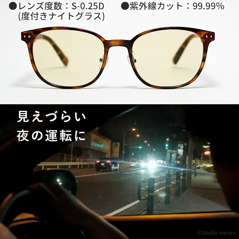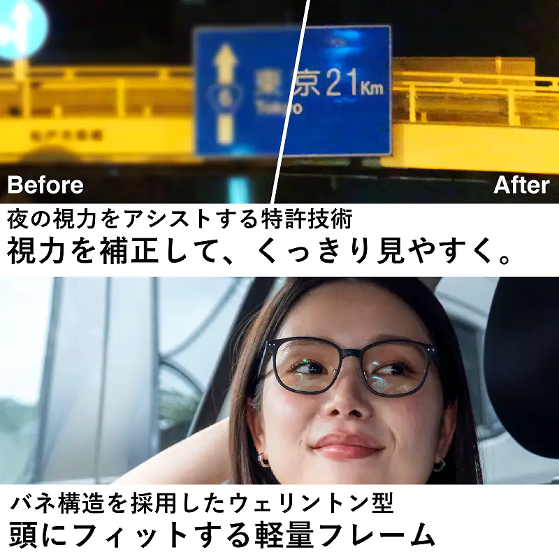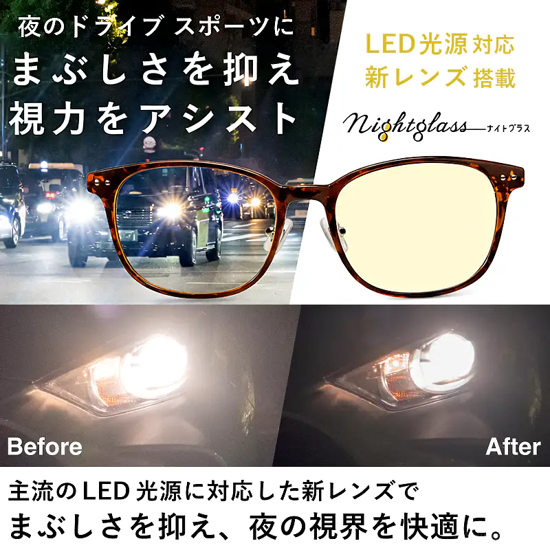 発送目安 : 2~3日で発送予定(土日祝除く)| 光学メーカーが本気で作った夜間運転専用グラス ナイトグラス LED スマート ブラウンデミ 女性ドライバー、おしゃれに気を使う方、夜活(ウォーキング・ライブ)を楽しみたい方、ギフト需要 ![]() ![]() 夜のドライブも、おしゃれに、安全に。 「見えやすさ」と「可愛さ」を両立した、夜専用のアイウェア。 ![]() ![]() ![]() ■夜のお出かけ、もっと楽しく快適に。 「夜の運転は怖くて苦手...」「ライブやスポーツ観戦で照明が眩しい...」 そんなお悩みを持つ方に選ばれているのが、この「ナイトグラス LED」です。 目に刺さるようなLEDライトの光や、雨の日の路面反射を優しくカット。 特許取得(第6413062号)のレンズが視界をくっきりクリアにし、夜の世界を鮮やかに映し出します。 ■肌馴染みの良い「ブラウンデミ」カラー 機能だけで選ぶメガネはもう卒業。 トレンドのべっ甲柄(ブラウンデミ)は、ブラックよりも柔らかい印象を与え、お顔周りを華やかに演出します。 女性はもちろん、少し抜け感のあるスタイルを楽しみたい男性にもおすすめのカラーです。 ■「夜活」や「推し活」の相棒にも 夜のウォーキングや犬の散歩でも、自転車のハイビームは強敵です。 ナイトグラスがあれば、眩しさを抑えて安全を確保できるだけでなく、紫外線も99.9%カット。 約23gと軽量なので、ランニングなどのスポーツシーンでも邪魔になりません。さらに、ライブやコンサートでのスポットライト対策としても密かなブームになっています 。 ![]() ![]() ![]() ![]() NIGHT SCENE 夜間ドライブ以外のナイトシーンで活躍 さまざまなナイトシーンで活躍。 夜間の屋外イベント。 スポーツ観戦。 野外コンサート。 夜間の散歩・ジョギング。 夜勤・深夜作業。 AND MORE その他の活用 夜間以外も使用できる。 曇天や雨天など、視界が暗く感じる状況。 LED照明下での作業。 室内での細かい作業。 補足情報 青色光を効果的にカットする淡いイエローカラーのレンズ設計。 UVカット機能付き。 一般医療機器として届出済み。 ナイトグラスLEDが夜のドライブだけでなく、幅広いシーンで視界補助として活用できます。 ナイトランや薄暮(はくぼ)の時間など、視界が悪く光が散乱しやすい雨の日などにも効果的です。 ■ナイトグラス LED ブラウンデミ FAQ(よくあるご質問) Q. 普通のサングラスとの違いは? A. 最大の違いは「明るさ」です。一般的なサングラスは視界全体が暗くなりがちですが、ナイトグラスLEDは眩しい光だけをカットし、明るい光を通すため、夜でも視界がクリアです。これにより、夜間の運転やスポーツも安全に行えます。 Q. 女性でもサイズは大きくないですか? A. 男女兼用のサイズ感ですが、バネ構造のフレームが優しく頭にフィットするため、女性の方でもズレにくく快適にご着用いただけます。 Q. ライブやスポーツ観戦でも使えますか? A. とてもおすすめです!ステージのスポットライトやスタジアムの強い照明(LED)の眩しさを抑えることで、光の散乱を防ぎ、推しの表情や選手のプレーがくっきりと見えやすくなります。 Q. 効果がわかるのは運転中だけですか? A. いいえ、様々なシーンで効果を実感いただけます。夜間のウォーキング(夜活)では、街灯や自転車ライトの眩しさを軽減します。また、雨の日や曇りの日など、視界が悪く光が散乱しやすい状況でも見やすさを発揮します。 Q. レンズの色は濃いですか? A. 薄いイエロー系のレンズカラーです。相手から目元が見える程度の濃さなので、夜間にかけていても「怪しいサングラス」のような印象を与えず、自然にファッションに馴染みます。 Q. 視力アシスト機能とは何ですか? A. 特許第6413062号を取得した独自の技術です。夜間に瞳孔が開いて低下してしまう視力をレンズで補正・アシストし、遠くの景色をクリアに見せる機能です。 Q. 昼間も使えますか? A. はい、可能です。UVカット率は99.9%以上ですので、日中の紫外線対策としても優秀です。 使用上のご注意 ・衝撃にご注意ください。 ・太陽や強い光を直視しないでください。 ・運転、操縦や階段の上り下りなどはメガネに慣れてから行ってください。 ・キズついたレンズは使用しないでください。 ・プラスチックレンズは熱にご注意ください。(60℃以上) ・レンズのくもりにご注意ください。 ・レンズ保管時は、そのままの状態で太陽光の当たる場所に置かないでください。 ![]() 持ち運びに便利な薄型ソフトケース付 持ち運びやすい薄型のソフトケースをお付けします。コンパクトに収納できるので、胸ポケットにも負担なく収まります。片手で簡単に開閉可能です。 ![]() 選べる2TYPE 「ナイトグラスLED」は「スマート」と、 普段のメガネにクリップオンでかけられる 「クリアジャケット」の2タイプをご用意。 ![]() ■ナイトグラスLEDの特徴と利点 ポイント1:まぶしさを抑えて明るさを確保 快適な視界を保ちつつ、光の刺激を軽減する設計。 ポイント2:夜間に低下すると言われる視力を補助 
