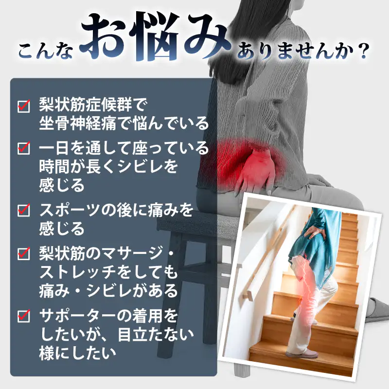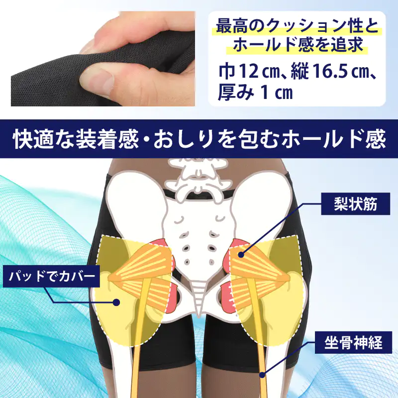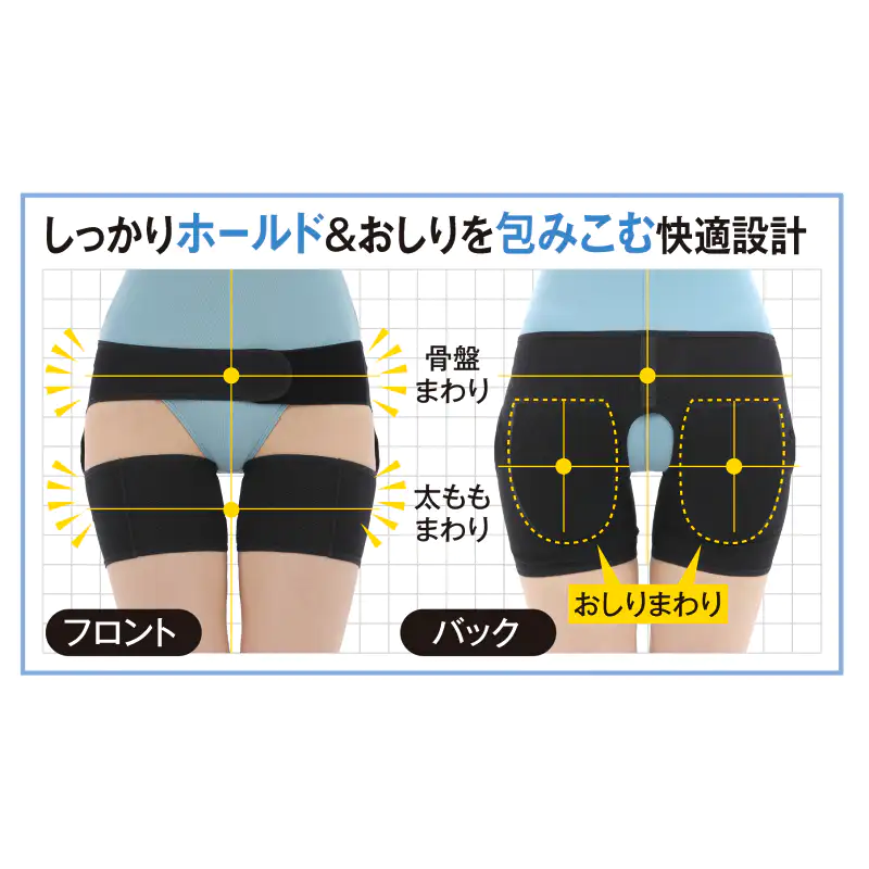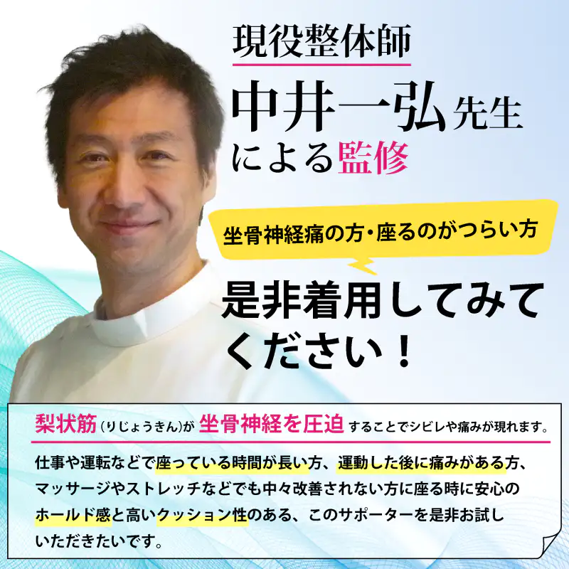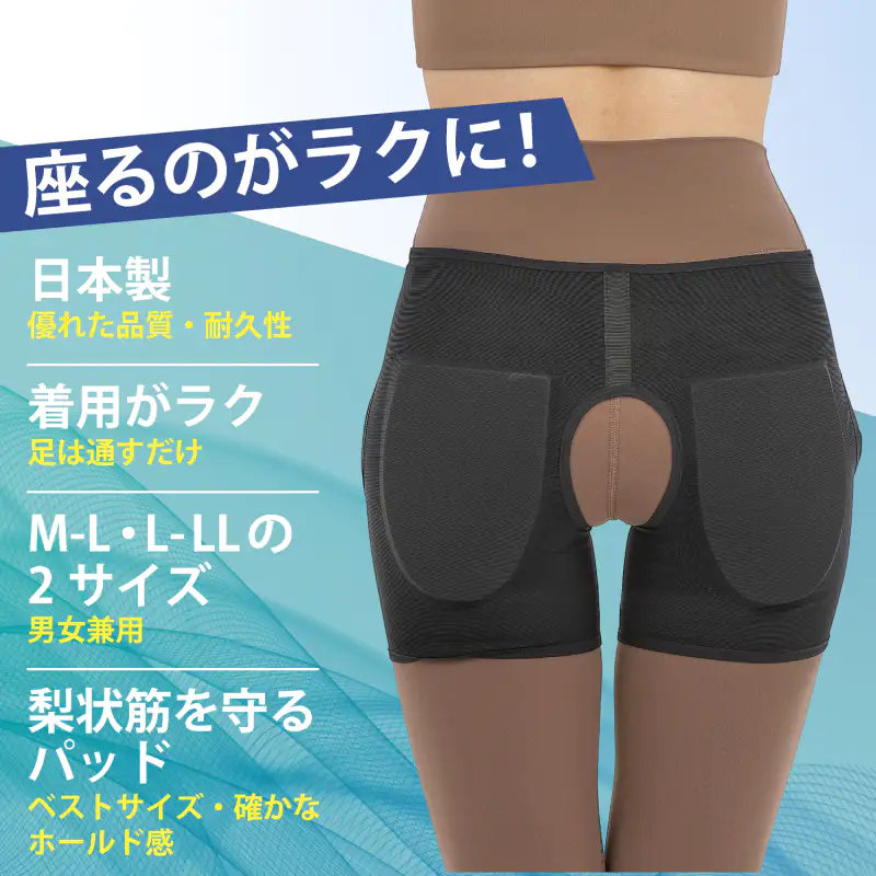 発送目安 : 2~3日で発送予定(土日祝除く)![]() 座るのが怖い…そんな毎日から、あなたを解放します 「デスクワークが続くと、お尻から太ももにかけて違和感がある」 「長時間のドライブ、立ち上がった時のあのつらさ」 「やせ型で、固い椅子に座ると骨が当たってつらい」 そんな「座ることへの不安」、もう我慢しないでください。 現役整体師・中井一弘先生の監修のもと誕生したのが、この「坐骨新ケアサポーター」です。 ![]() ![]() ■お尻のつらさ…その原因に物理的アプローチ 多くの場合、お尻の奥にある「梨状筋」やその下を通る「坐骨神経」周りに体重の圧迫が加わることで、不快な違和感が引き起こされます。 このサポーターの最大の秘密は、左右に配置された厚み1cmの「ラク圧パッド」。肉厚で弾力のある特殊パッドがお尻をしっかりとカバーし、座った時の衝撃を物理的に吸収します。自重による体圧を分散させることで、気になるお尻周りへの負担をやさしく和らげます。 それはまさに、「自分専用の低反発クッションを身に着けている」ような安心感です。 ![]() ■「見せないケア」で、どんなシーンでも快適に 「サポーターは大げさで恥ずかしい…」そんな心配はご無用です。 衣服の下に着用するインナータイプで、アウターに響きにくい設計を採用。タイトなジーンズやスラックスの下でも目立ちません。 さらに、ベースとなる生地には通気性に優れた薄手のメッシュ素材を使用しているため、長時間着用してもムレにくく、一年中快適にお使いいただけます。 ![]() ■骨盤とお尻を包み込む しっかりホールド設計 着用はとても簡単。ショーツのように足を通し、前面の面テープで骨盤周りと太もも周りを調整するだけ。ご自身の体型に合わせて心地よいフィット感を作れます。お尻全体を立体的に包み込むことで、座り姿勢も自然と安定し、腰回りへの負担も軽減します。 確かな品質と耐久性を誇る「日本製」。 ご自宅で、オフィスで、車の中で。もう座る場所を選びません。 毎日の暮らしに「座る安心」をプラスします。 |