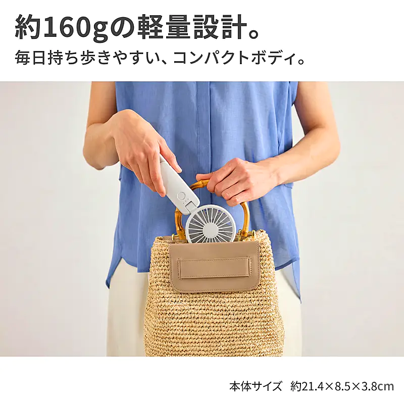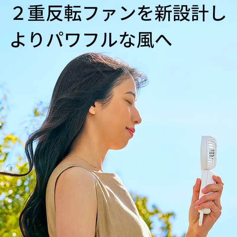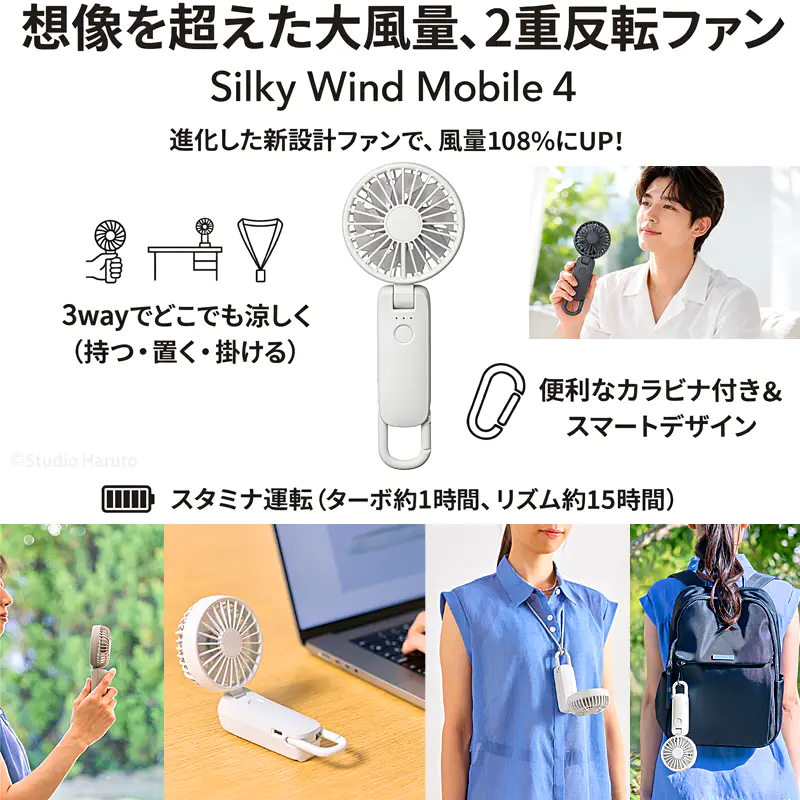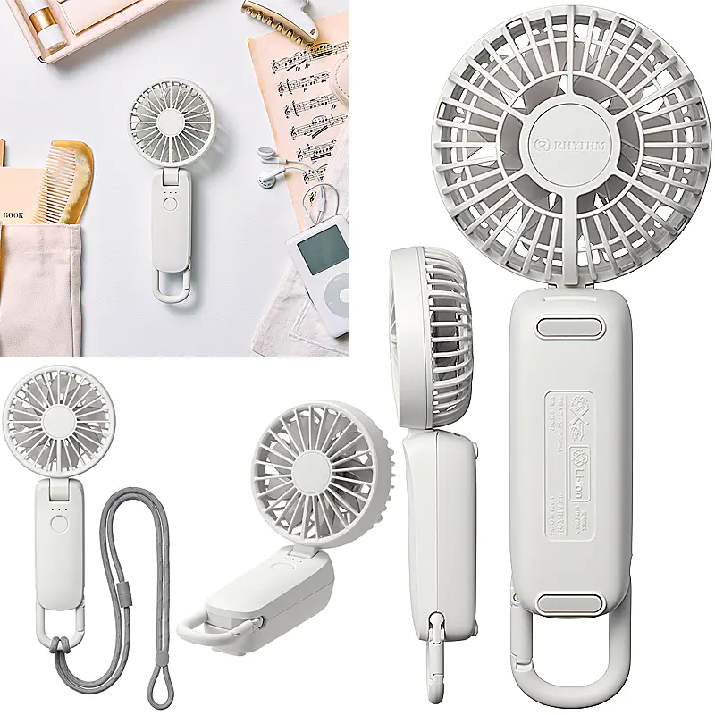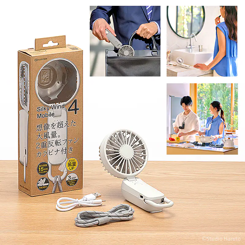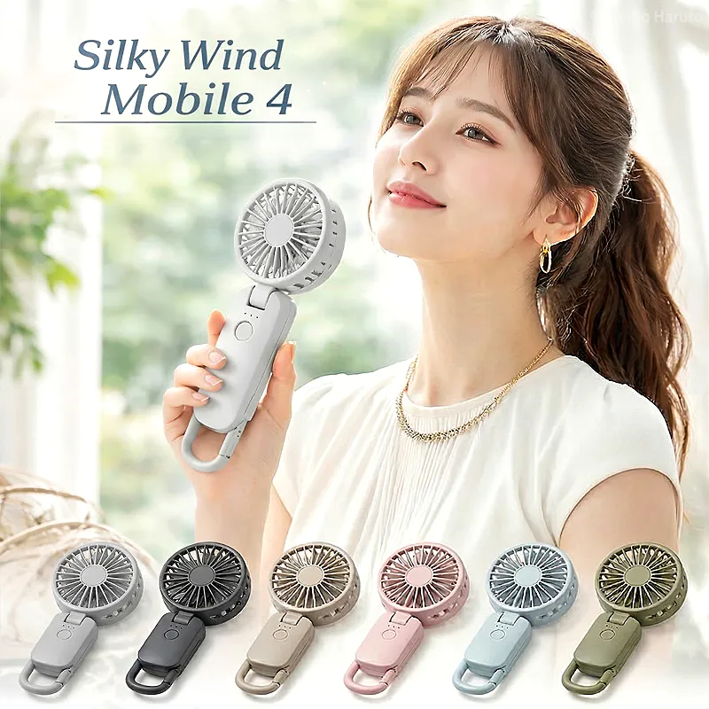 ![]() ![]() ■Silky Wind Mobile 4の真価 皆様、今年の夏の暑さ対策は万全でしょうか? 数ある携帯扇風機の中で、私たちスタッフが自信を持ってこの「Silky Wind Mobile 4」をおすすめするのには、確固たる理由があります。それは、時計メーカーとして精密なモノづくりを追求してきた「RHYTHM(リズム)」だからこそ実現できた、圧倒的な『風の質』と『計算し尽くされた機能美』です。 「2重反転ファン」が生み出す、想像を超える風 一般的なハンディファンとは異なり、この扇風機には前後に2つの羽根(前9枚/後7枚)が搭載されています。後ろの羽根で周りの空気をたっぷりと集め、前の羽根で筒状の強力な風にして前方に押し出す。この独自の仕組みにより、コンパクトなボディからは想像もつかないほどの大風量を実現しています。 さらに今回のモデルでは、ただ強いだけでなく「顔全体を包み込むような広い風」へと進化しました。真夏の屋外でも、まるで木陰を吹き抜ける涼風のような心地よさを体感していただけます。 くらしに「なじむ」洗練されたスマートデザイン どんなに機能が優れていても、持ち歩く扇風機はデザインも重要ですよね。本モデルは、グリルの厚みを極限まで薄くし、余分な凹凸を削ぎ落としました。本体を折りたたんだ際の段差も少なくなり、小さなバッグのポケットにもスッと収まります。 正面から裏面へと続く持ち手の「素直な面のつながり」は、手にした瞬間にしっくりと馴染む心地よさがあります。主張しすぎず、それでいて上質な存在感を放つ。まさに大人のためのスマートなハンディファンです。 ![]() 暑い日にうれしい、実用性の高さ 風量は5段階で切り替え可能。そよ風のようなリズム風から、しっかり涼しいターボまで、その日の暑さや場所に応じて選べます。ターボ運転は約1時間、リズム風なら約15時間の連続使用が可能。さらに、充電時間は約5時間へ短縮され、従来品より約1時間早く充電できます。外出前に備えやすく、日々の使い勝手までしっかり考えられているのがうれしいポイントです。 ![]() 3wayだから、暮らしの流れを止めない 朝の通勤では手持ちでさっと涼しく。移動中や屋外イベントではネックストラップでハンズフリーに。オフィスや自宅では卓上に置いてデスクファンとして。Silky Wind Mobile 4は、持つ・置く・掛けるの3wayで、使う場所やシーンに合わせて自然に寄り添います。ファン部の角度調整機能も備えているので、欲しいところへ風を送りやすく、近くでも離してでも快適に使いやすい設計です。 軽い、頼れる、持ち歩きやすい 本体は約160gの軽量設計。バッグに入れても負担になりにくく、カラビナ付きだから引っ掛けて持ち運ぶこともできます。取り出す、使う、しまう、その一連の動作まで軽やか。毎日使うものだからこそ、こうした“ちょっとした扱いやすさ”が、実は大きな満足感につながります。 ![]() ■7色から選べる、自分らしい1台 カラーはライトグレー、ミディアムグレー、ダークグレー、グレーベージュ、ピンク、ブルー、グリーンの7色展開。ベーシックにまとめたい方にも、やさしいニュアンスカラーを楽しみたい方にも選びやすいラインアップです。家族で色違いにしたり、服装や持ち物に合わせて選んだり、毎日持ち歩くアイテムだからこそ、好きな色を選べる楽しさも魅力です。 ライトグレー 清潔感があり、どんなファッションにも合わせやすい定番カラー 明るく軽やかな印象で、通勤・通学からオフィス使いまで幅広く選びやすい1色です。すっきりとした見た目で、迷ったらまず候補に入れたい万能カラーです。 ミディアムグレー 落ち着きとやさしさのバランスがちょうどいい上品カラー。 ライトすぎずダークすぎない中間色で、シンプル派にもニュアンスカラー派にも取り入れやすい印象です。日常になじみやすく、飽きずに長く使いやすい雰囲気があります。 ダークグレー 引き締まった印象で、スマートに持ちたい方におすすめ。 落ち着いた色味で、シックなバッグや小物とも相性がよく、機能的な印象をすっきり見せてくれます。男女問わず選びやすいスタイリッシュなカラーです。 グレーベージュ やわらかく上品なニュアンスが魅力の、今っぽいカラー ナチュラルな雰囲気があり、やさしい印象で持ちたい方にぴったりです。落ち着いているのに地味すぎず、服や日傘、小物とも合わせやすい色合いとして訴求しやすい1色です。 ピンク やわらかく華やかな印象で、持つだけで気分が明るくなるカラー かわいらしさがありながら、やさしいトーンなら大人の方にも取り入れやすい雰囲気を演出できます。毎日の持ち物に少し彩りを加えたい方におすすめです。 ブルー 見た目にも涼しげで、夏らしさを感じられる爽やかカラー。 すっきりとした印象で、暑い季節のアイテムとして相性の良い色味です。清涼感を重視したい方や、さっぱりした雰囲気を好む方におすすめしやすいカラーです。 グリーン 自然体で心地よい印