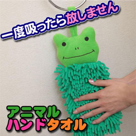 ●商品名:アニマルハンドタオル ●サイズ・重量(約):14cm×35cm×3.5cm 105g ●【材質】モップ・本体生地:ポリエステル 生産:中国 ◎内容:一度吸ったら放しません!かわいい動物のお手拭タオル。タオルリングなどに吊るしてお使い頂け、洗面所や台所など使う場所を選びません。取り付け部分の裏側は取外しの出来るボタン式なのでリングにもバーにも簡単に取り付けできます。 |